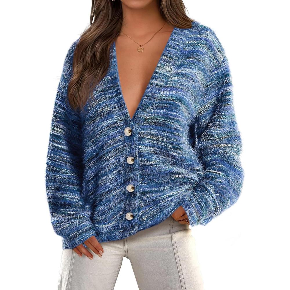 PRETTYGARDEN Womens Cardigan Sweaters Fall Fashion 2025 Striped Long Sleeve Button V Neck Knit Fuzzy Outerwear Winter Clothes(Blue)