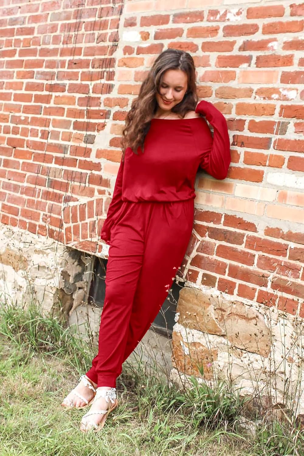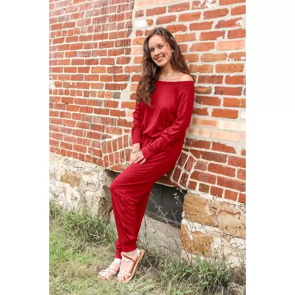 imagePRETTYGARDEN Womens Casual Long Sleeve Jumpsuit Crewneck One Off Shoulder Elastic Waist Stretchy RomperWine Red