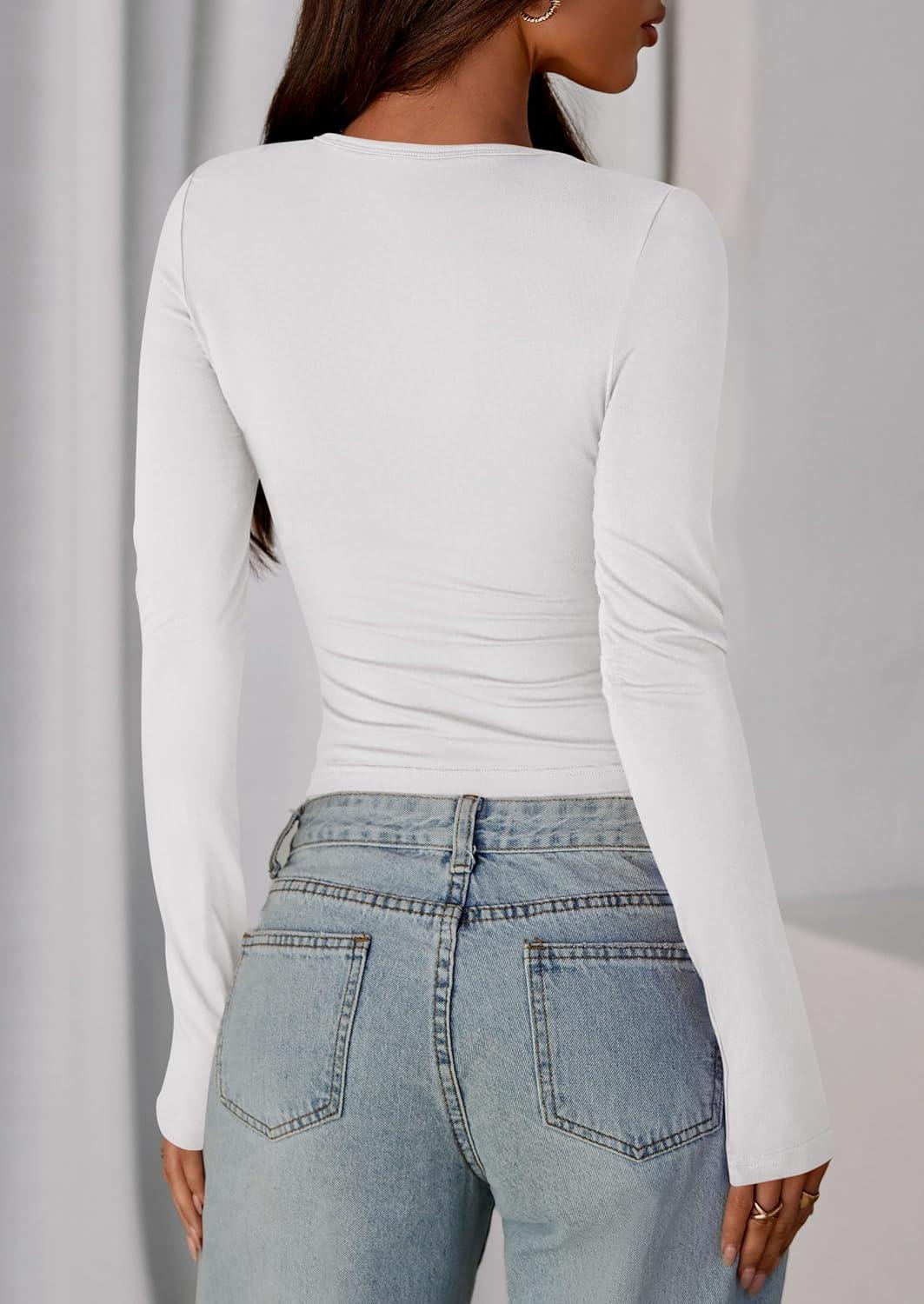 PRETTYGARDEN Womens Casual Long Sleeve Tops 2025 Fall Crew Neck Fitted Henley Shirts Basic Tee Blouse Knit Going Out Outfits(White)