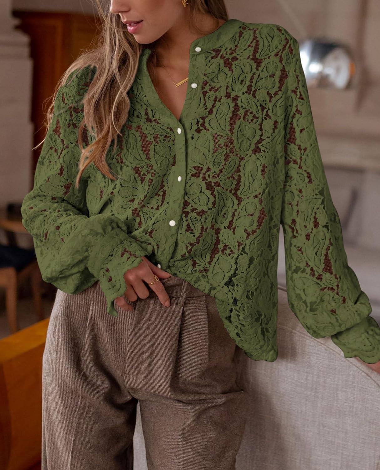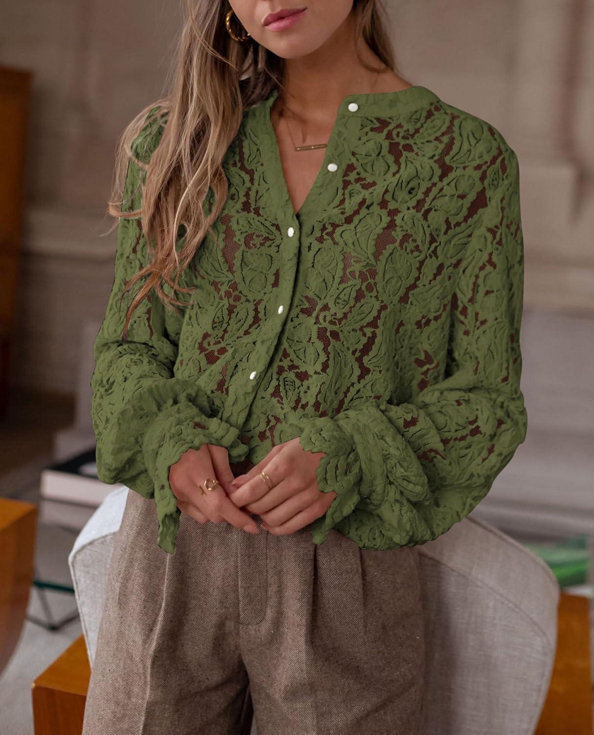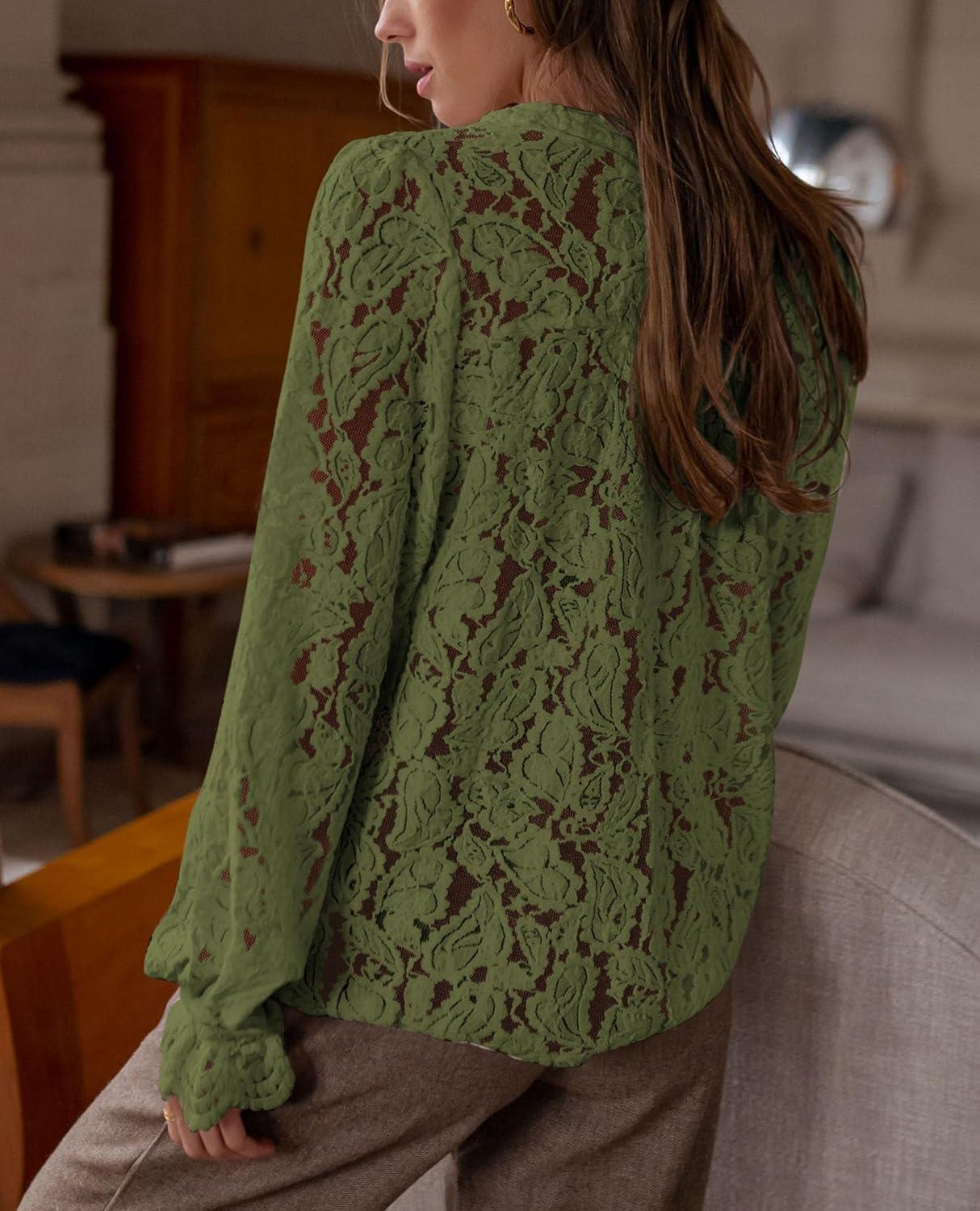 PRETTYGARDEN Women’s Dressy Casual Lace Blouse Long Sleeve Button Up Shirts Tops Spring Fall Fashion Clothes(Army Green)