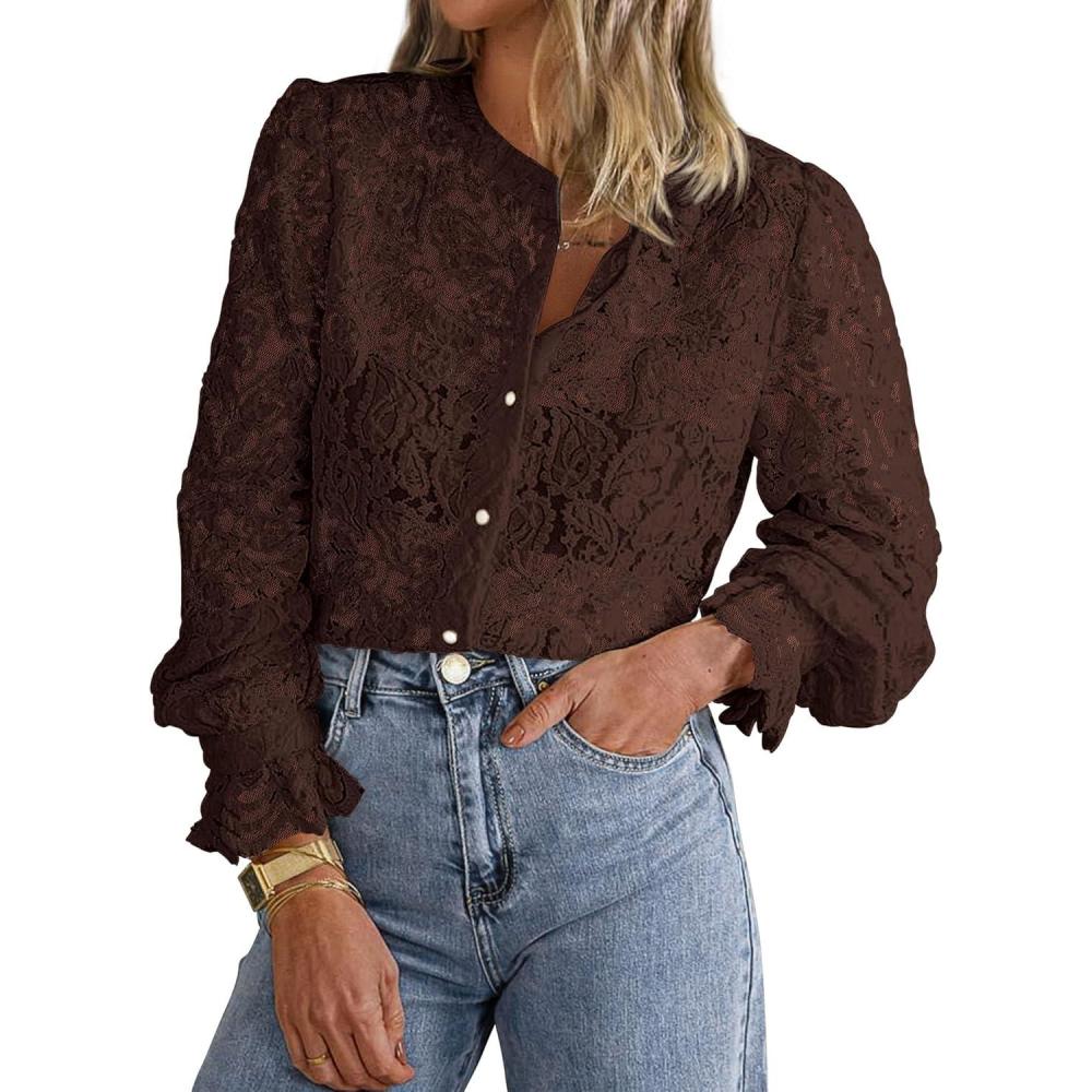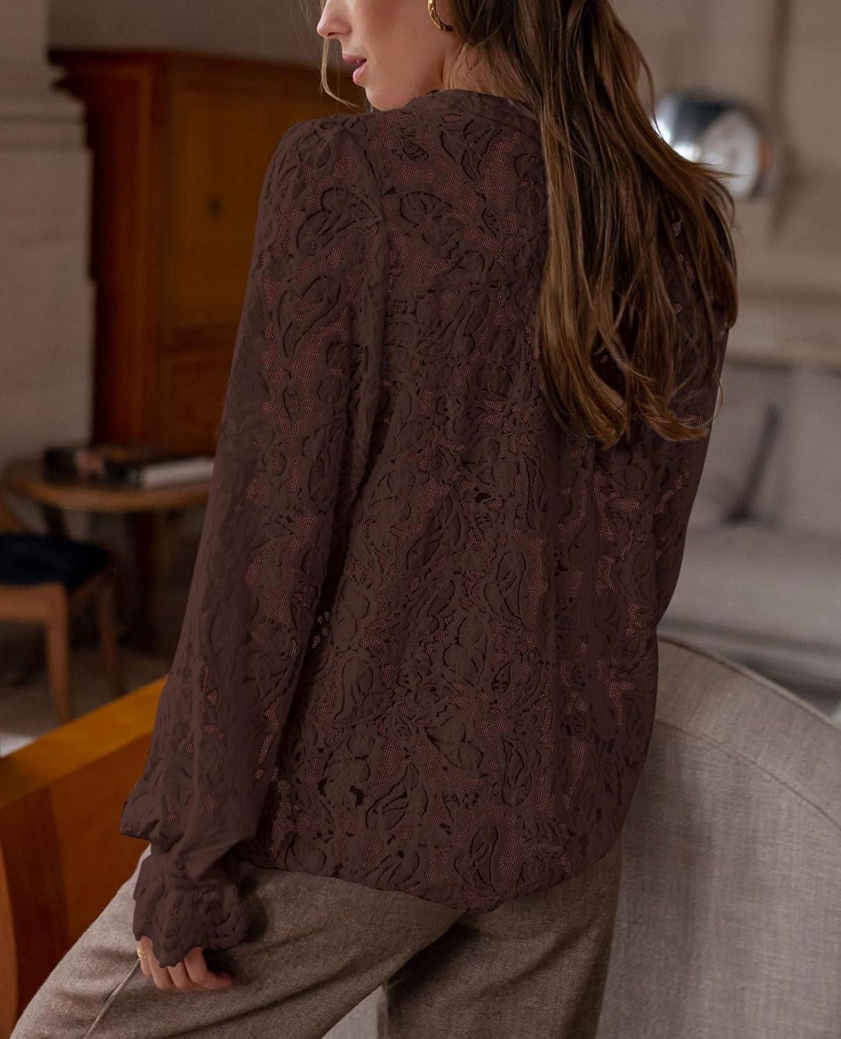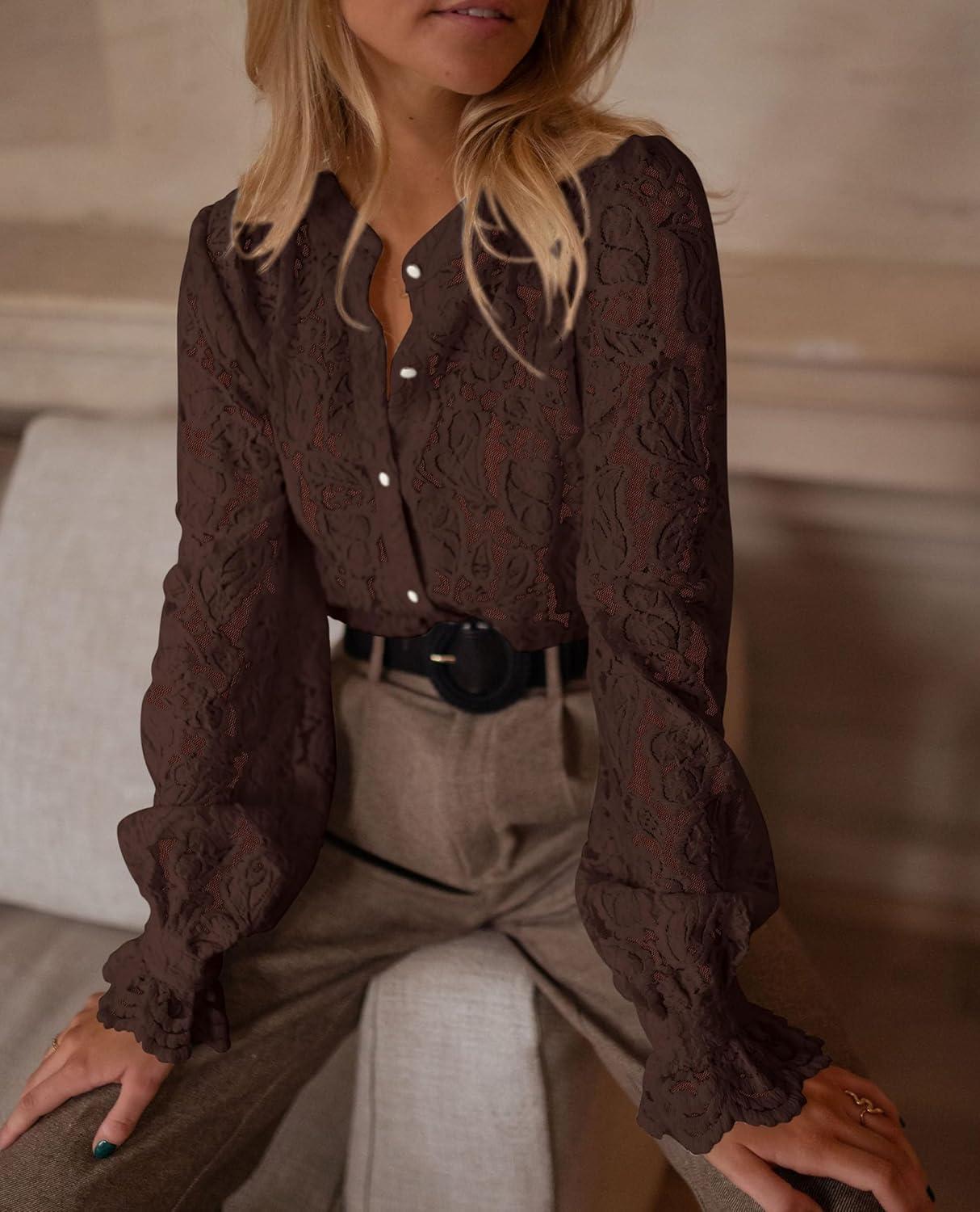 PRETTYGARDEN Women's Dressy Casual Lace Blouse Long Sleeve Button Up Shirts Tops Spring Fall Fashion Clothes(Coffee)