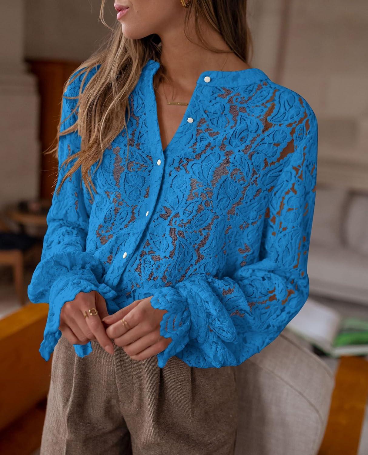 PRETTYGARDEN Women’s Dressy Casual Lace Blouse Long Sleeve Button Up Shirts Tops Spring Fall Fashion Clothes(Light Blue)
