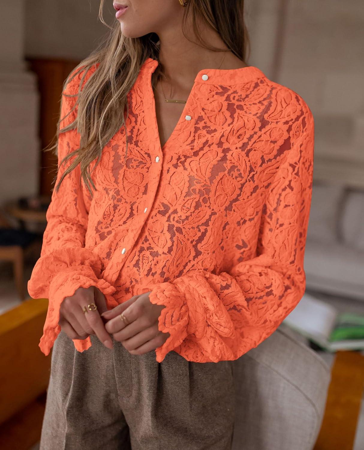 PRETTYGARDEN Women’s Dressy Casual Lace Blouse Long Sleeve Button Up Shirts Tops Spring Fall Fashion Clothes(Orange)