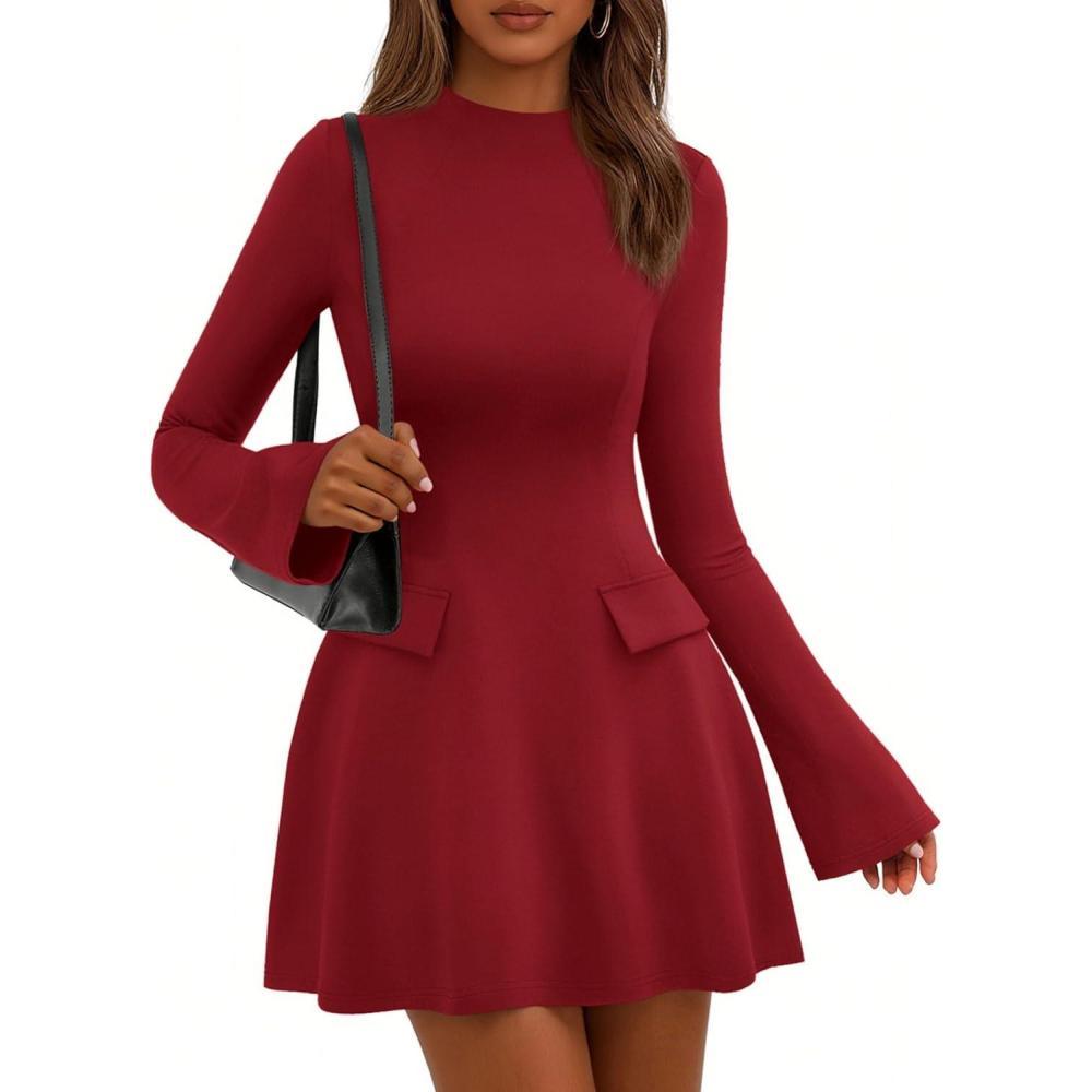 PRETTYGARDEN Women’s Elegant Holiday Short Dress 2026 Fall Bell Long Sleeve Mock Neck Work Business Casual Party Mini Dress(Red)