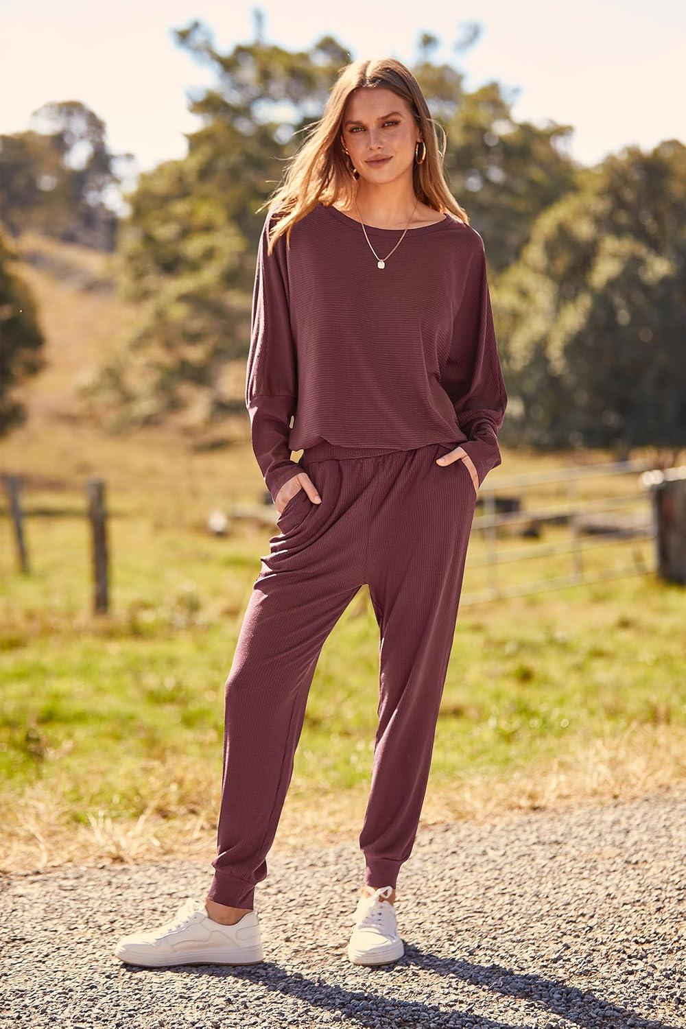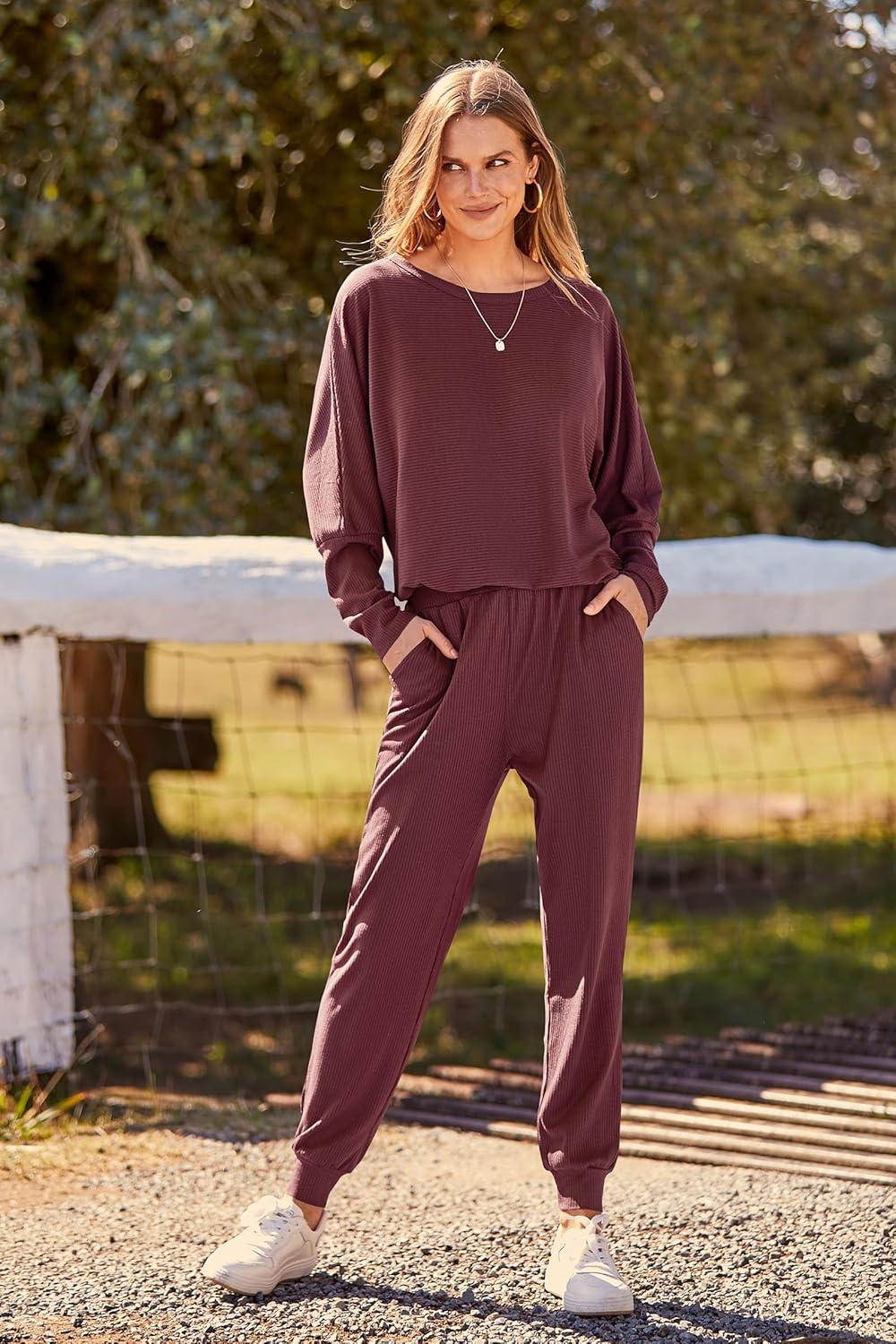 PRETTYGARDEN Women's Fall 2 Piece Lounge Set Long Sleeve Tops Ribbed Pants Spring Matching Sweatsuit Travel Outfits Clothes(Wine Red)