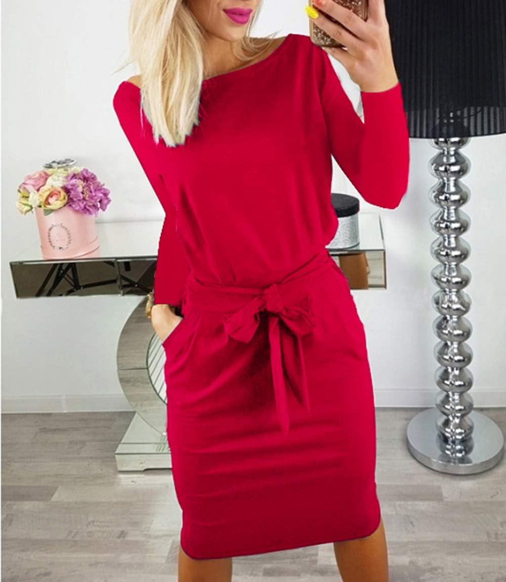 PRETTYGARDEN Women's Fall Bodycon Party Dress Casual Long Sleeve Tie Waist Fitted Sheath Pencil Dresses with Pockets(Red)