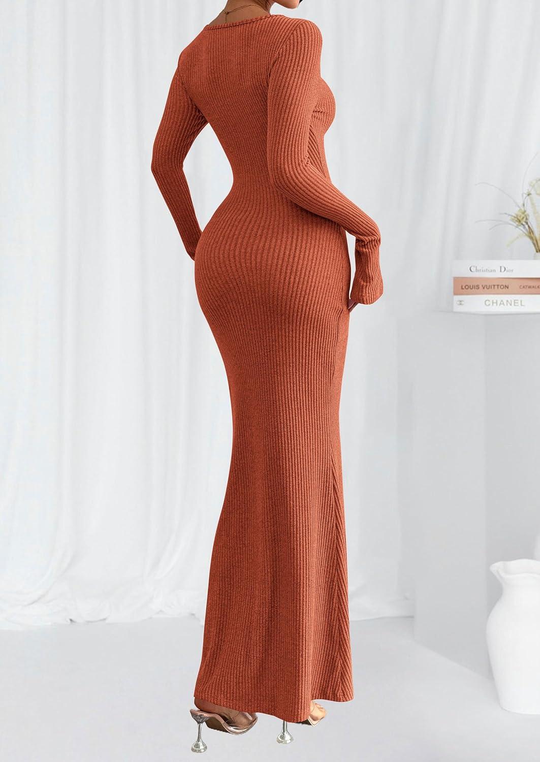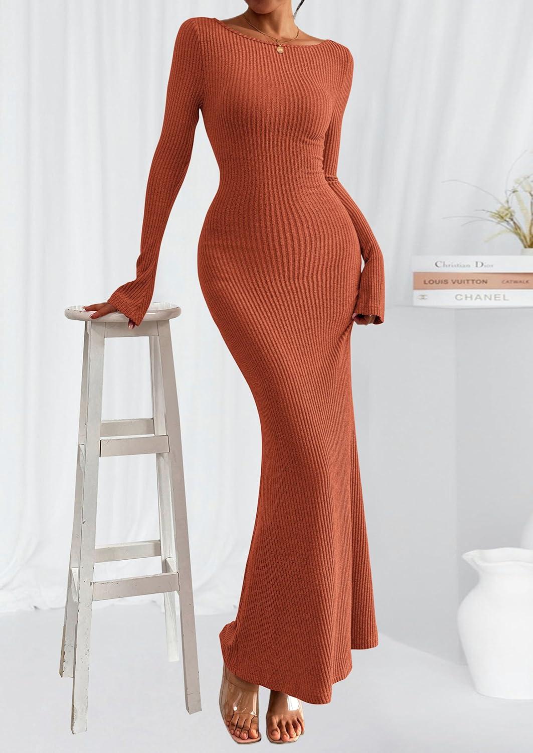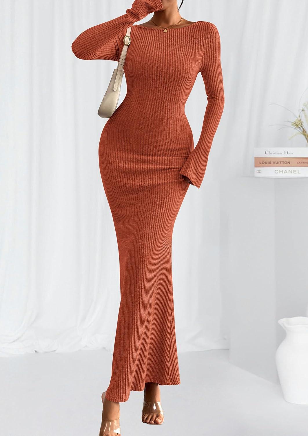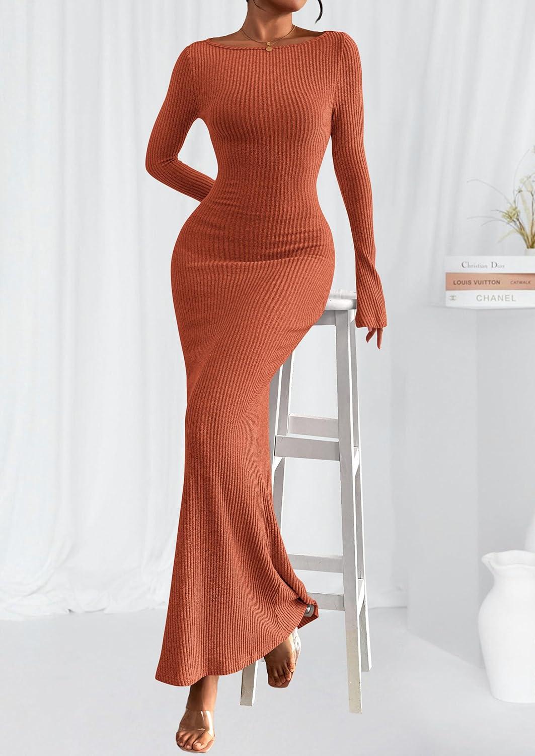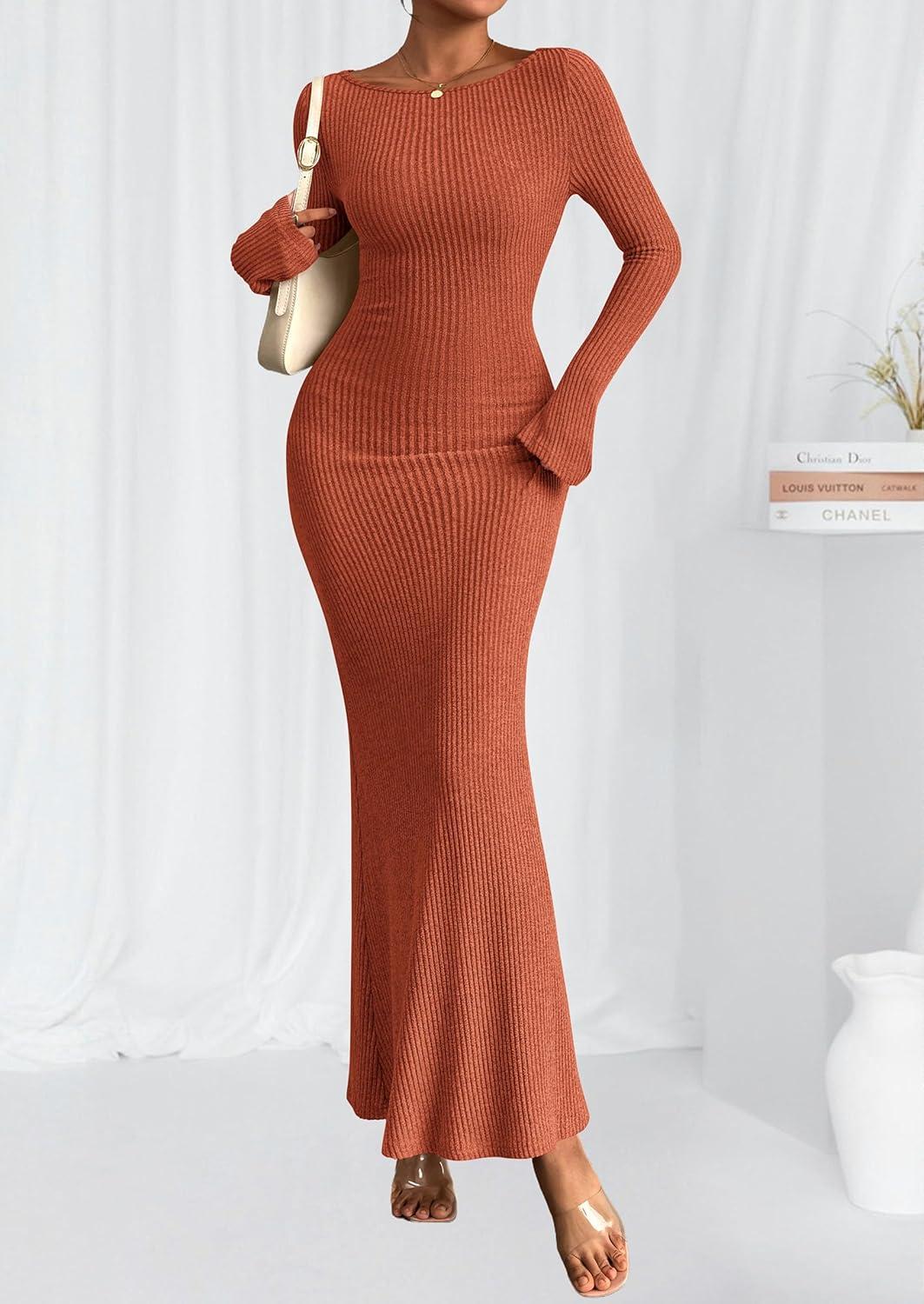 PRETTYGARDEN Women’s Fall Fashion 2025 Long Sleeve Maxi Dress Ribbed Knit Boat Neck Bodycon Casual Dresses Going Out Outfits(Burnt Orange)