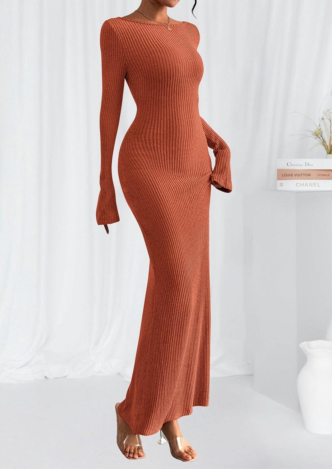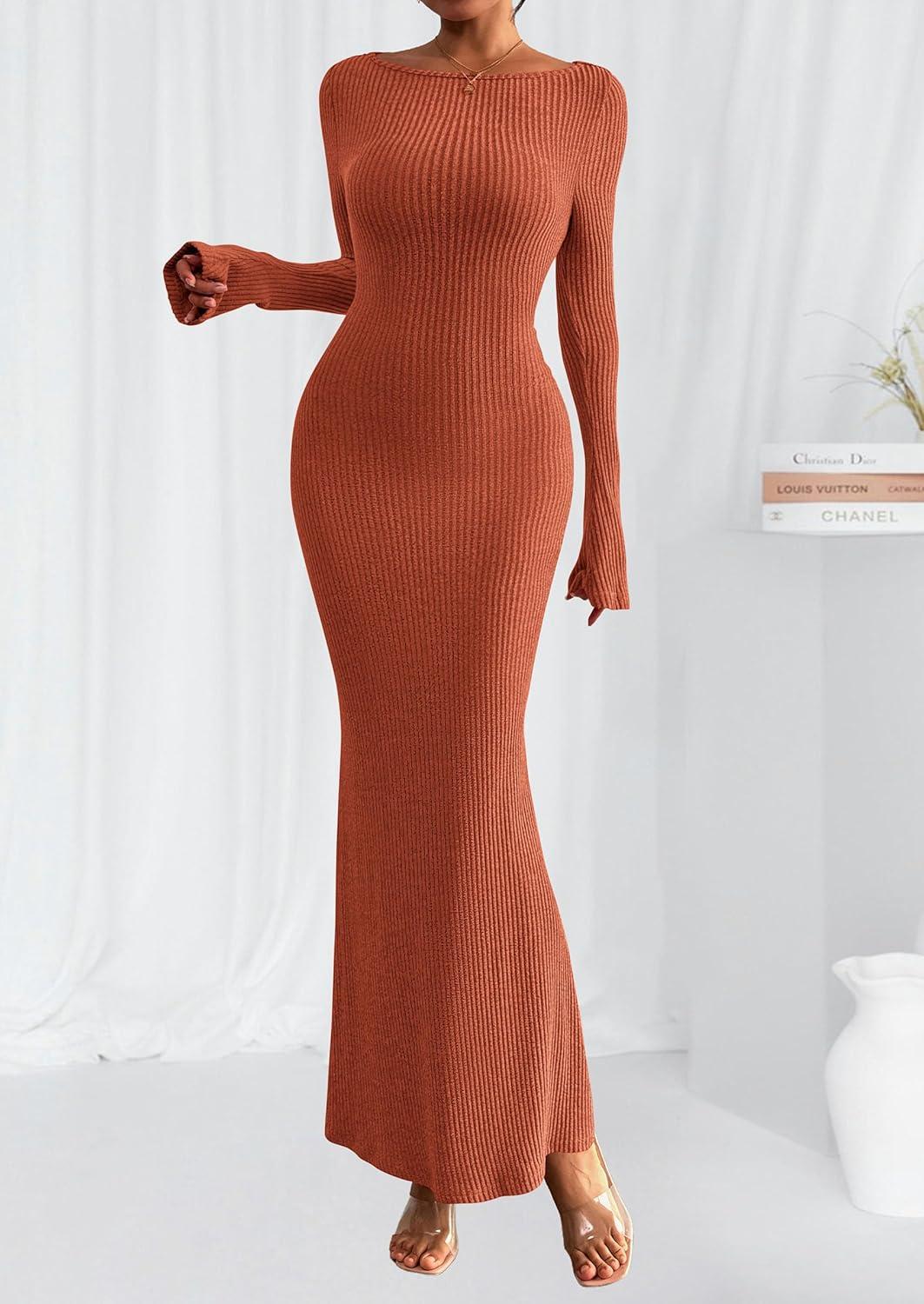 imagePRETTYGARDEN Womens Fall Fashion 2025 Long Sleeve Maxi Dress Ribbed Knit Boat Neck Bodycon Casual Dresses Going Out OutfitsBurnt Orange
