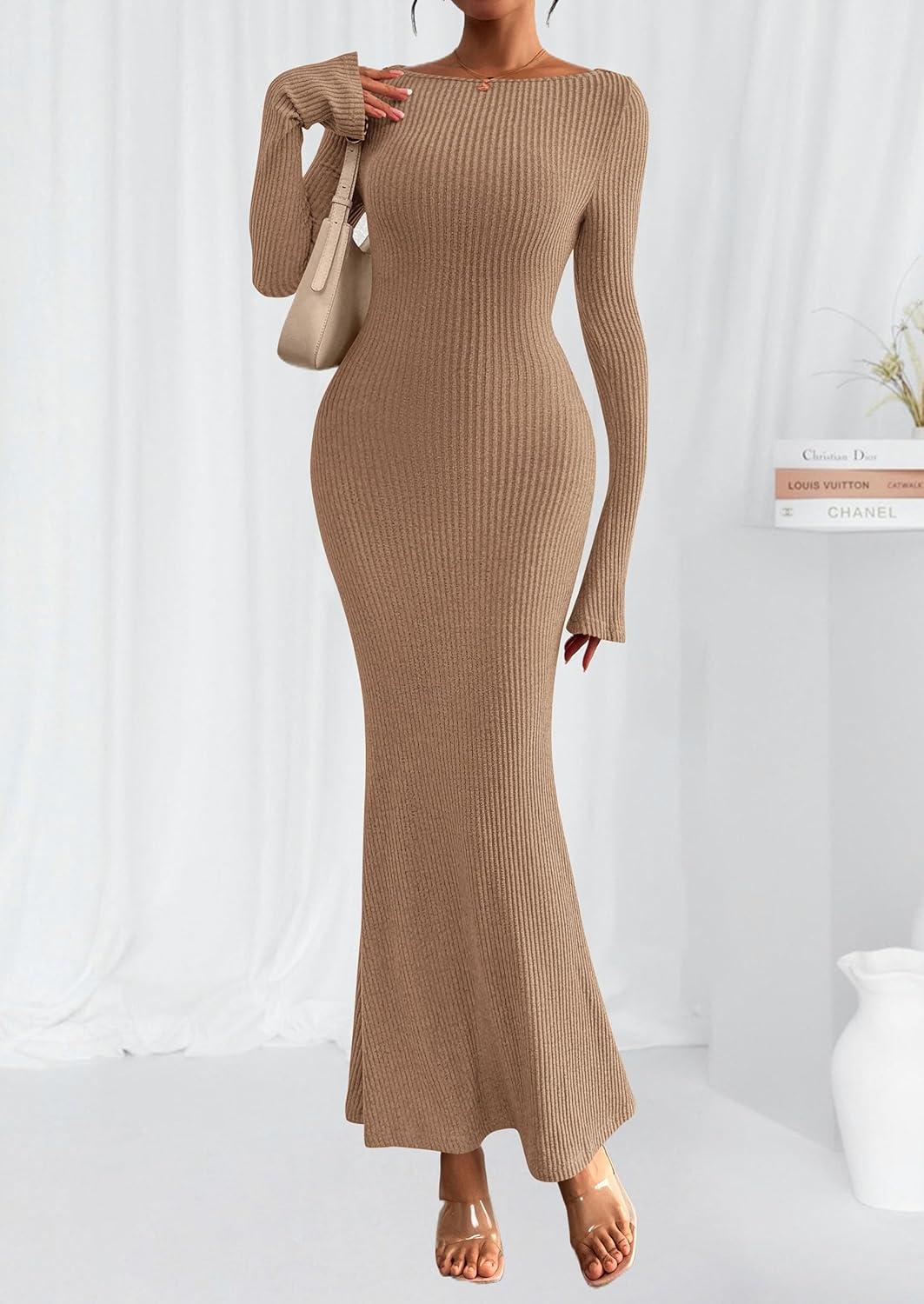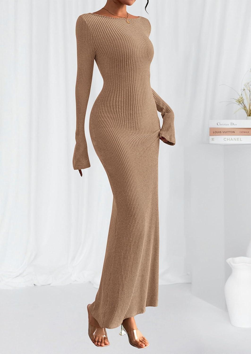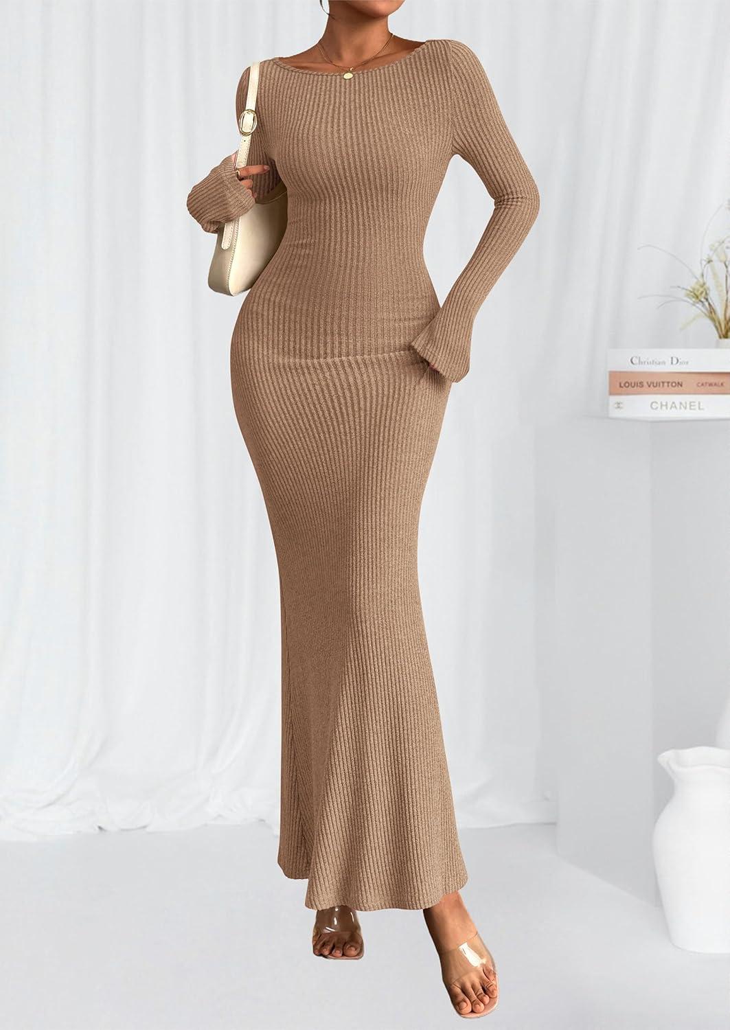 PRETTYGARDEN Women's Fall Fashion 2025 Long Sleeve Maxi Dress Ribbed Knit Boat Neck Bodycon Casual Dresses Going Out Outfits(Khaki)
