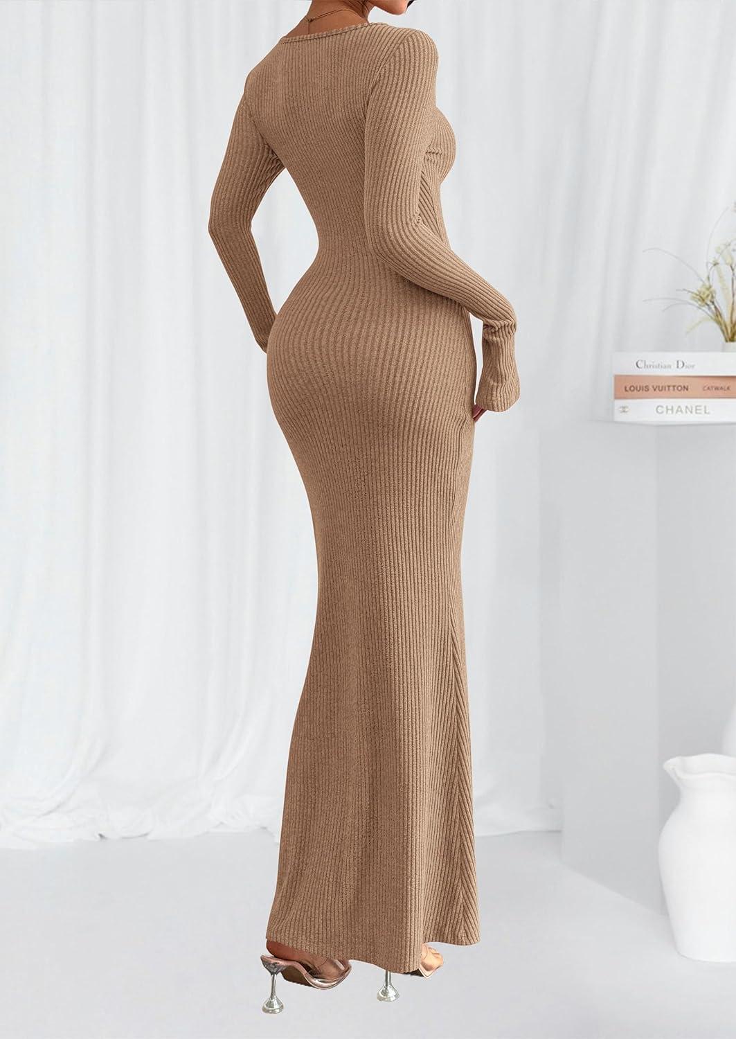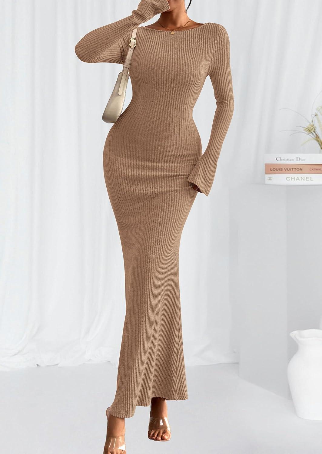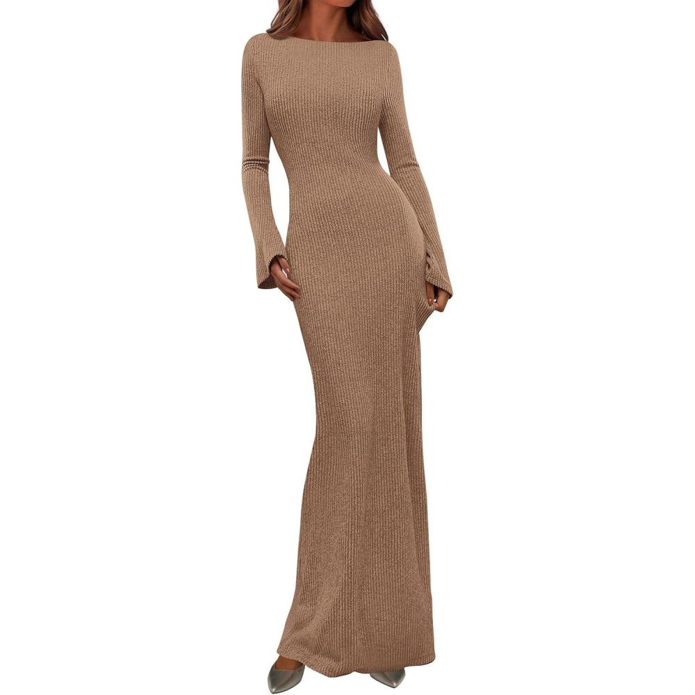 PRETTYGARDEN Women's Fall Fashion 2025 Long Sleeve Maxi Dress Ribbed Knit Boat Neck Bodycon Casual Dresses Going Out Outfits(Khaki)