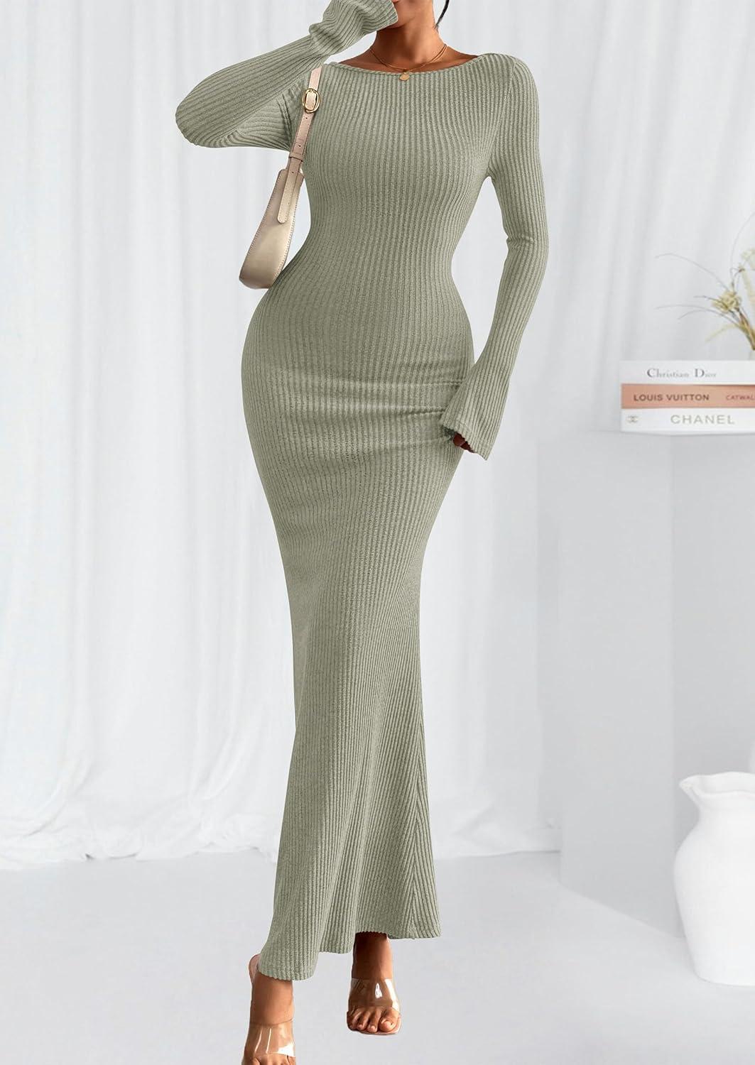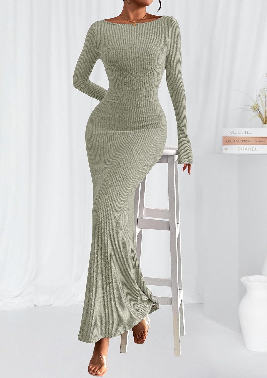 PRETTYGARDEN Women's Fall Fashion 2025 Long Sleeve Maxi Dress Ribbed Knit Boat Neck Bodycon Casual Dresses Going Out Outfits(Light Green)
