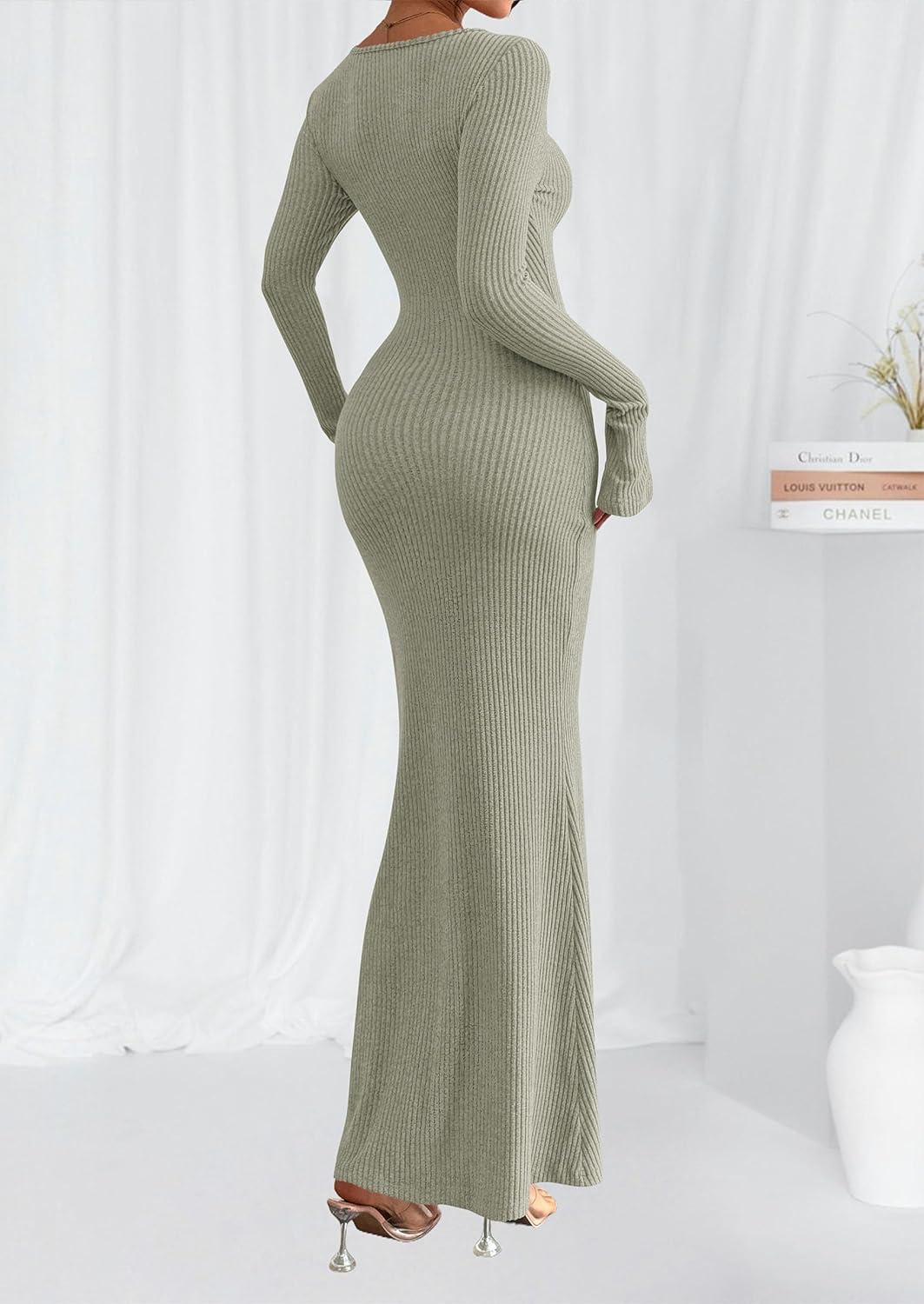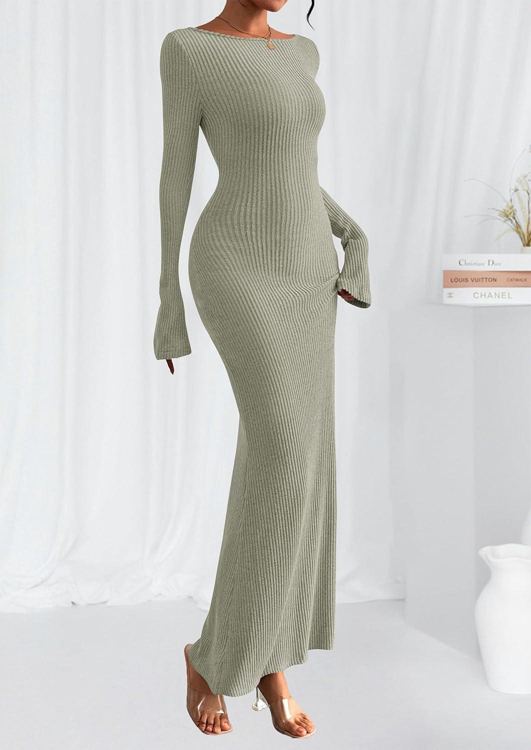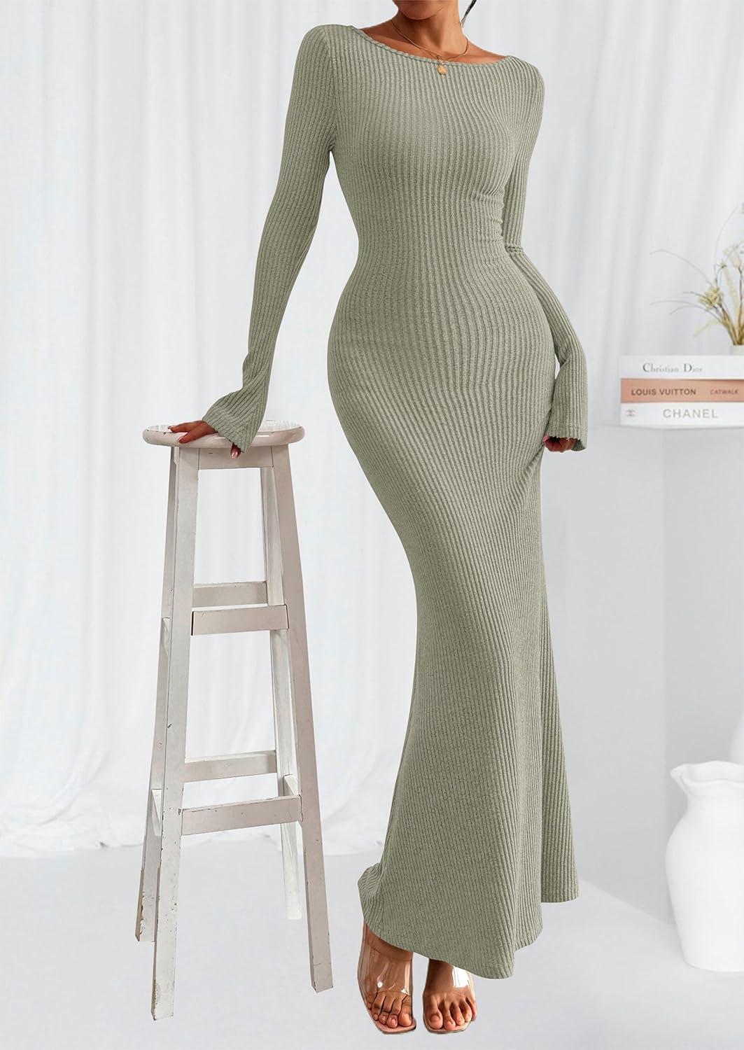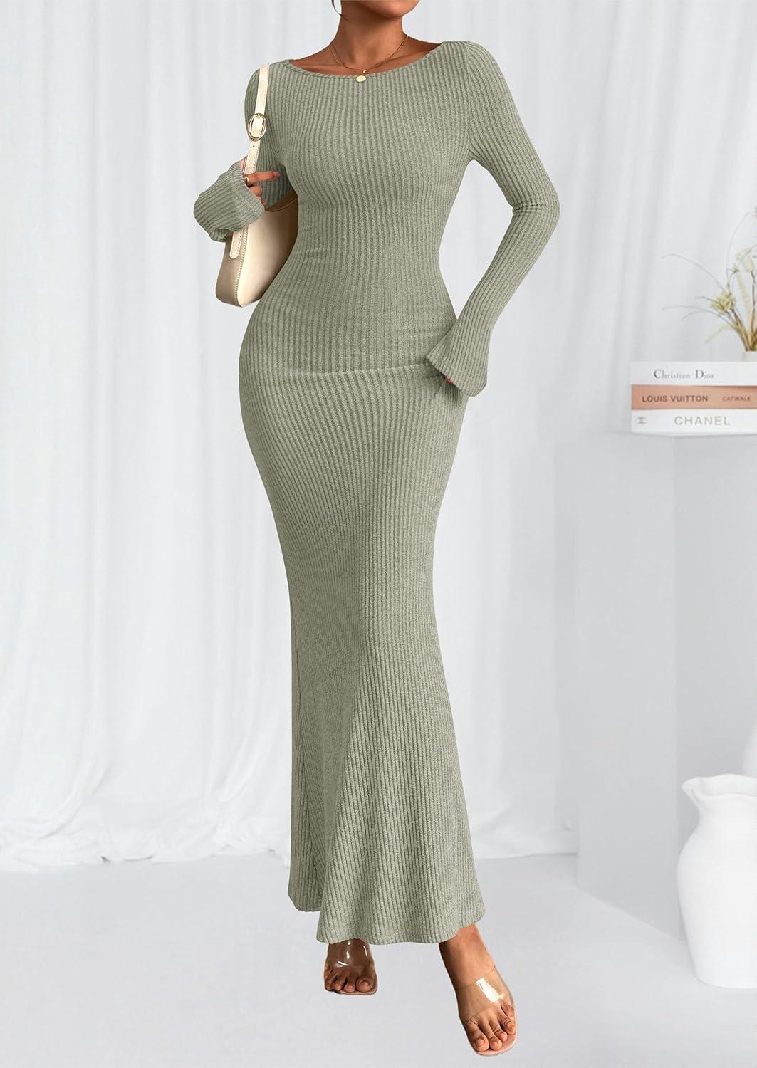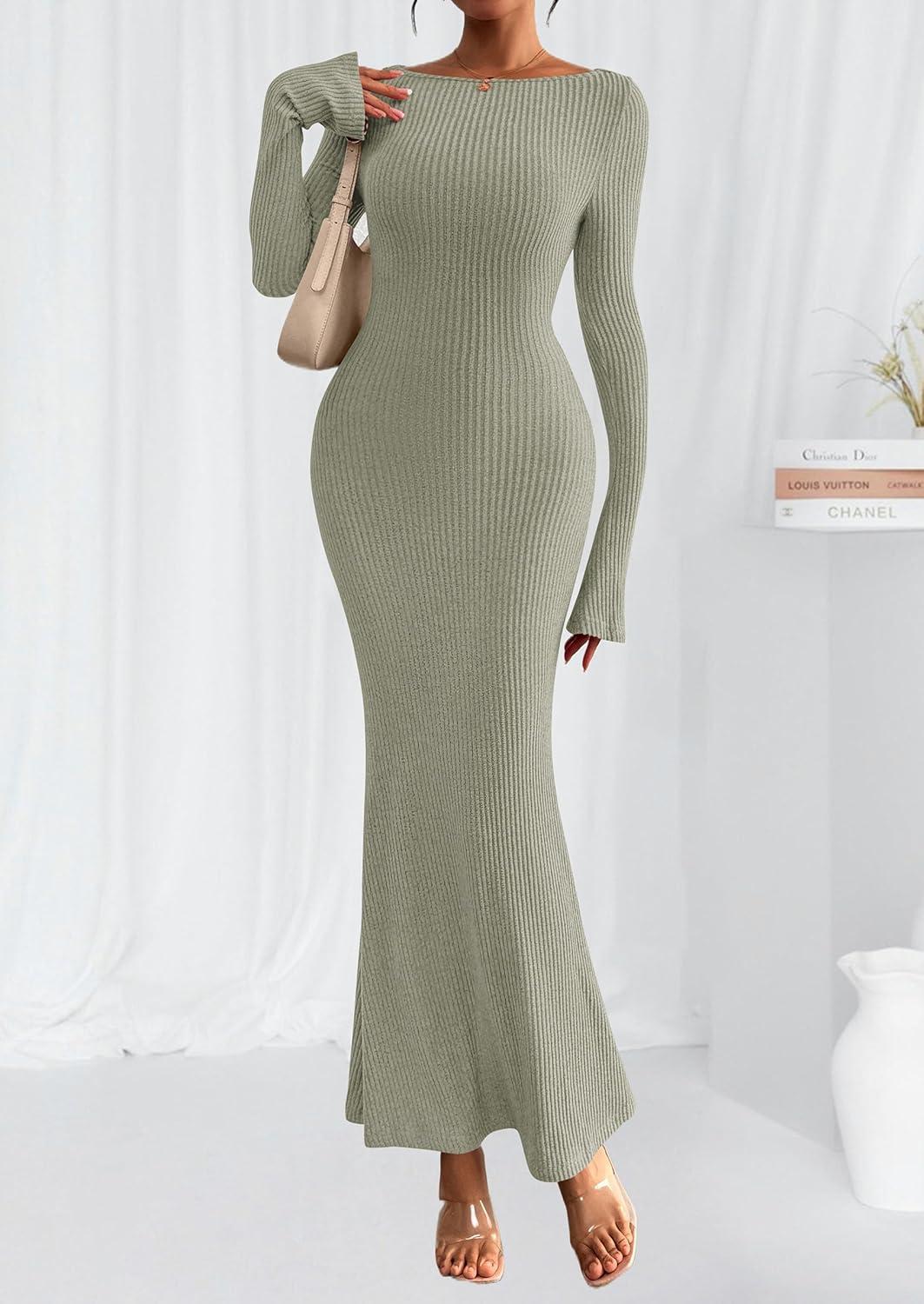 PRETTYGARDEN Women’s Fall Fashion 2025 Long Sleeve Maxi Dress Ribbed Knit Boat Neck Bodycon Casual Dresses Going Out Outfits(Light Green)