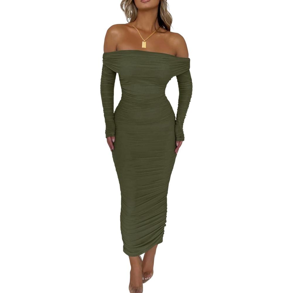 Be the first to review “PRETTYGARDEN Women’s Fall Off The Shoulder Maxi Dress Spring Long Sleeve Ruched Fitted Bodycon Club Dresses with Slit(Army Green)”