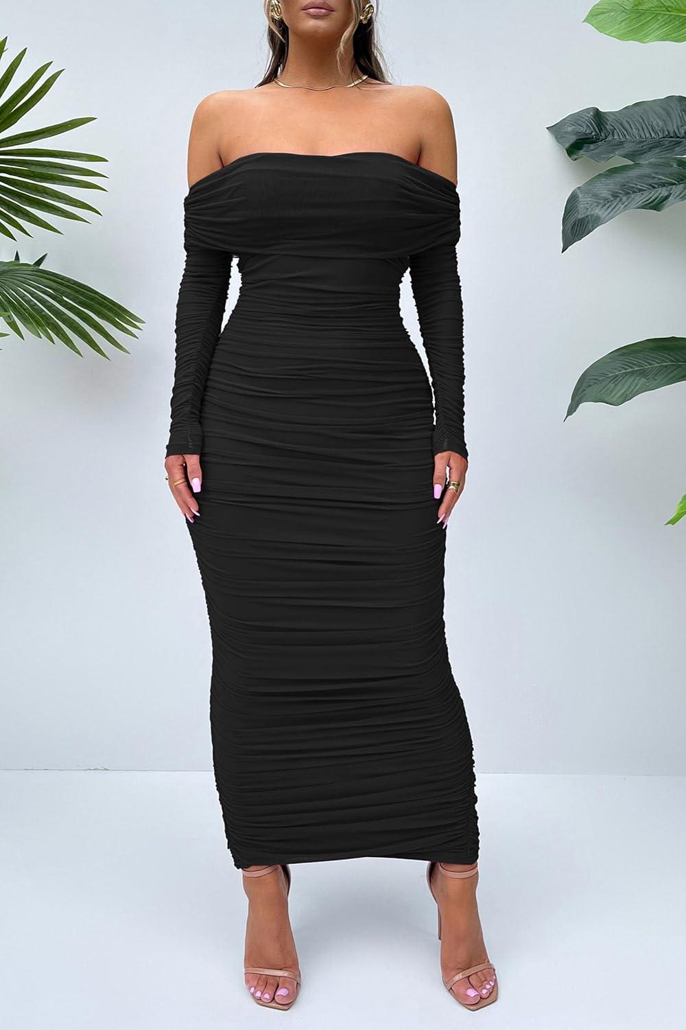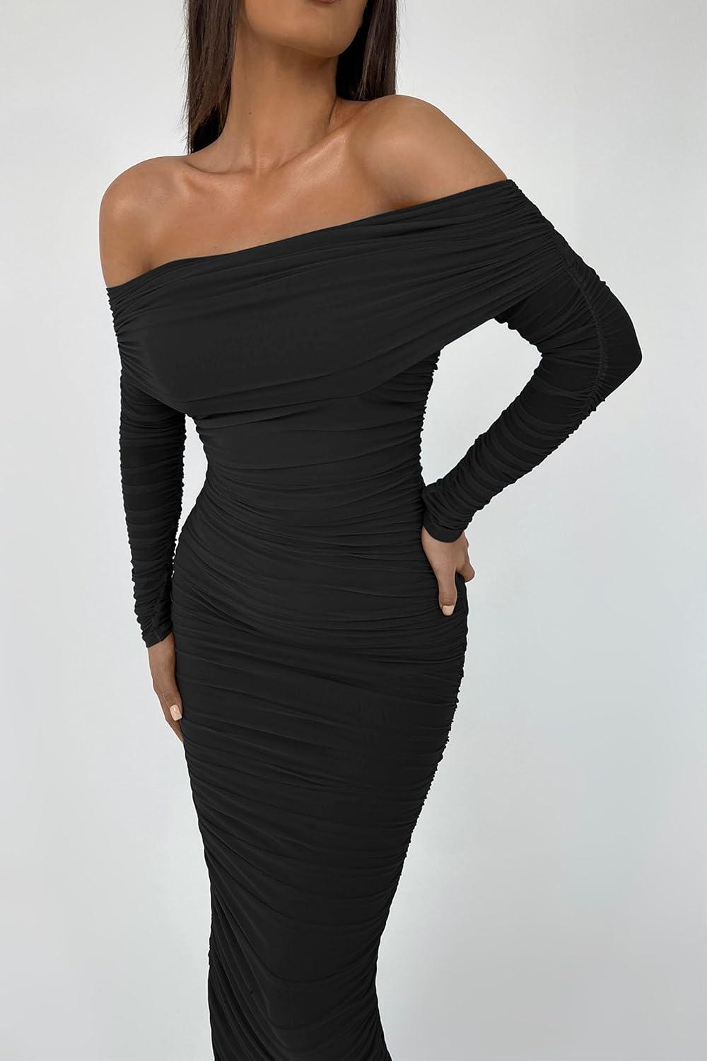 PRETTYGARDEN Women's Fall Off The Shoulder Maxi Dress Spring Long Sleeve Ruched Fitted Bodycon Club Dresses with Slit(Black)