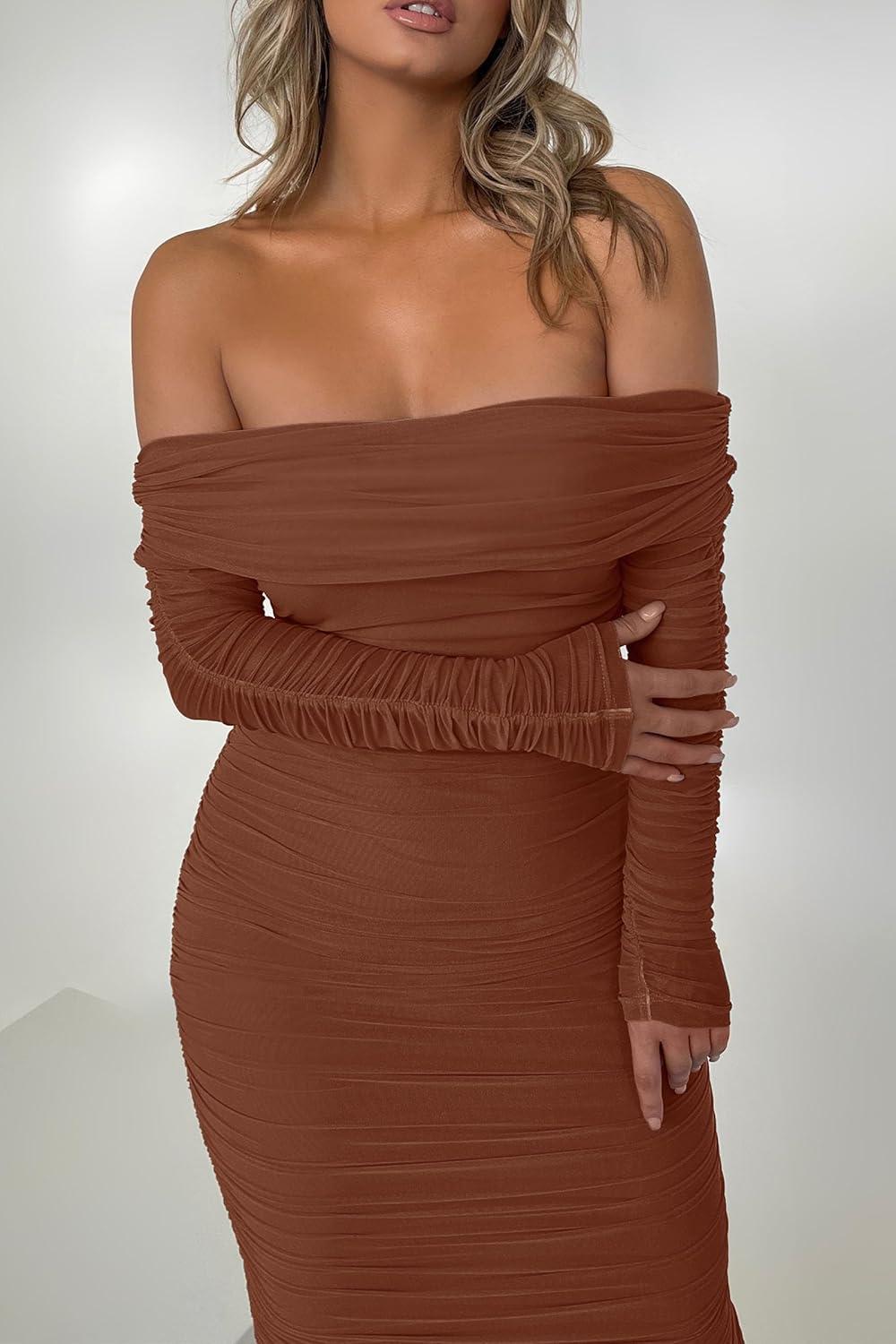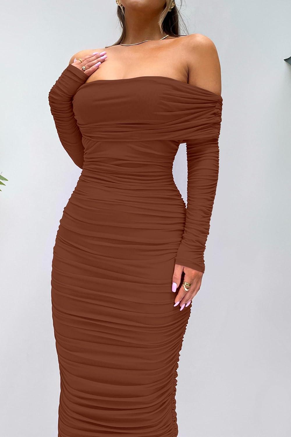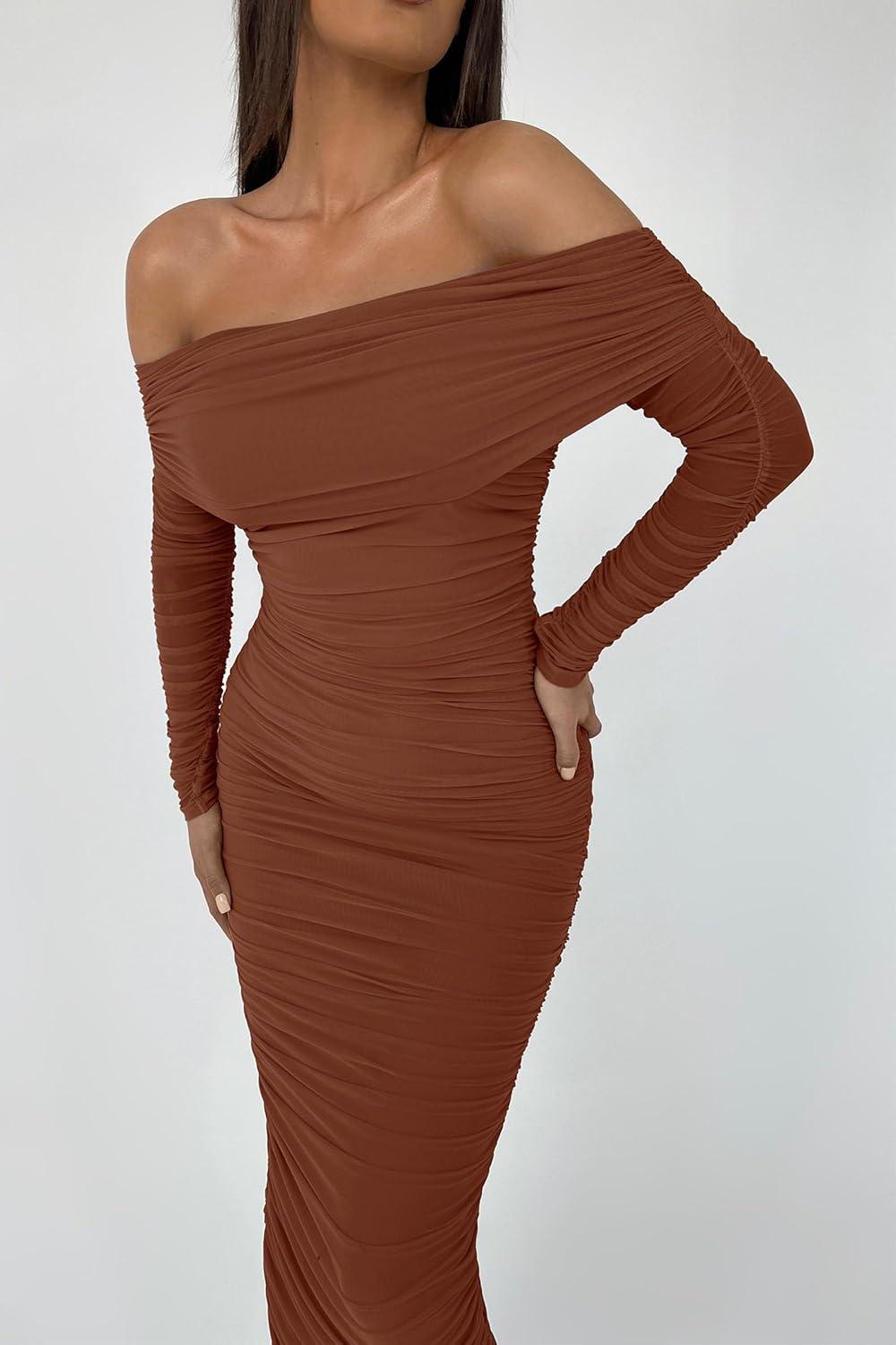 PRETTYGARDEN Women’s Fall Off The Shoulder Maxi Dress Spring Long Sleeve Ruched Fitted Bodycon Club Dresses with Slit(Caramel)