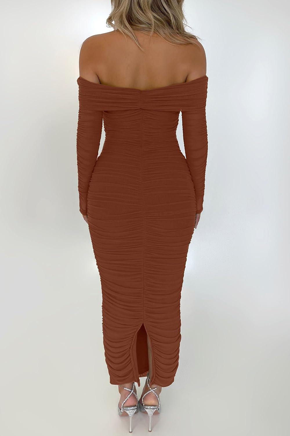 PRETTYGARDEN Women's Fall Off The Shoulder Maxi Dress Spring Long Sleeve Ruched Fitted Bodycon Club Dresses with Slit(Caramel)
