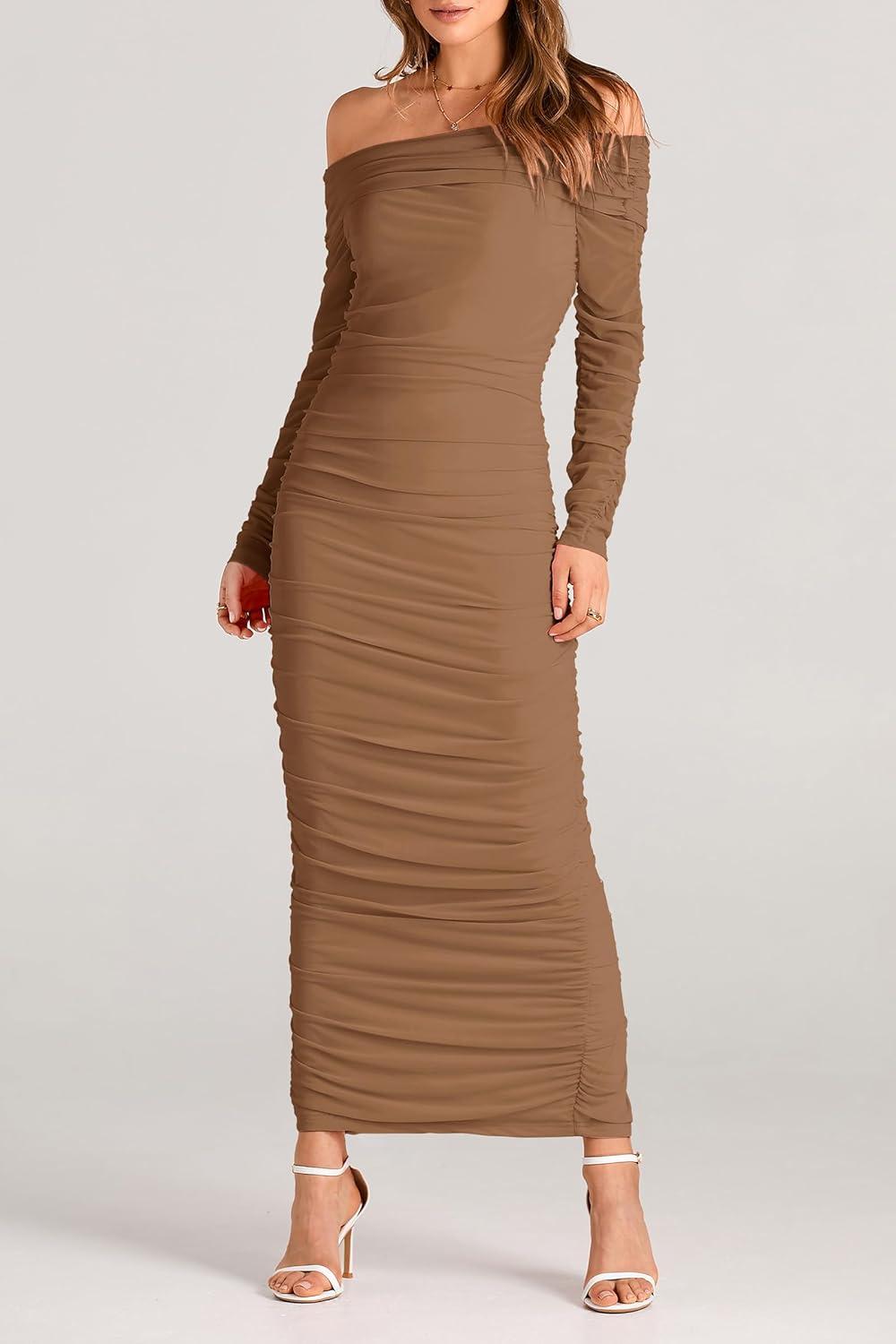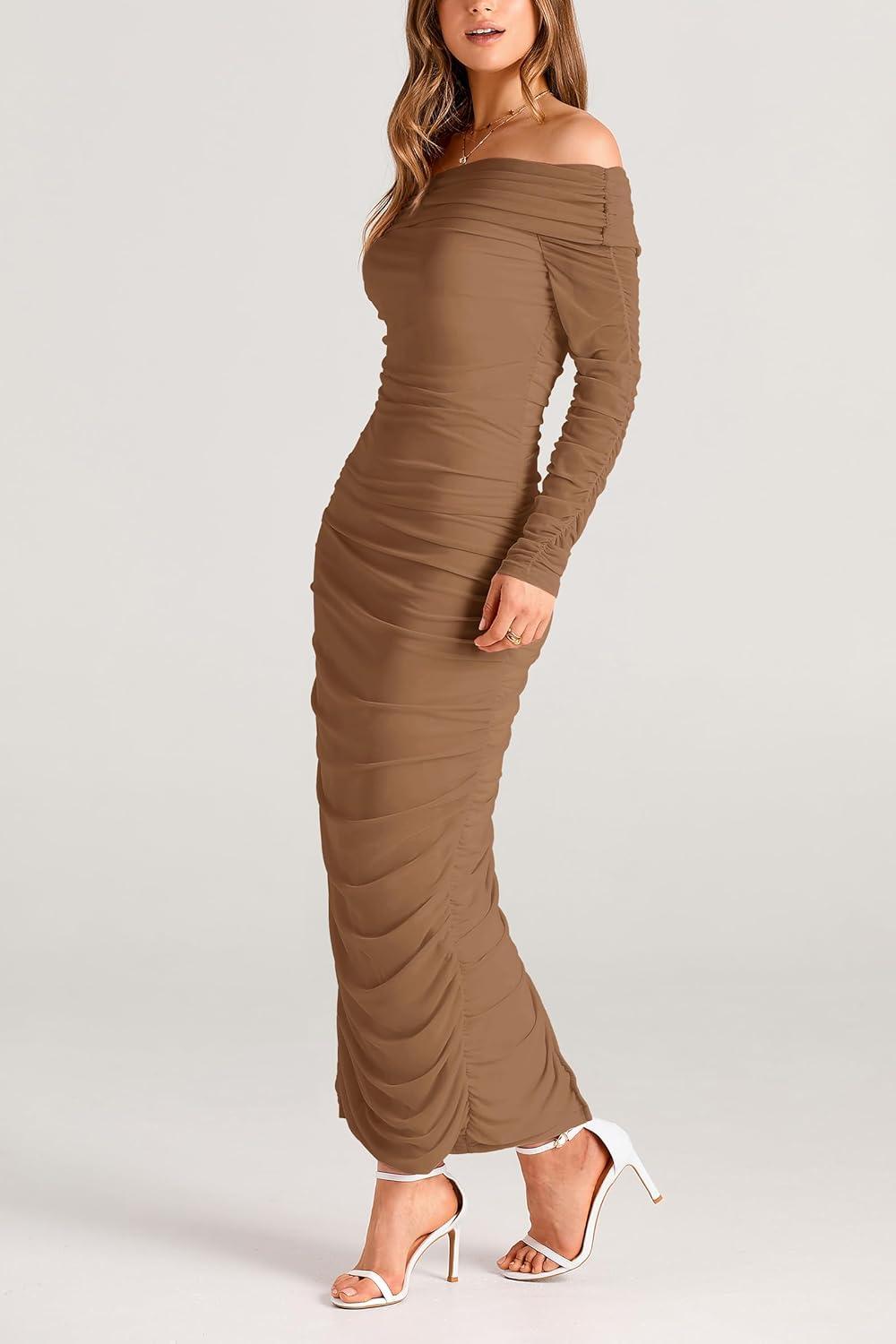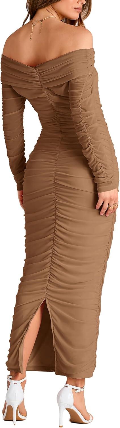 imagePRETTYGARDEN Womens Fall Off The Shoulder Maxi Dress Spring Long Sleeve Ruched Fitted Bodycon Club Dresses with SlitLight Brown