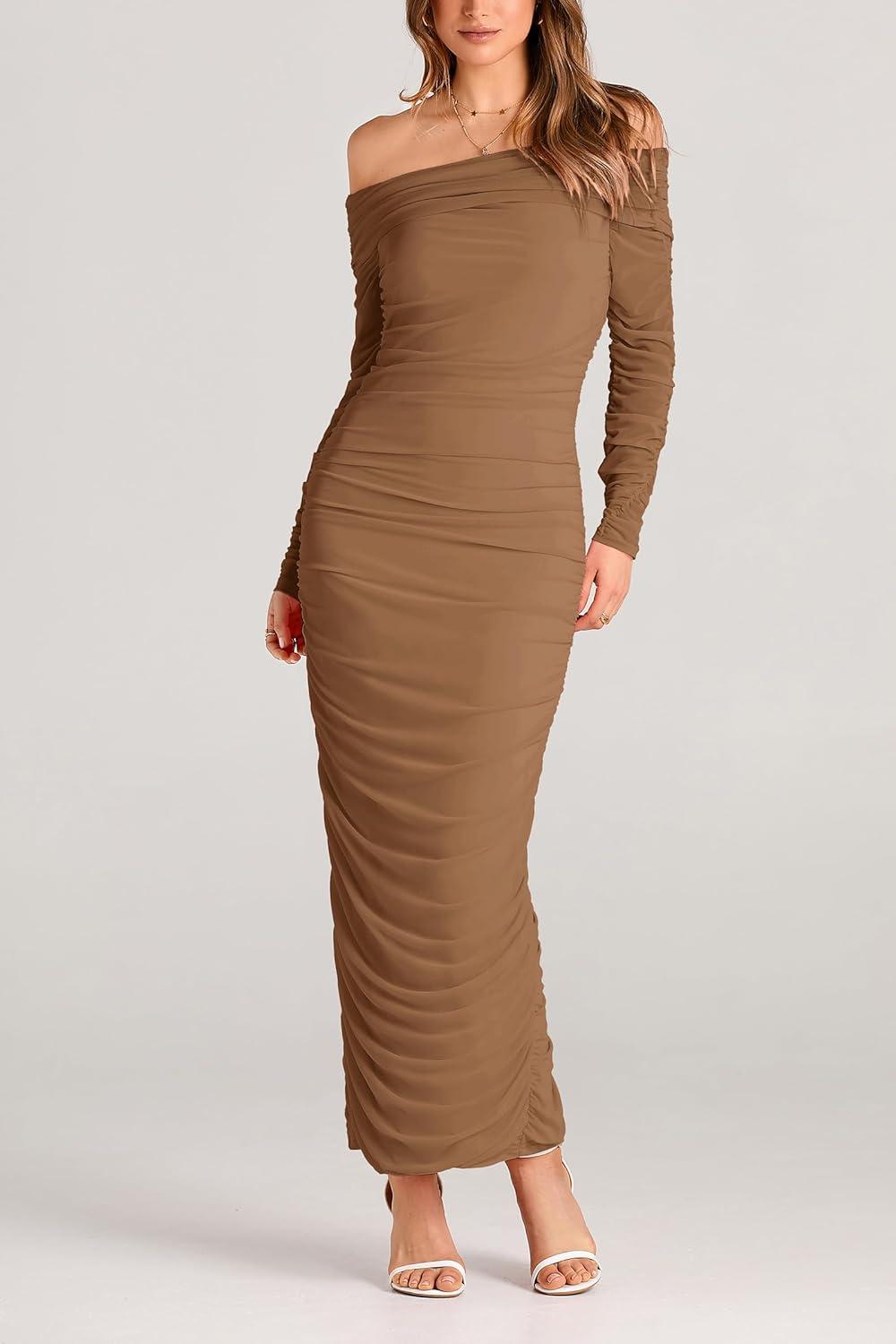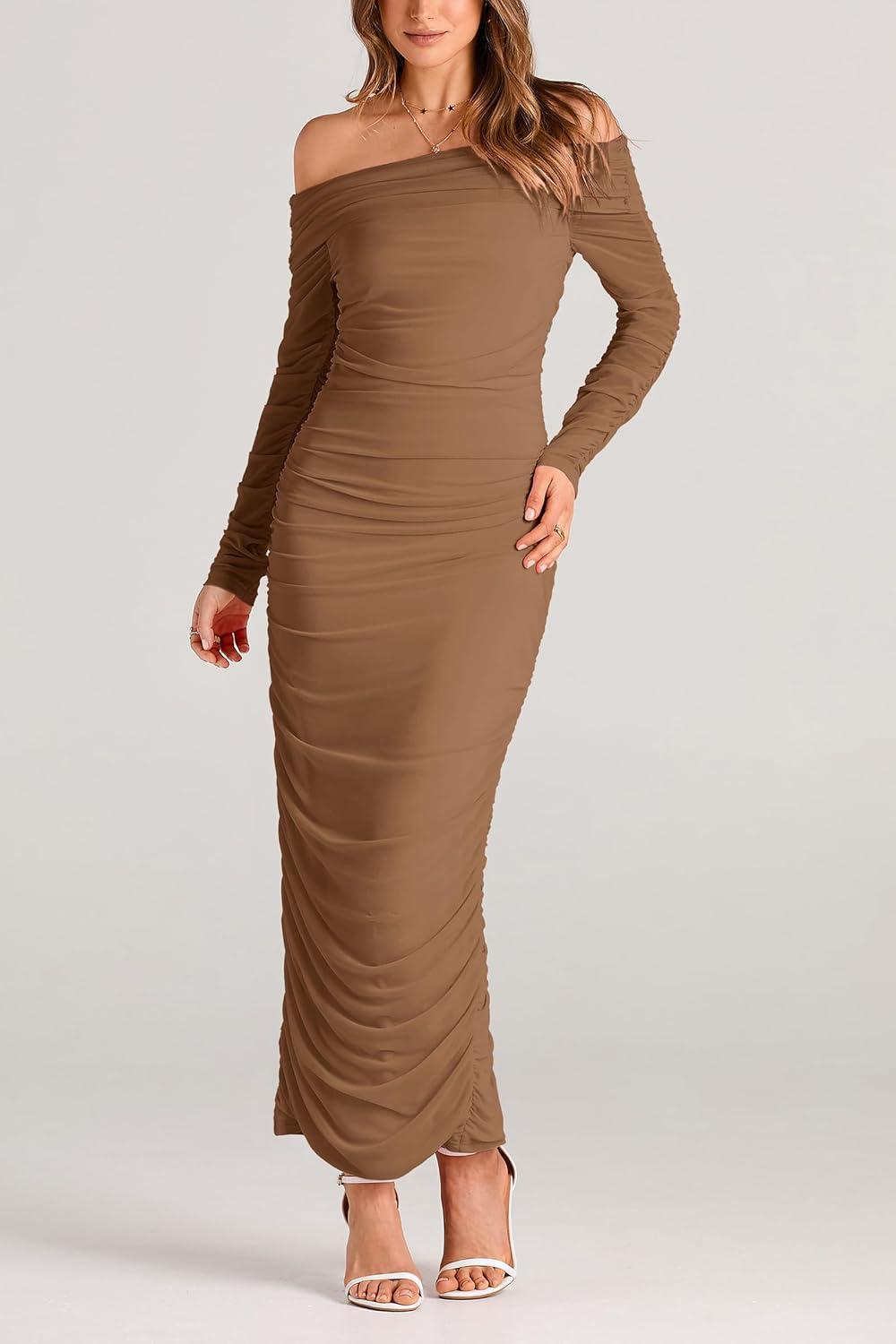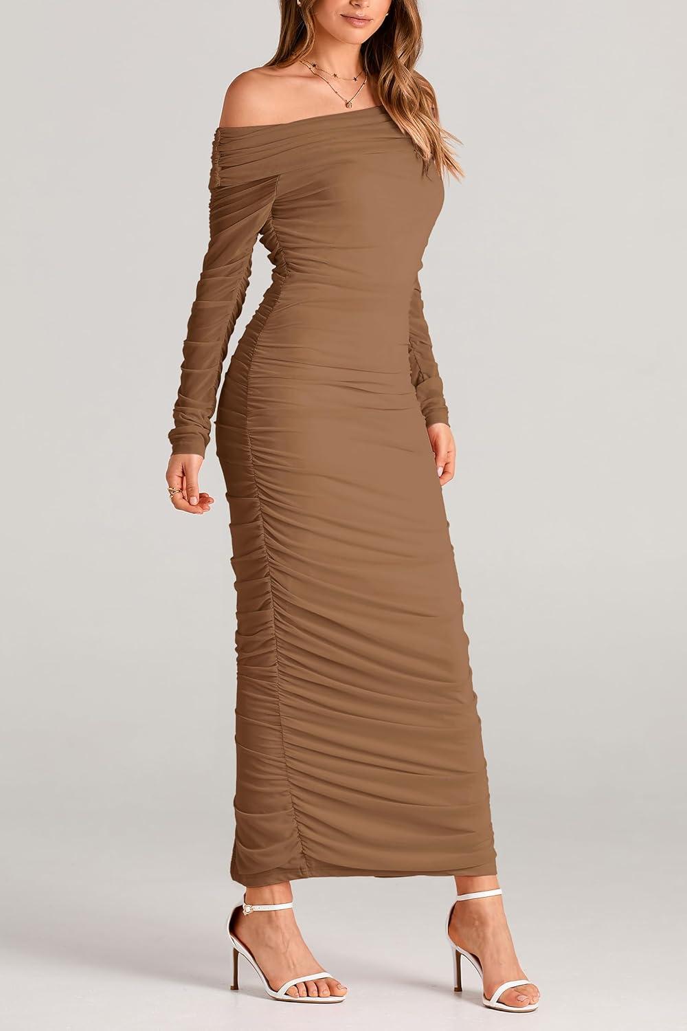 imagePRETTYGARDEN Womens Fall Off The Shoulder Maxi Dress Spring Long Sleeve Ruched Fitted Bodycon Club Dresses with SlitLight Brown