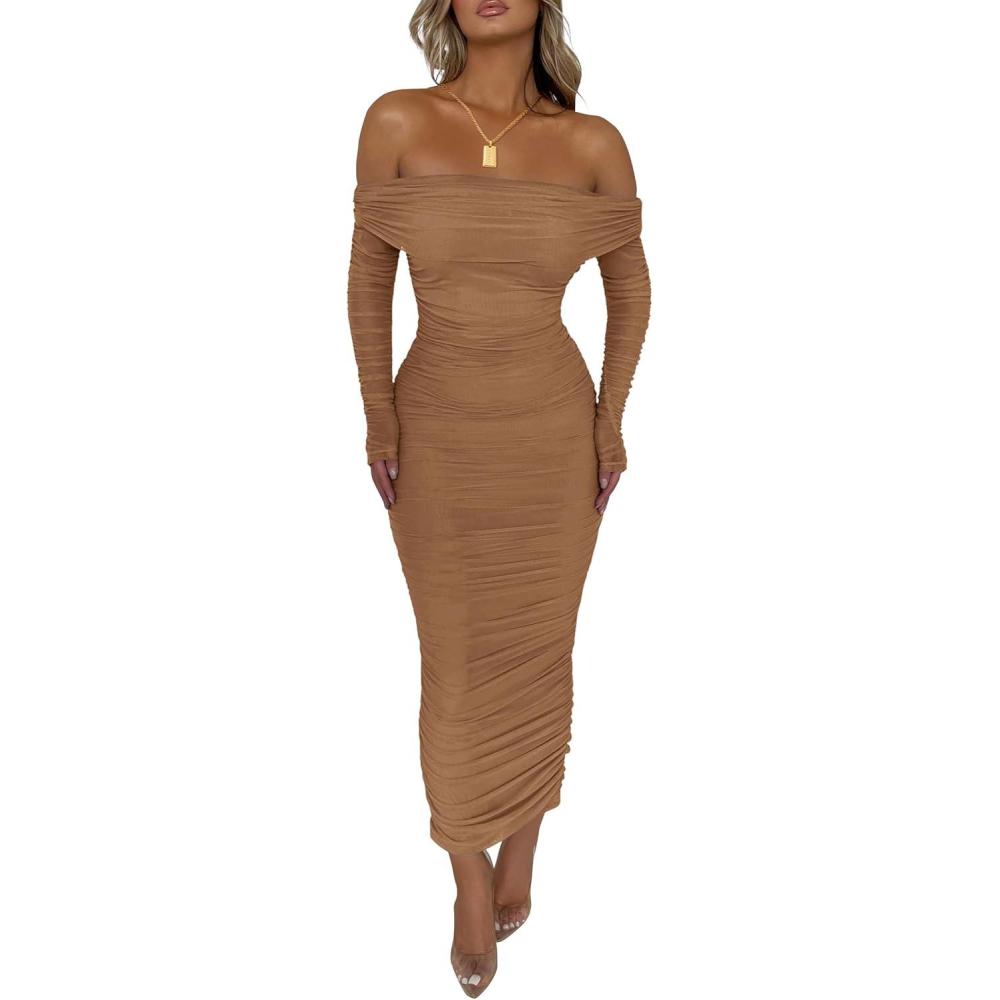 PRETTYGARDEN Women's Fall Off The Shoulder Maxi Dress Spring Long Sleeve Ruched Fitted Bodycon Club Dresses with Slit(Light Brown)
