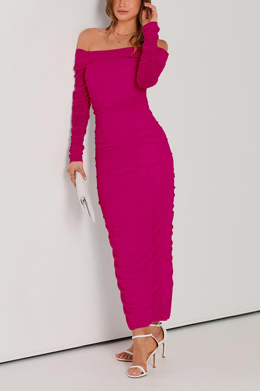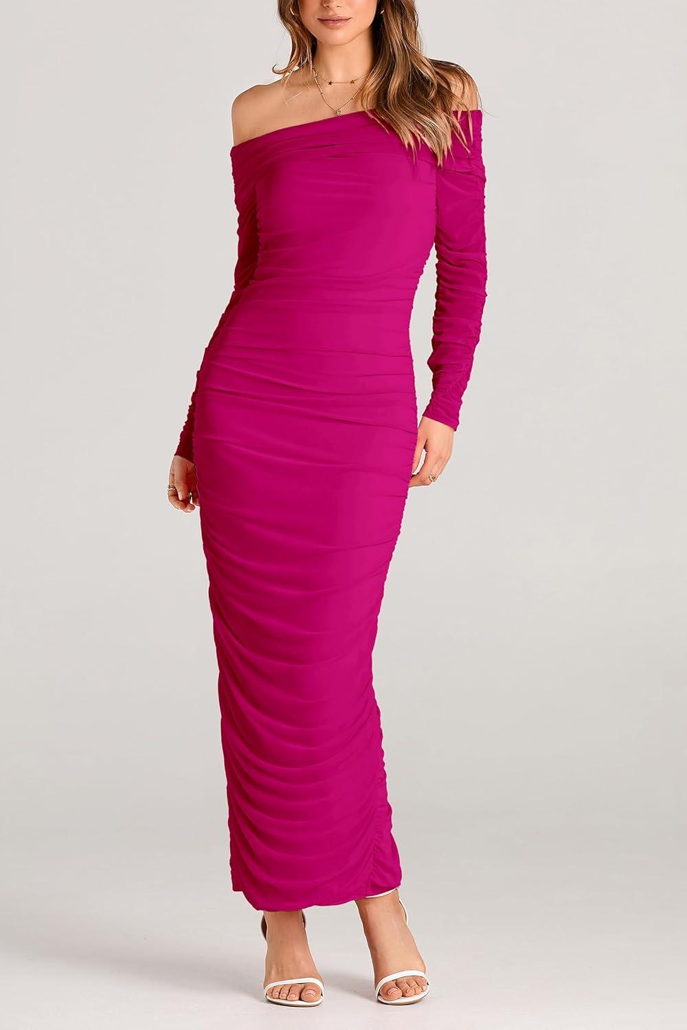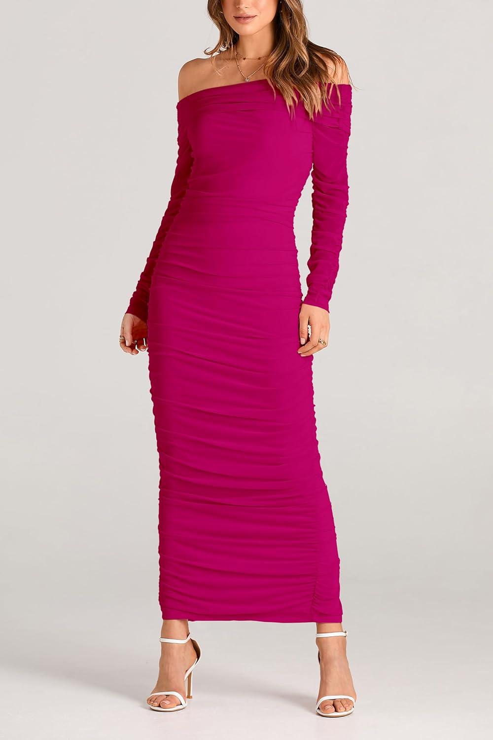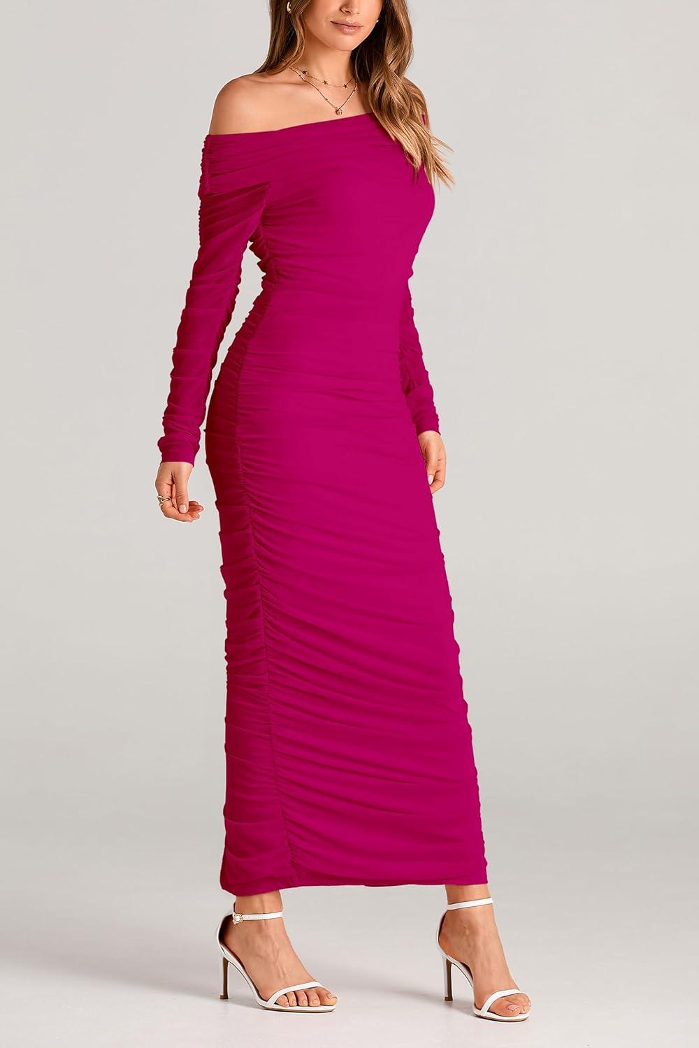 PRETTYGARDEN Women’s Fall Off The Shoulder Maxi Dress Spring Long Sleeve Ruched Fitted Bodycon Club Dresses with Slit(Rose Red)