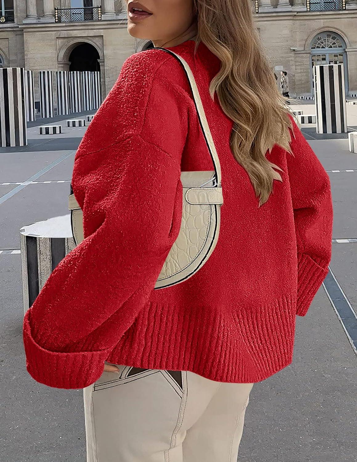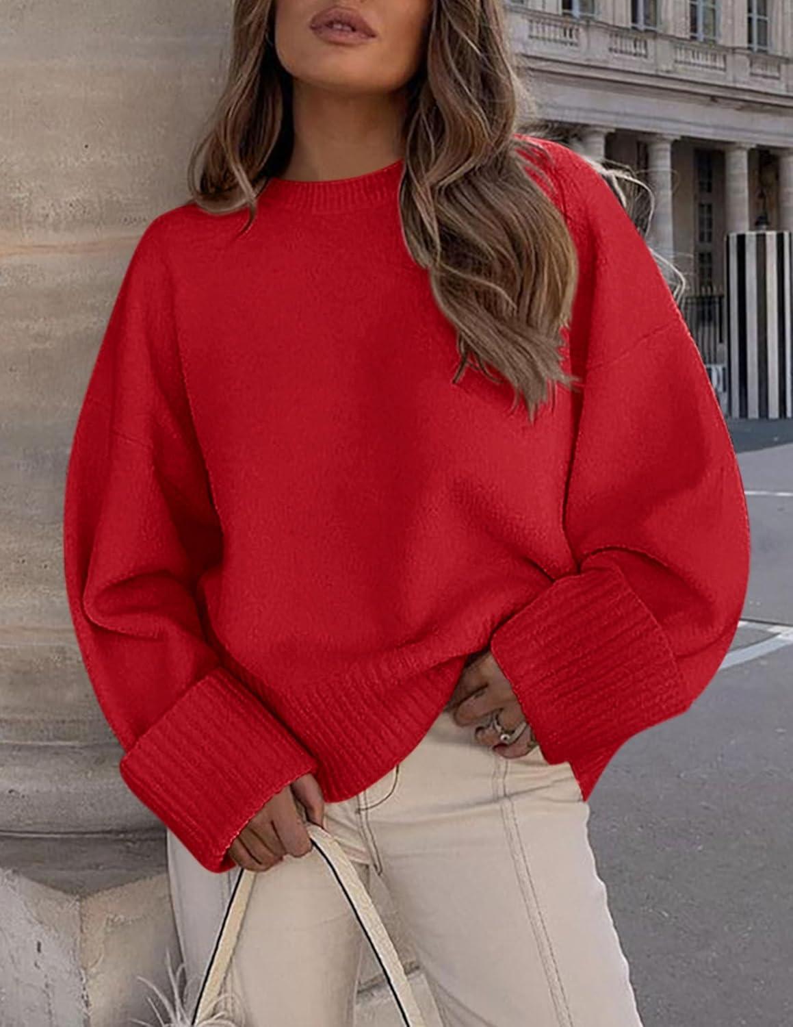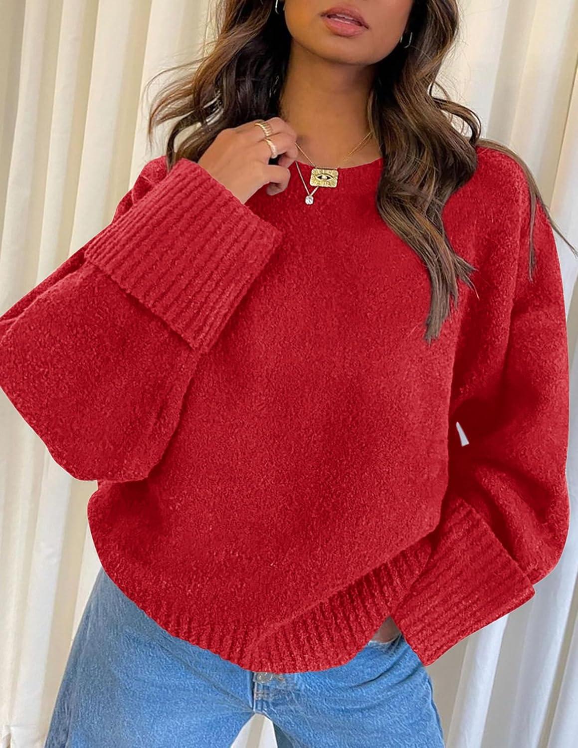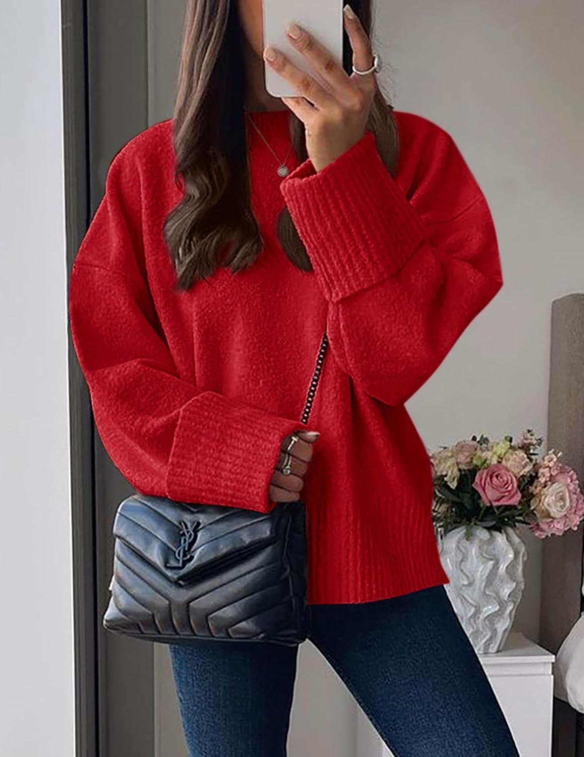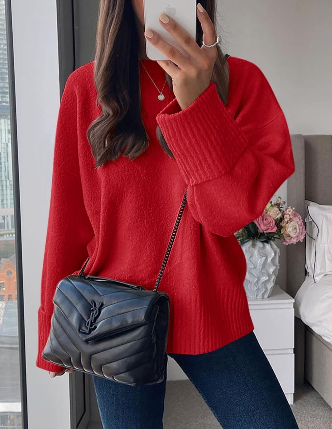 PRETTYGARDEN Women's Fall Oversized Sweaters Casual Crewneck Pullover Long Sleeve Fuzzy Chunky Knit Tops Blouse(Bright Red)