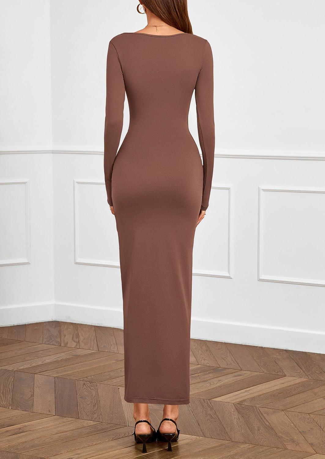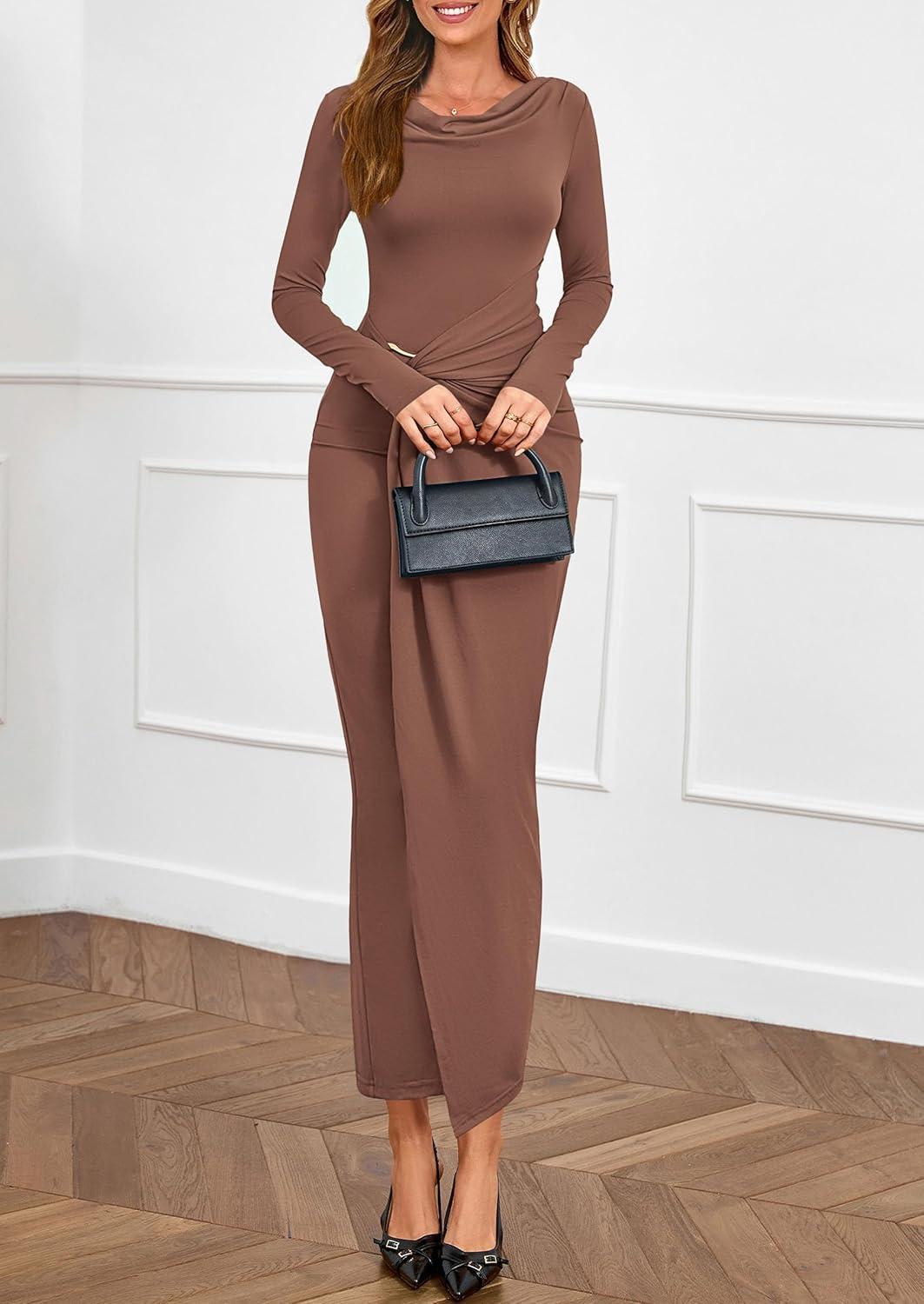 PRETTYGARDEN Women’s Fall Wedding Guest Cocktail Midi Dresses Elegant Long Sleeve Bodycon Ruched Dress 2025 Fashion Clothing(Light Brown)