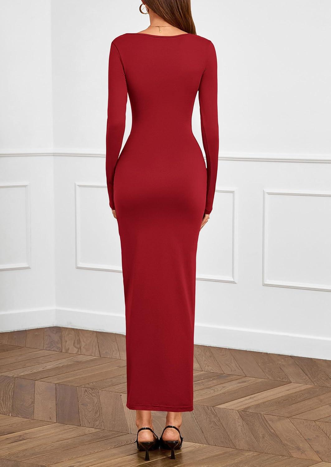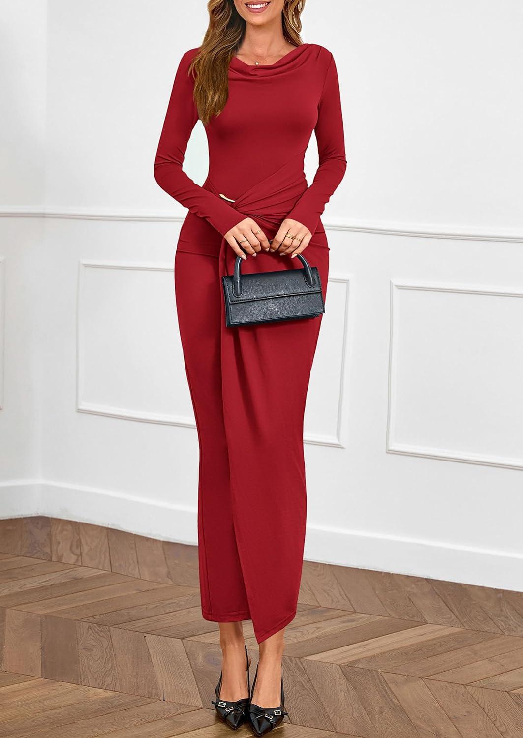 PRETTYGARDEN Women's Fall Wedding Guest Cocktail Midi Dresses Elegant Long Sleeve Bodycon Ruched Dress 2025 Fashion Clothing(Red)