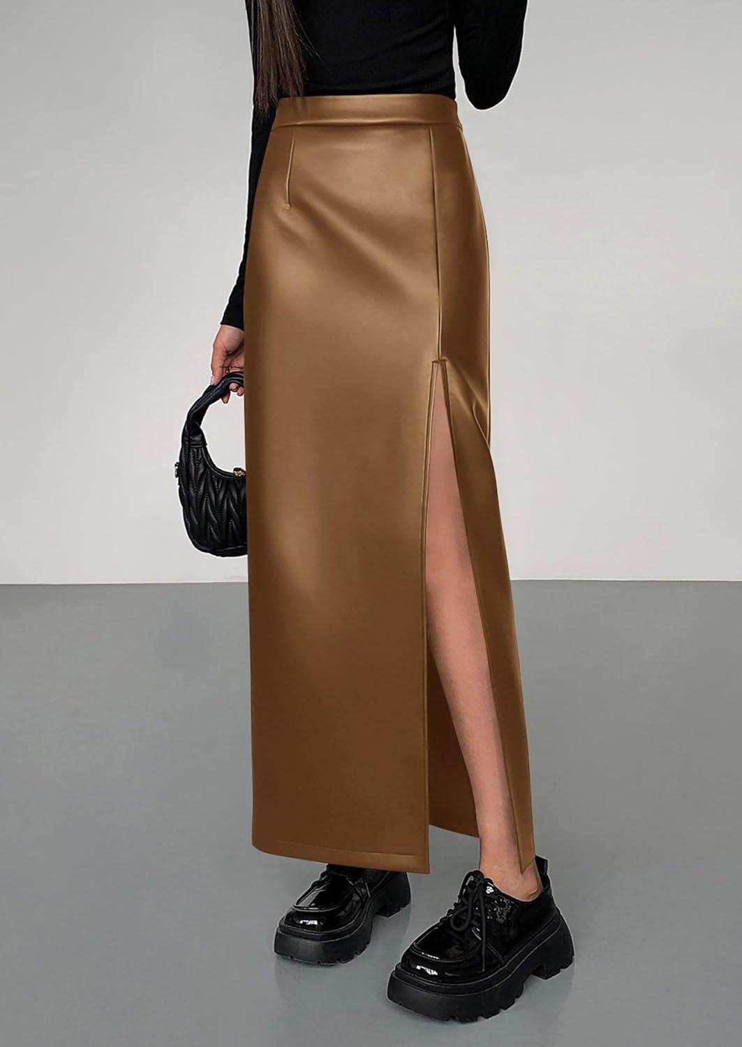 PRETTYGARDEN Womens Faux Leather Skirts 2025 Fall Fashion Bodycon High Waisted Slit Work Office Winter Maxi Long Pencil Skirt(Brown)