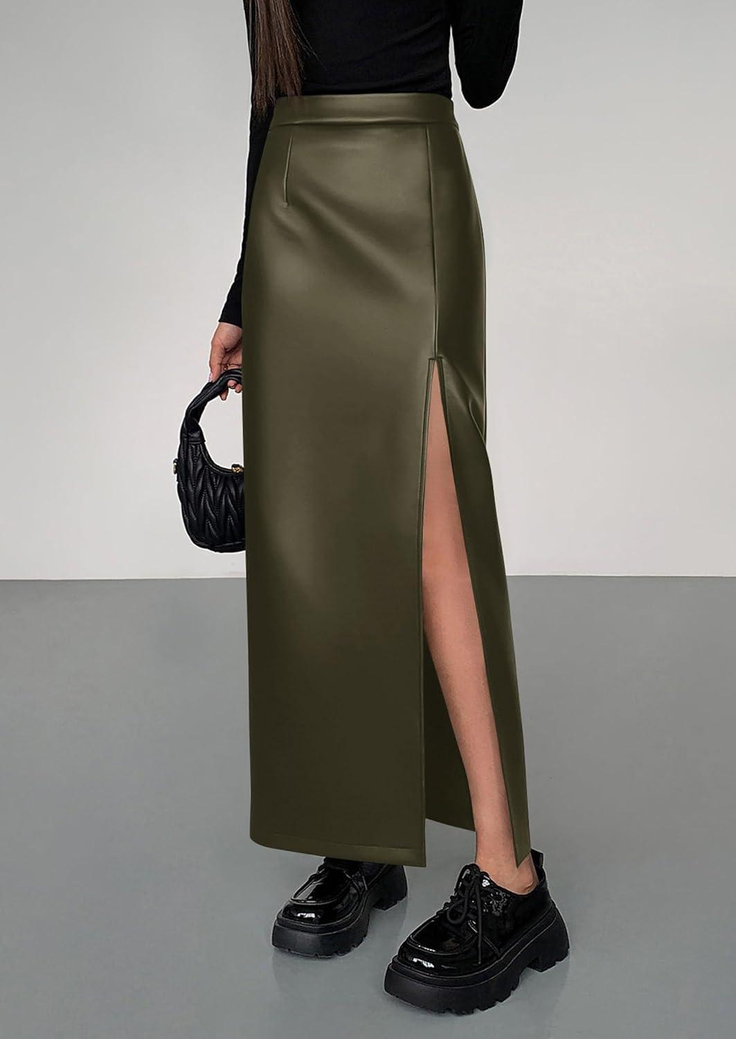 PRETTYGARDEN Womens Faux Leather Skirts 2025 Fall Fashion Bodycon High Waisted Slit Work Office Winter Maxi Long Pencil Skirt(Dark Army Green)