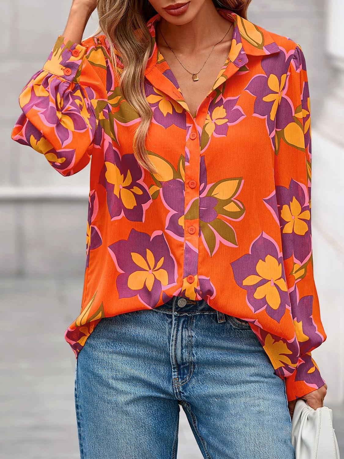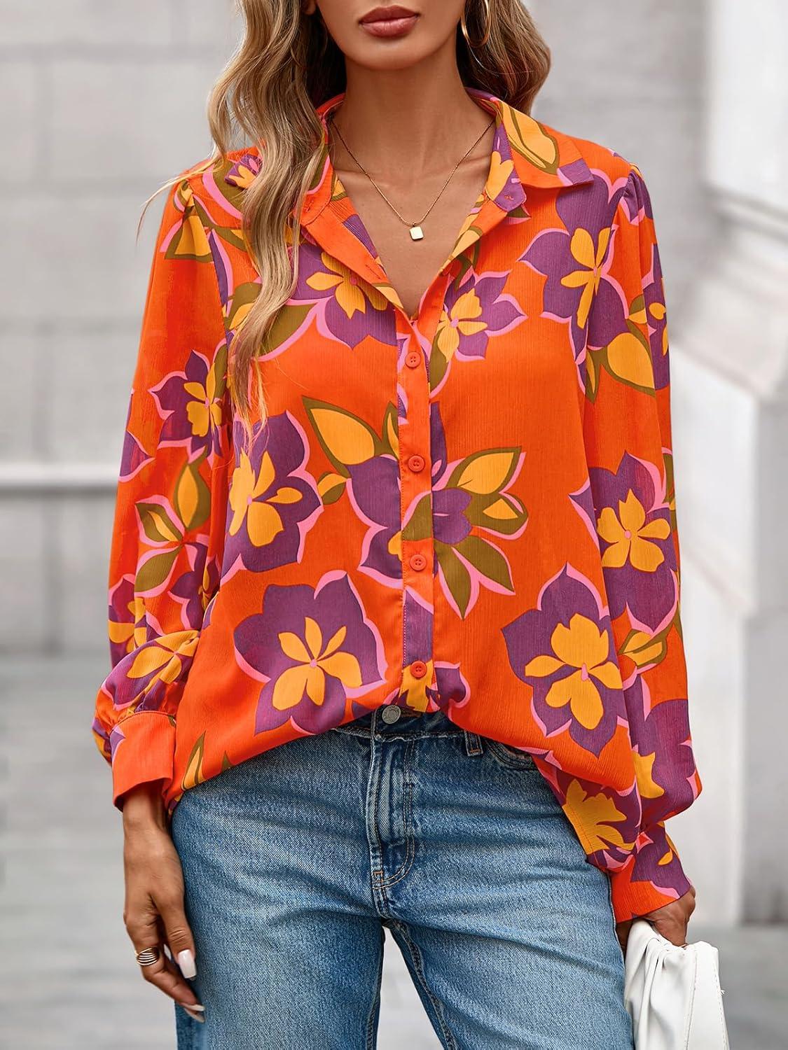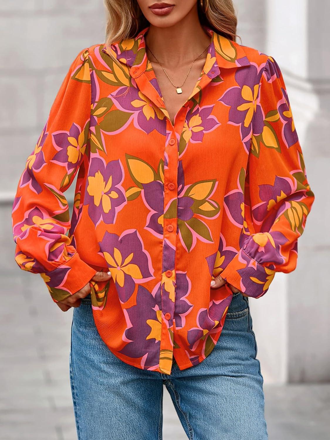 PRETTYGARDEN Women’s Floral Blouses Dressy Casual V Neck Button Down Shirts Lantern Long Sleeve Boho Chiffon Fall Tops 2025(Floral Orange Purple)