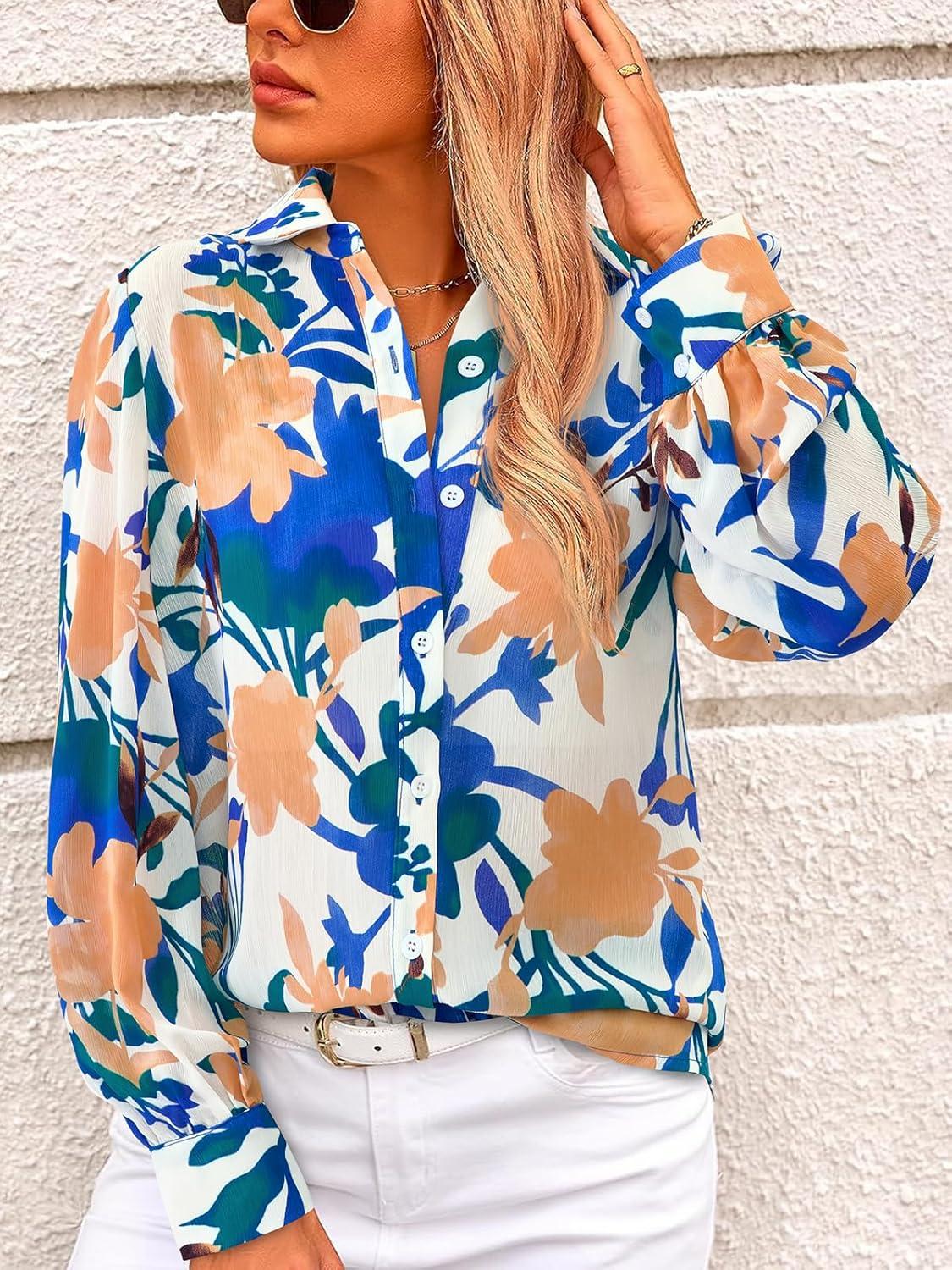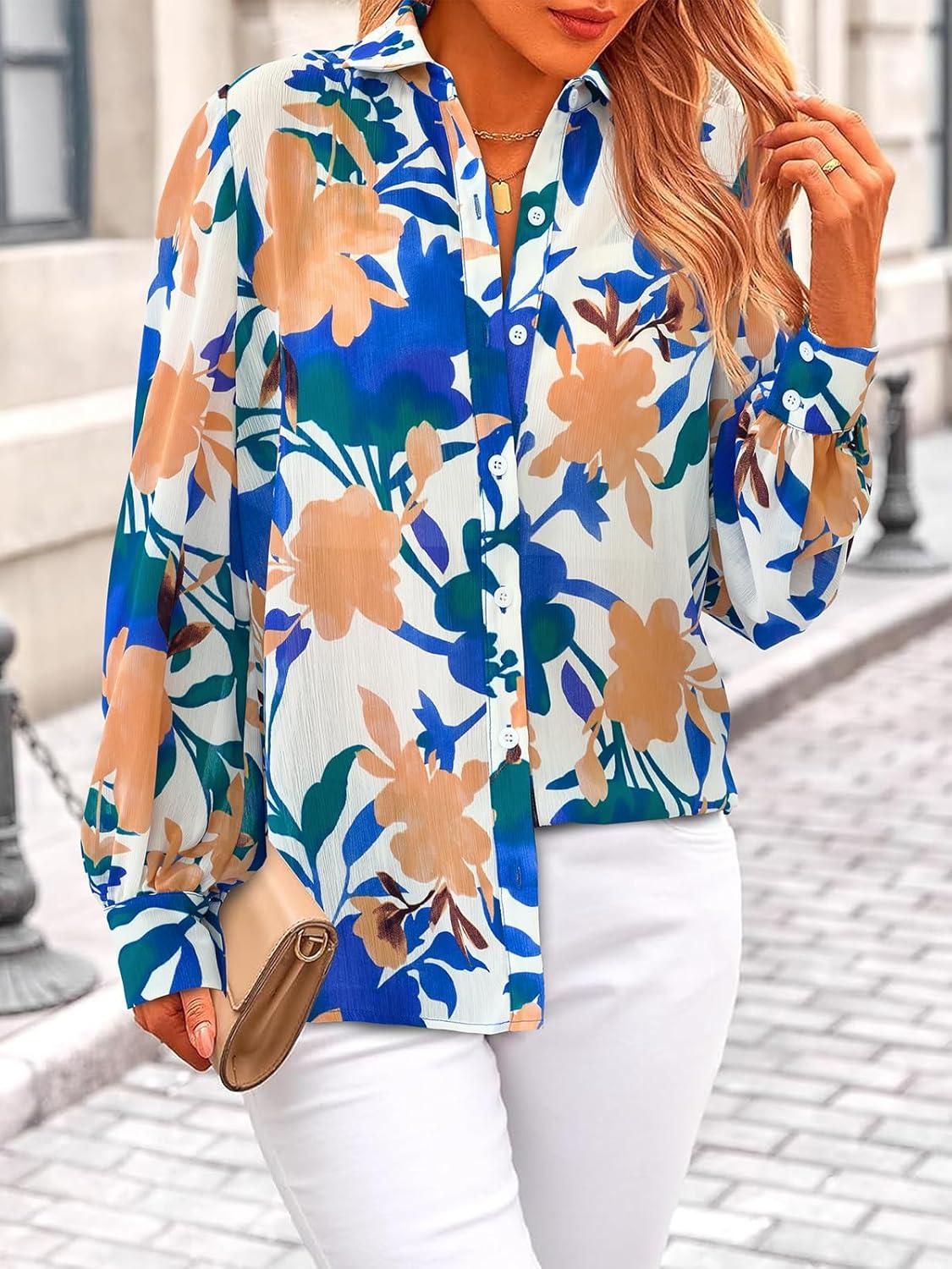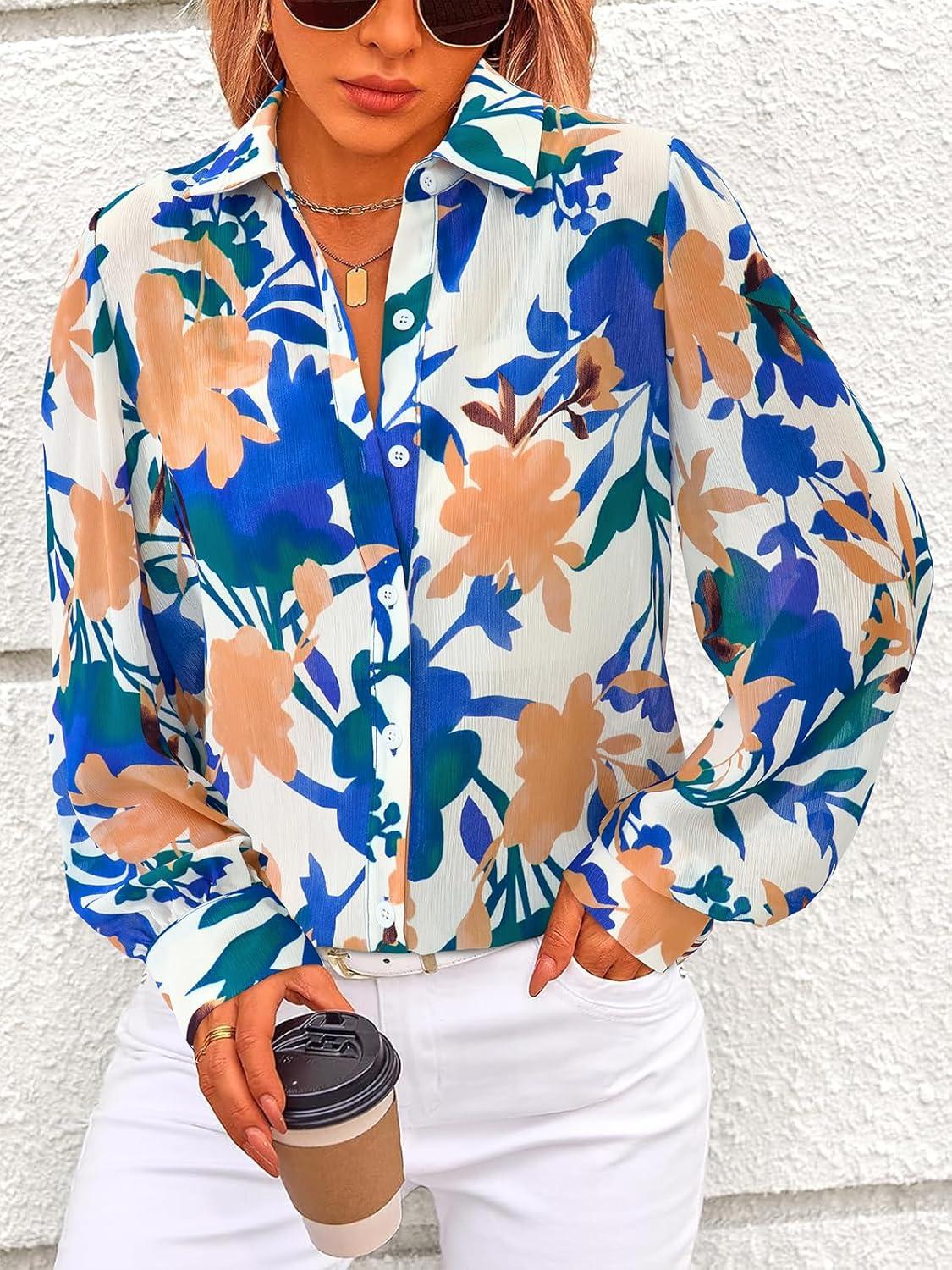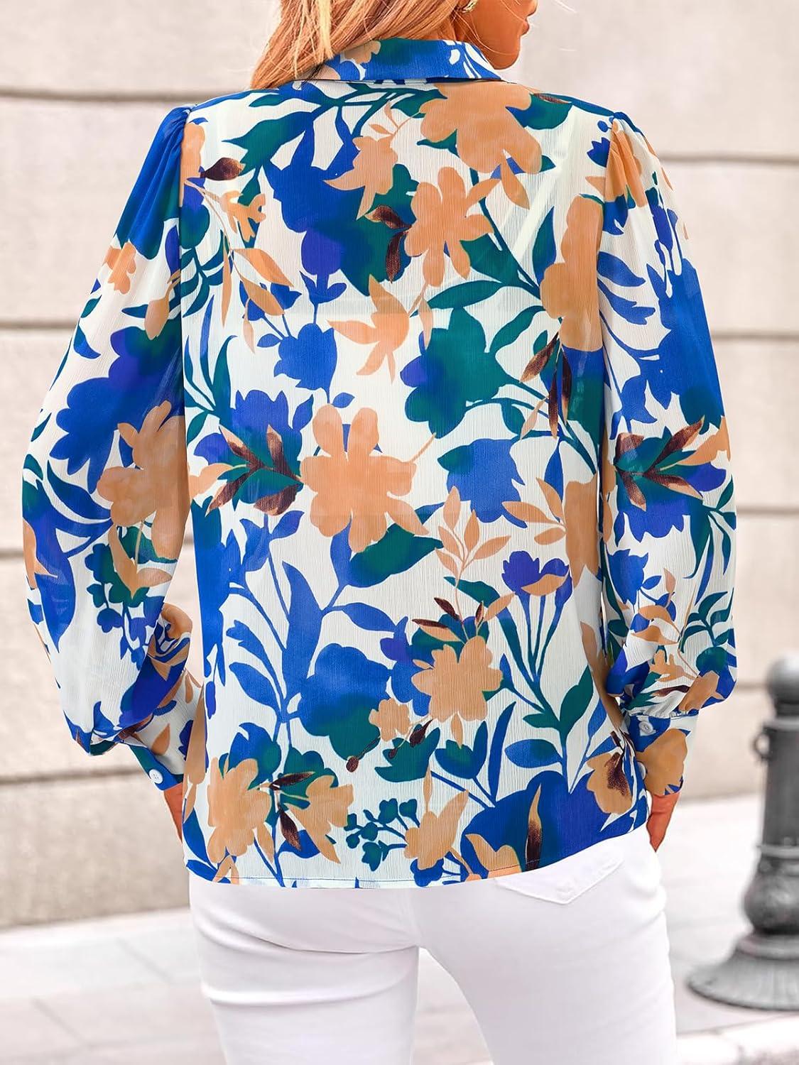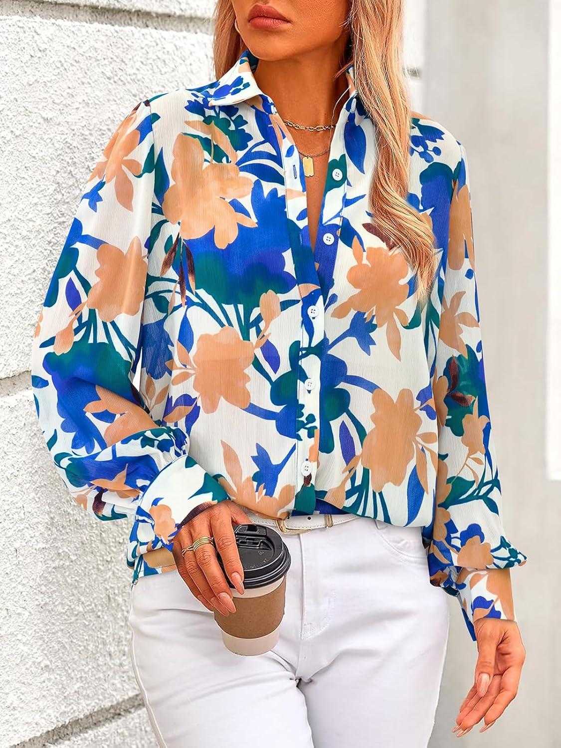 PRETTYGARDEN Women's Floral Blouses Dressy Casual V Neck Button Down Shirts Lantern Long Sleeve Boho Chiffon Fall Tops 2025(Floral White Blue)