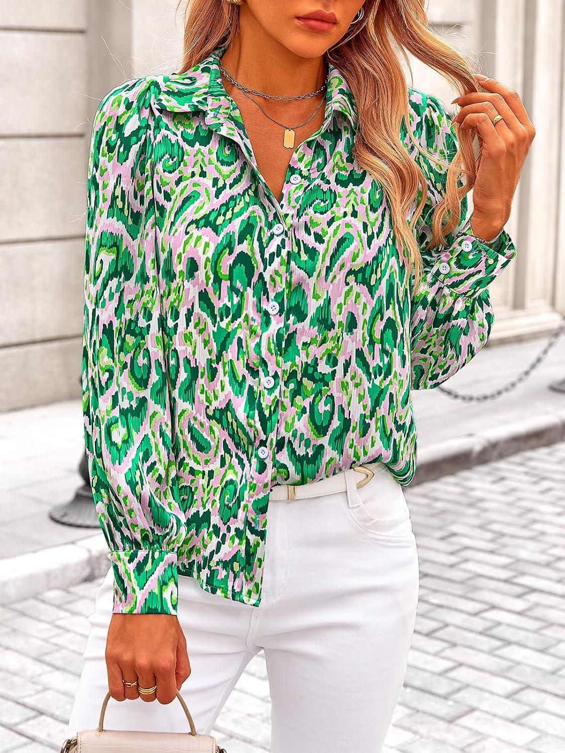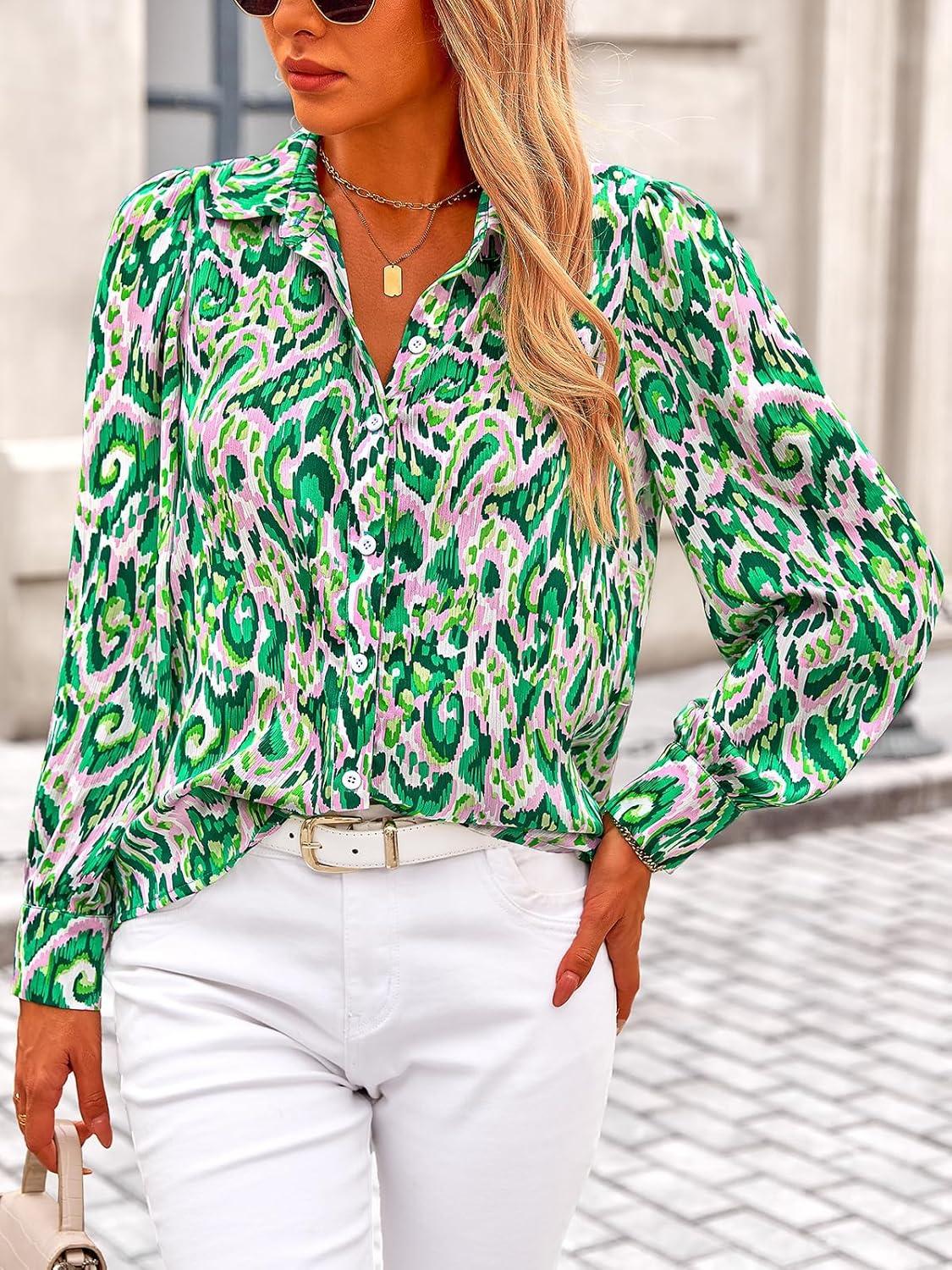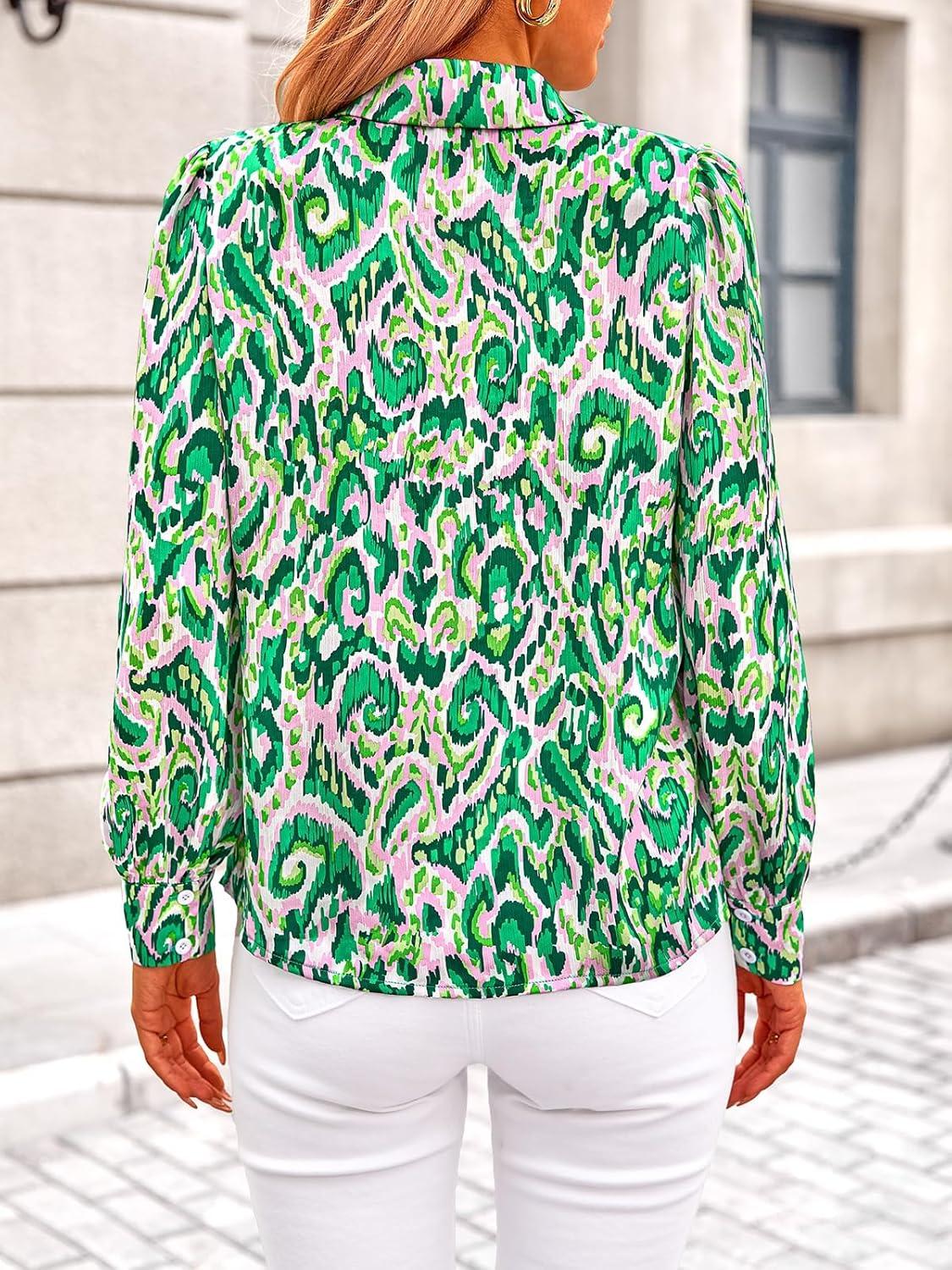 PRETTYGARDEN Women’s Floral Blouses Dressy Casual V Neck Button Down Shirts Lantern Long Sleeve Boho Chiffon Fall Tops 2025(Green)