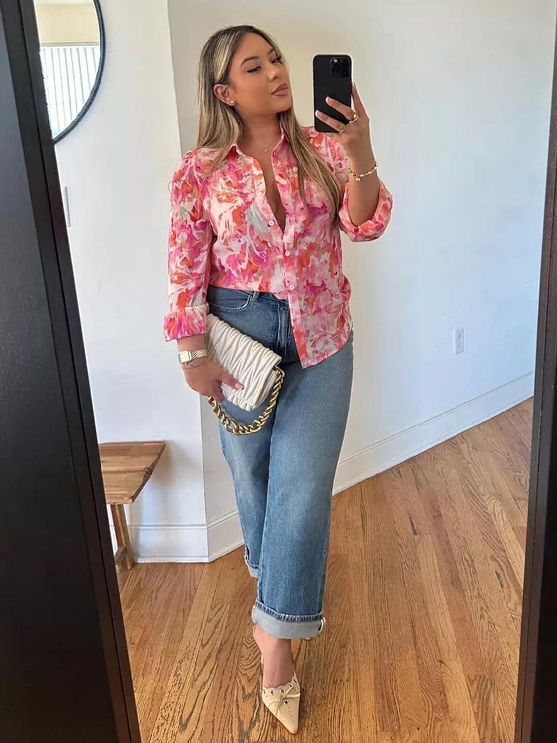 PRETTYGARDEN Women’s Floral Blouses Dressy Casual V Neck Button Down Shirts Lantern Long Sleeve Boho Chiffon Fall Tops 2025(Pink Floral)