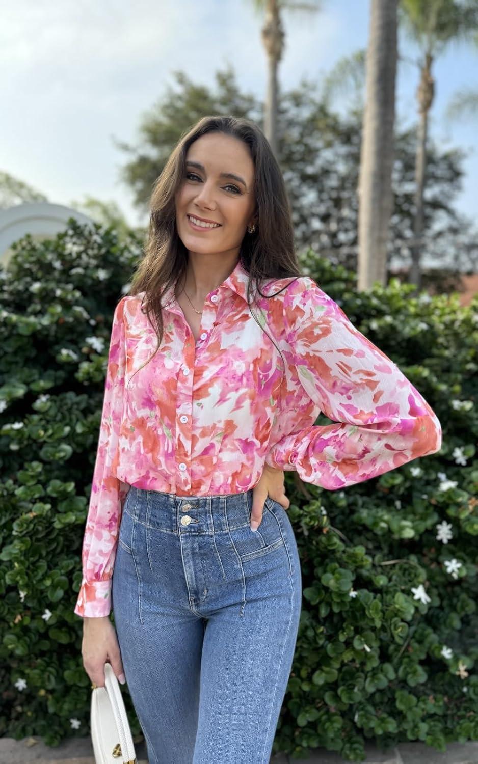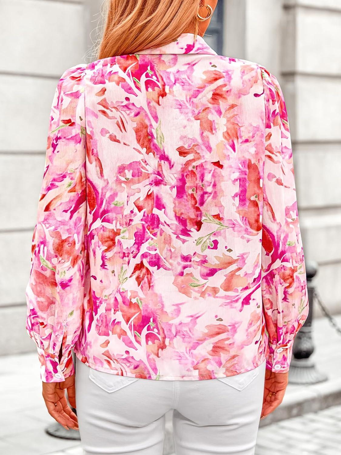 PRETTYGARDEN Women's Floral Blouses Dressy Casual V Neck Button Down Shirts Lantern Long Sleeve Boho Chiffon Fall Tops 2025(Pink Floral)