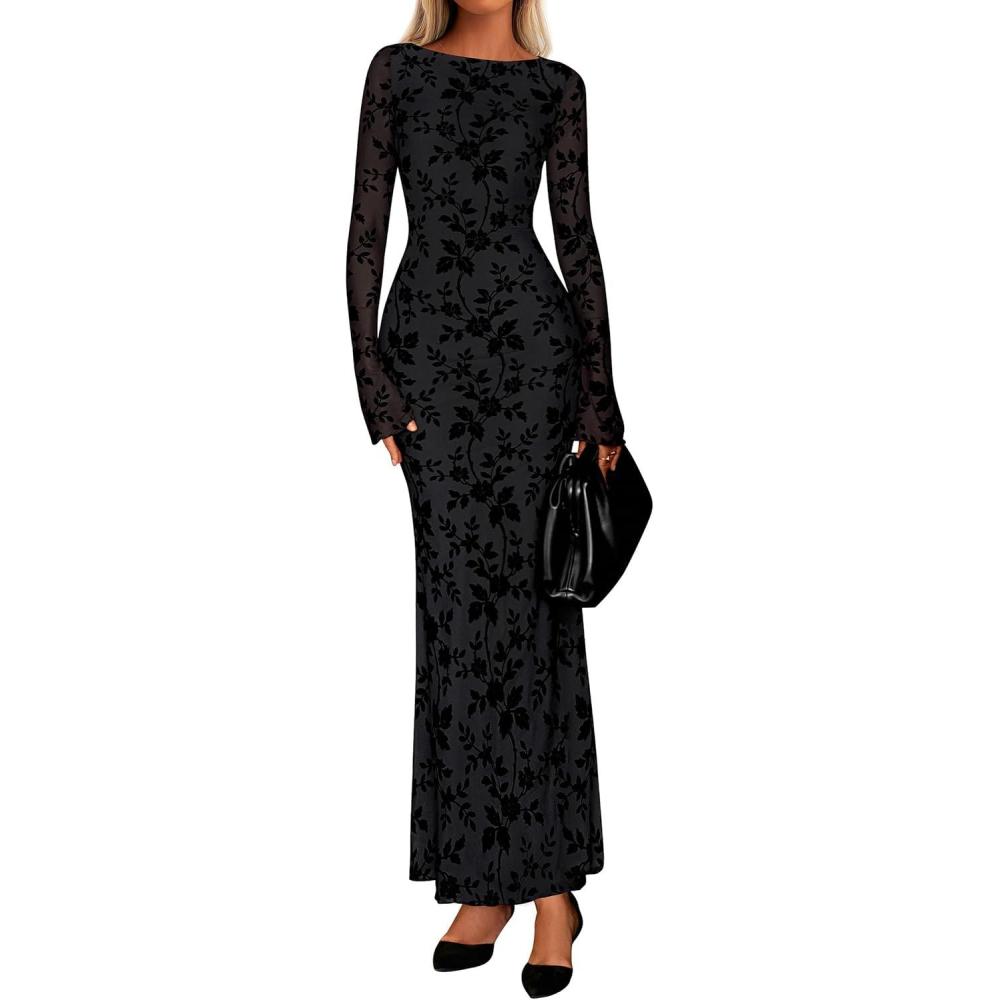 PRETTYGARDEN Women’s Floral Bodycon Maxi Dress 2025 Fall Elegant Mesh Long Sleeve Formal Wedding Guest Cocktail Dresses(Black)