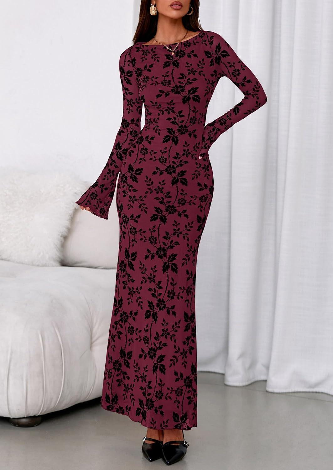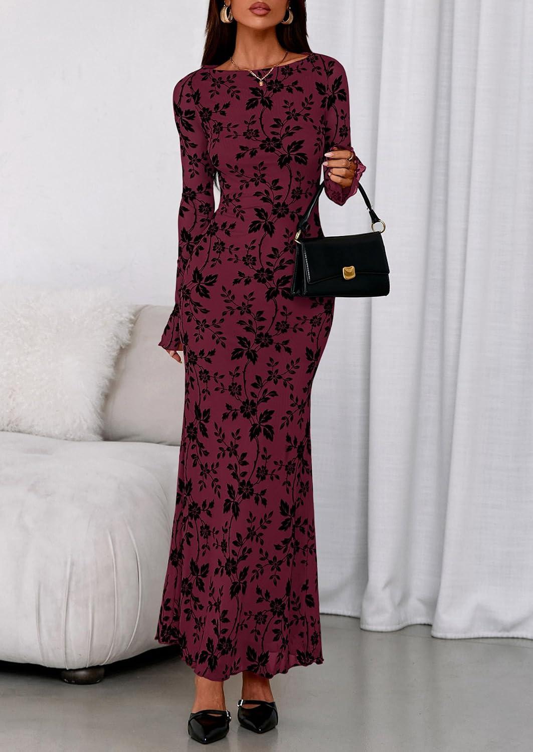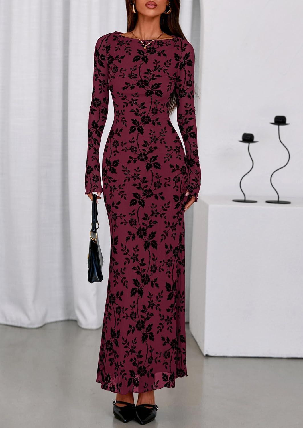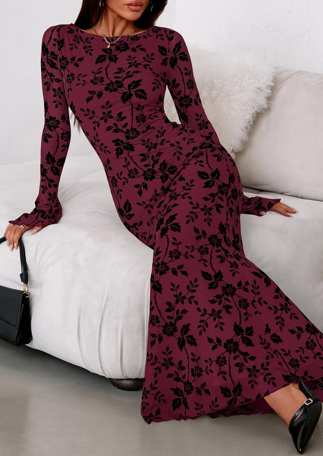 PRETTYGARDEN Women's Floral Bodycon Maxi Dress 2025 Fall Elegant Mesh Long Sleeve Formal Wedding Guest Cocktail Dresses(Burgundy)