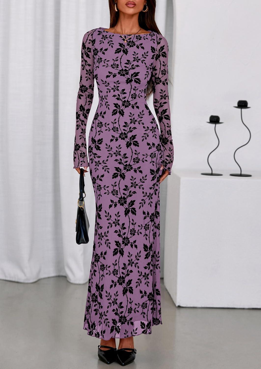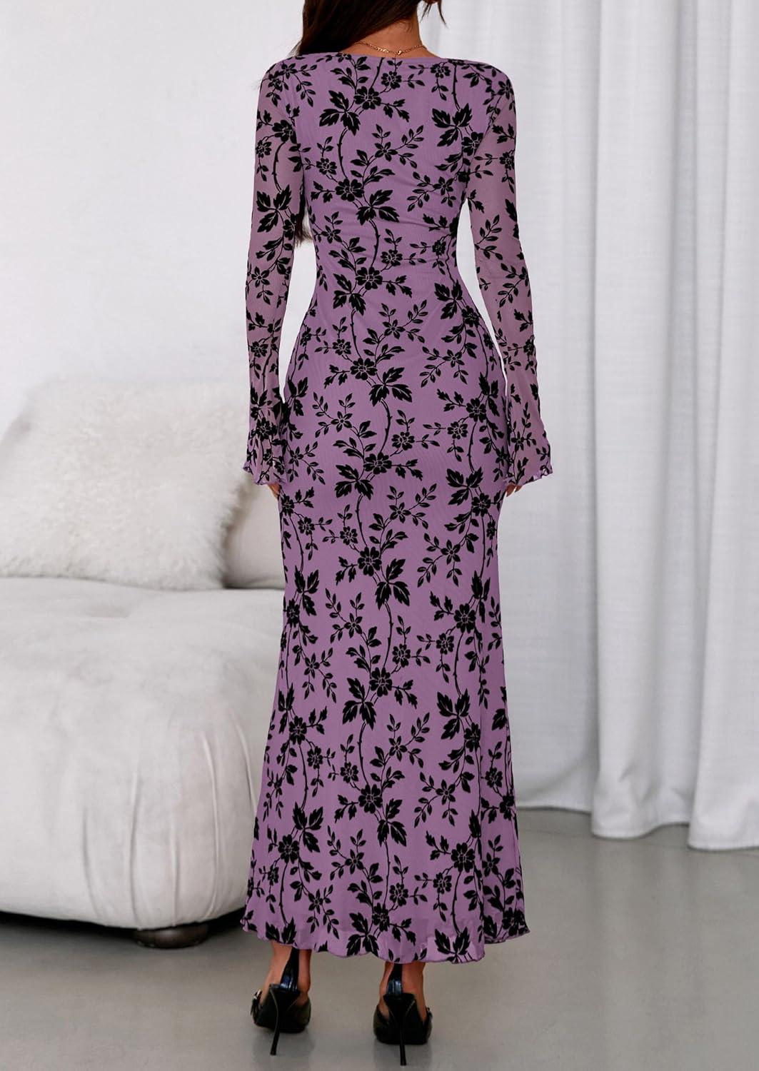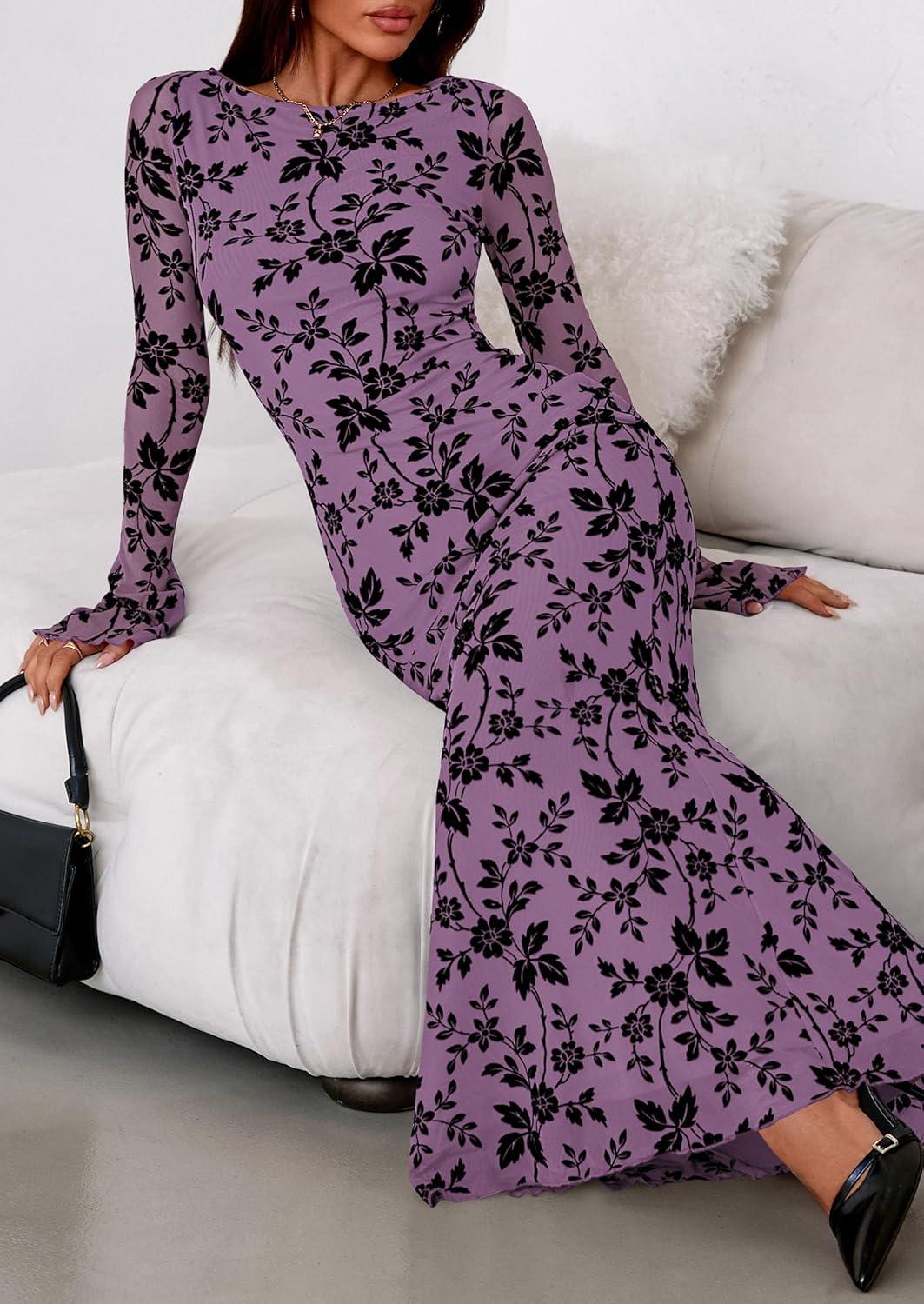 PRETTYGARDEN Women's Floral Bodycon Maxi Dress 2025 Fall Elegant Mesh Long Sleeve Formal Wedding Guest Cocktail Dresses(Purple)