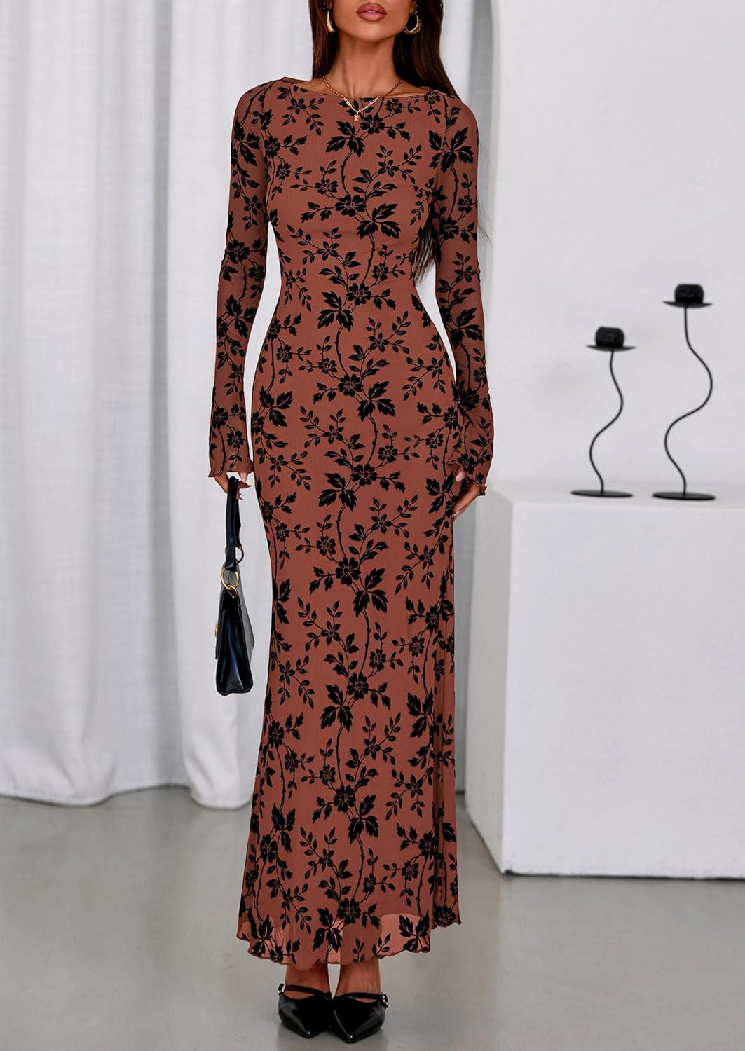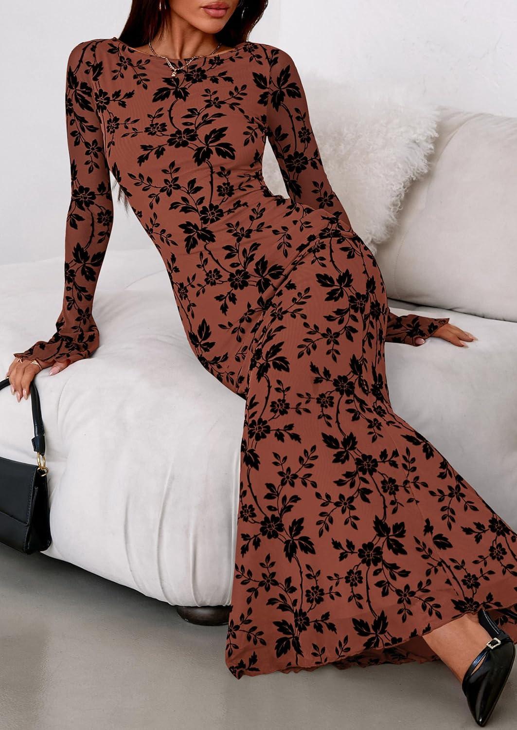 PRETTYGARDEN Women's Floral Bodycon Maxi Dress 2025 Fall Elegant Mesh Long Sleeve Formal Wedding Guest Cocktail Dresses(Rust)