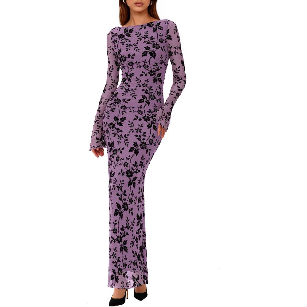 PRETTYGARDEN Women’s Floral Bodycon Maxi Dress 2026 Spring Elegant Mesh Long Sleeve Formal Wedding Guest Cocktail Dresses(Purple)