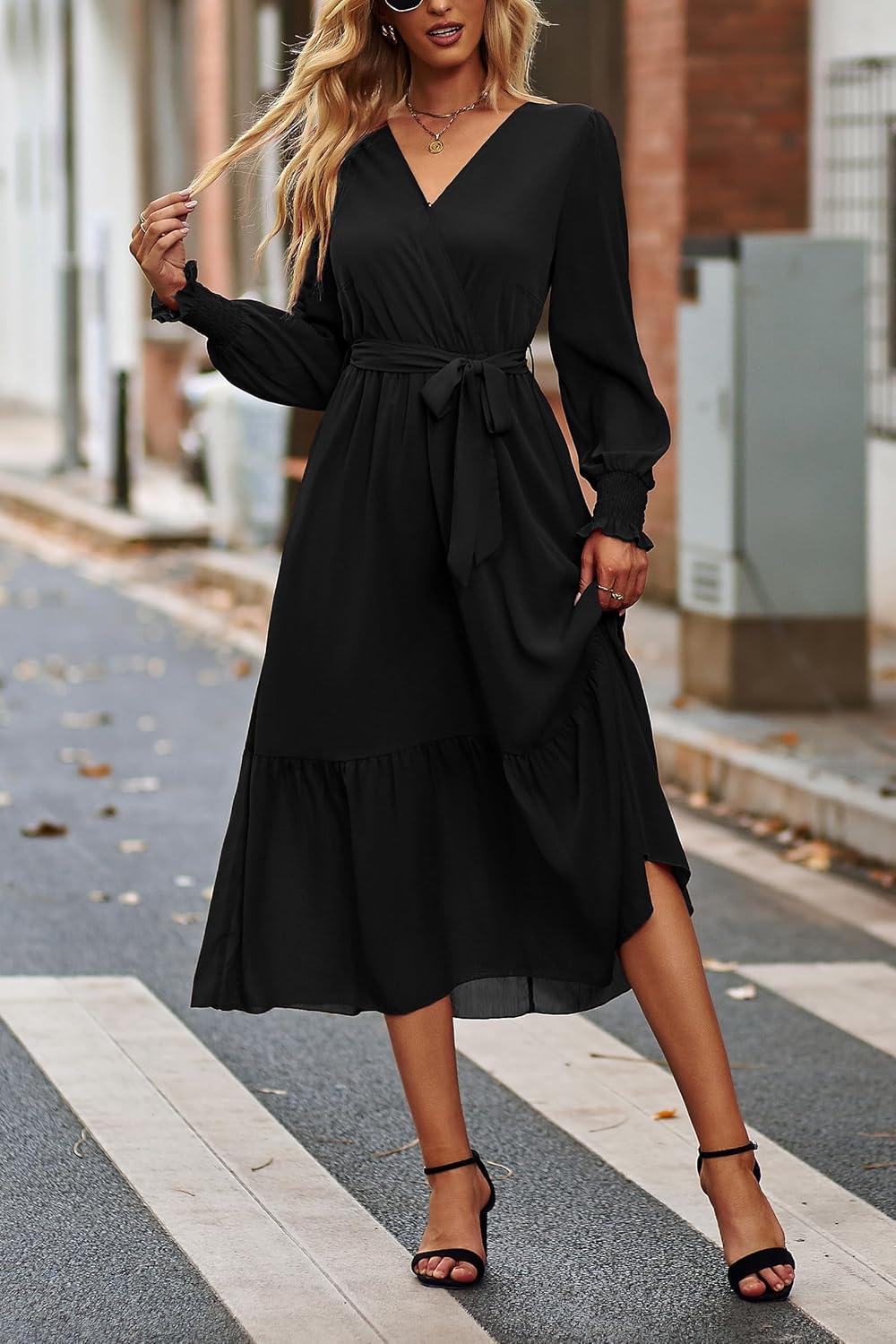 PRETTYGARDEN Women's Floral Boho Dress Fall Long Sleeve Wrap V Neck Ruffle Flowy Maxi Spring Wedding Guest Vacation Dresses(Solid Black)