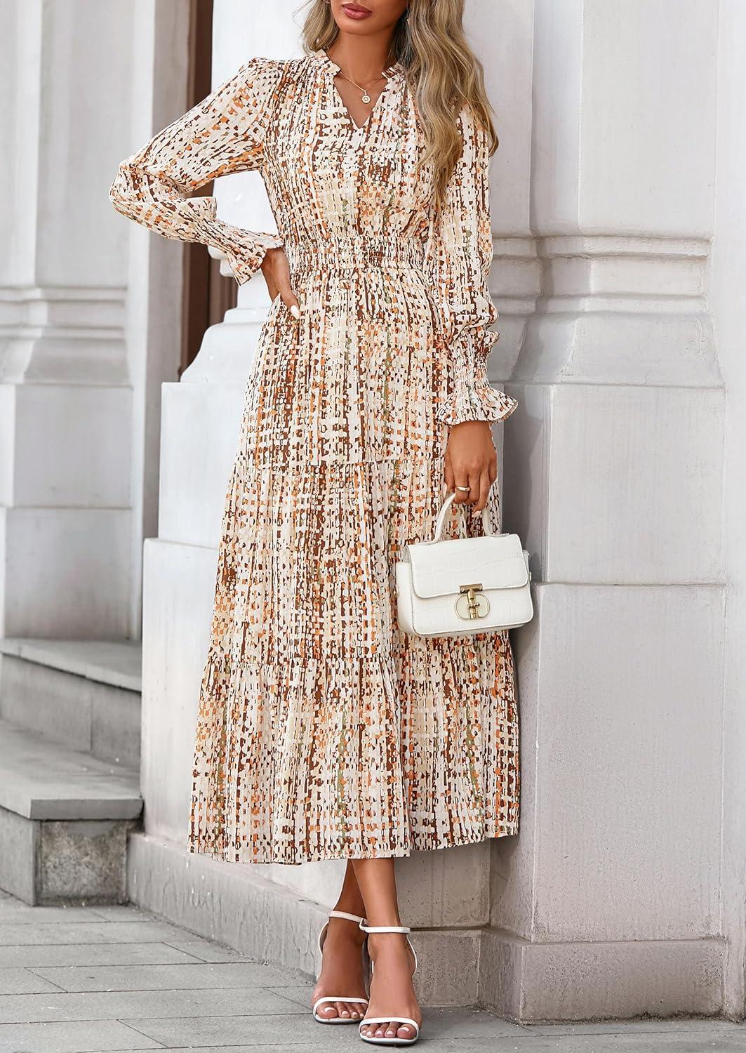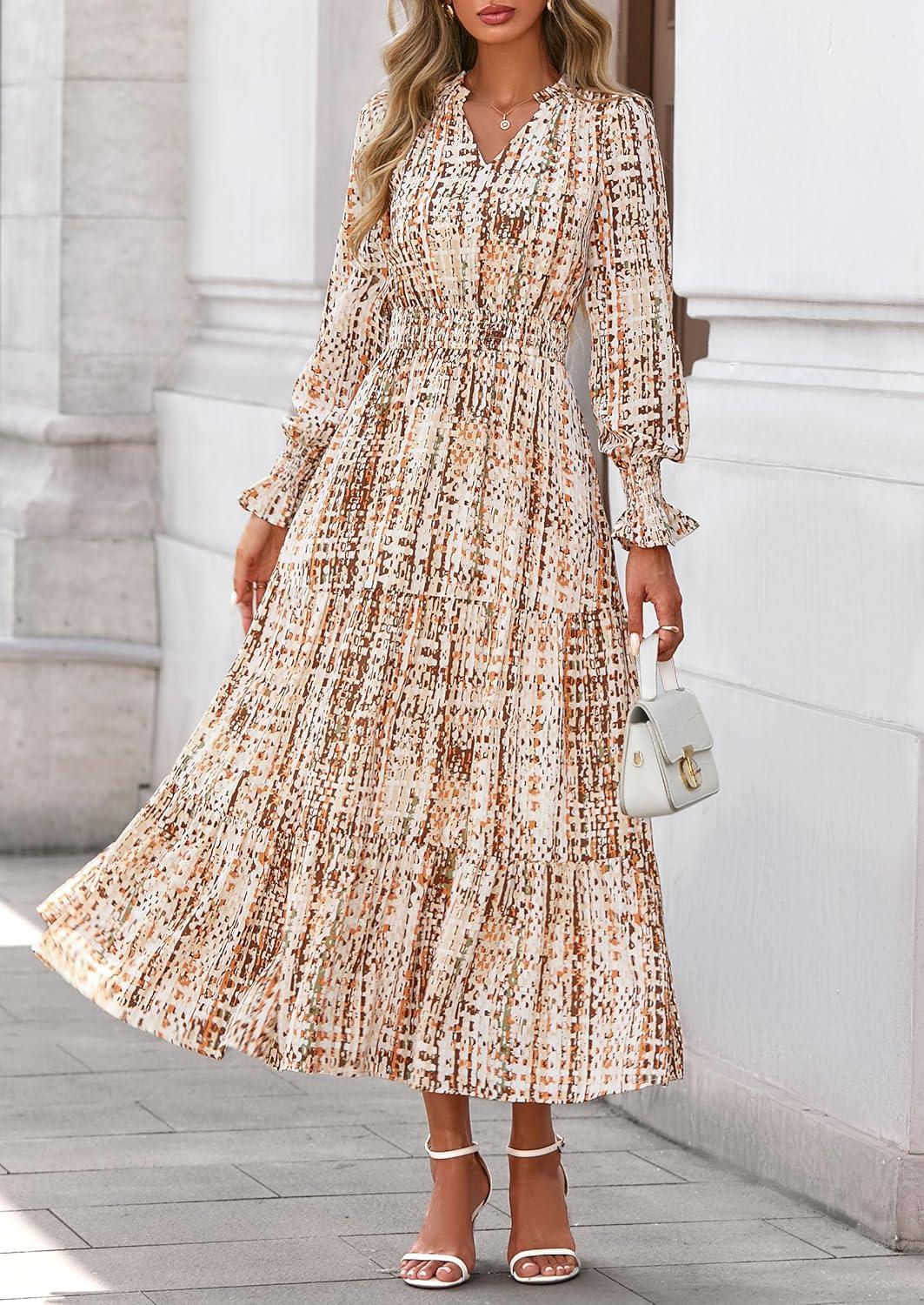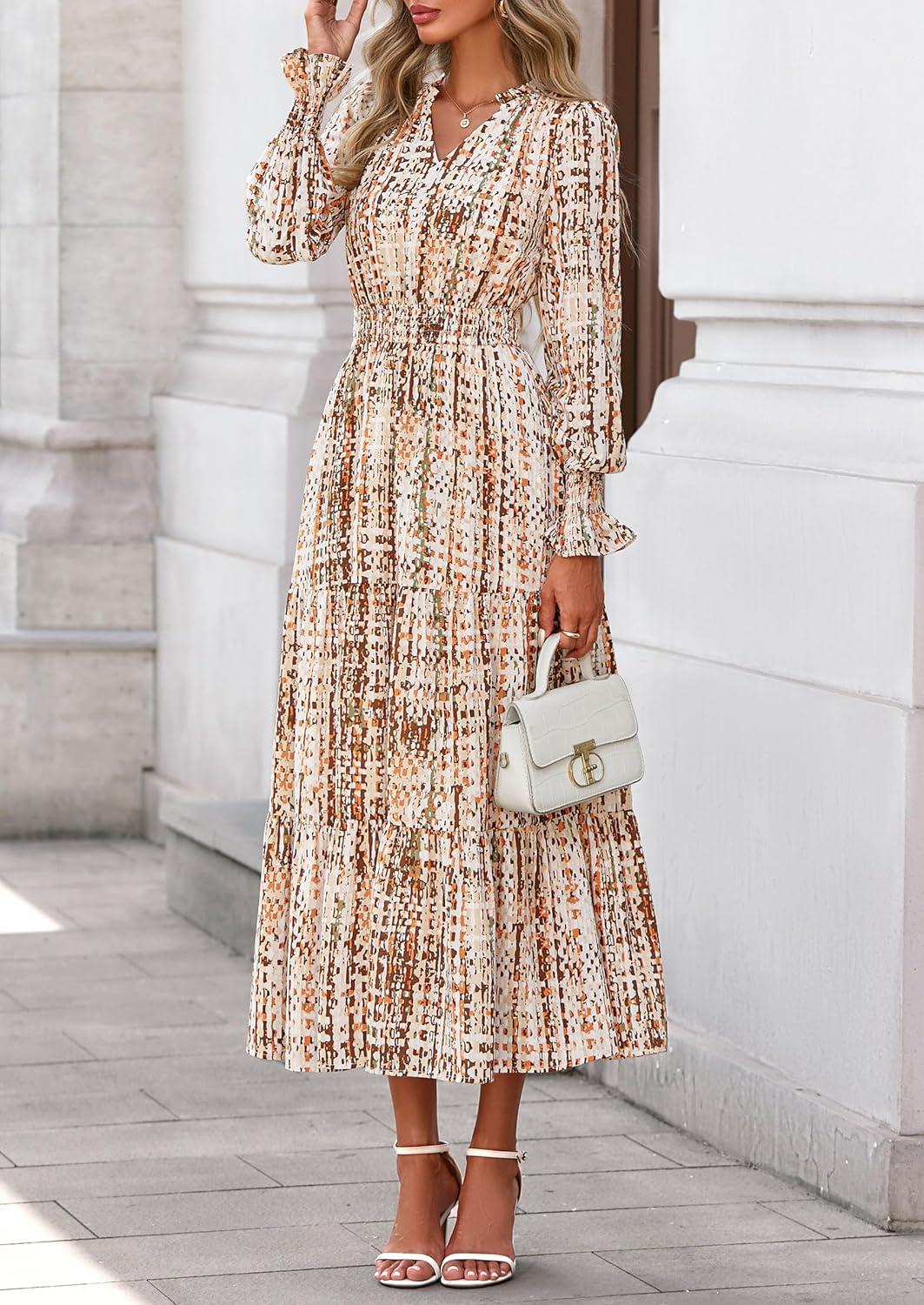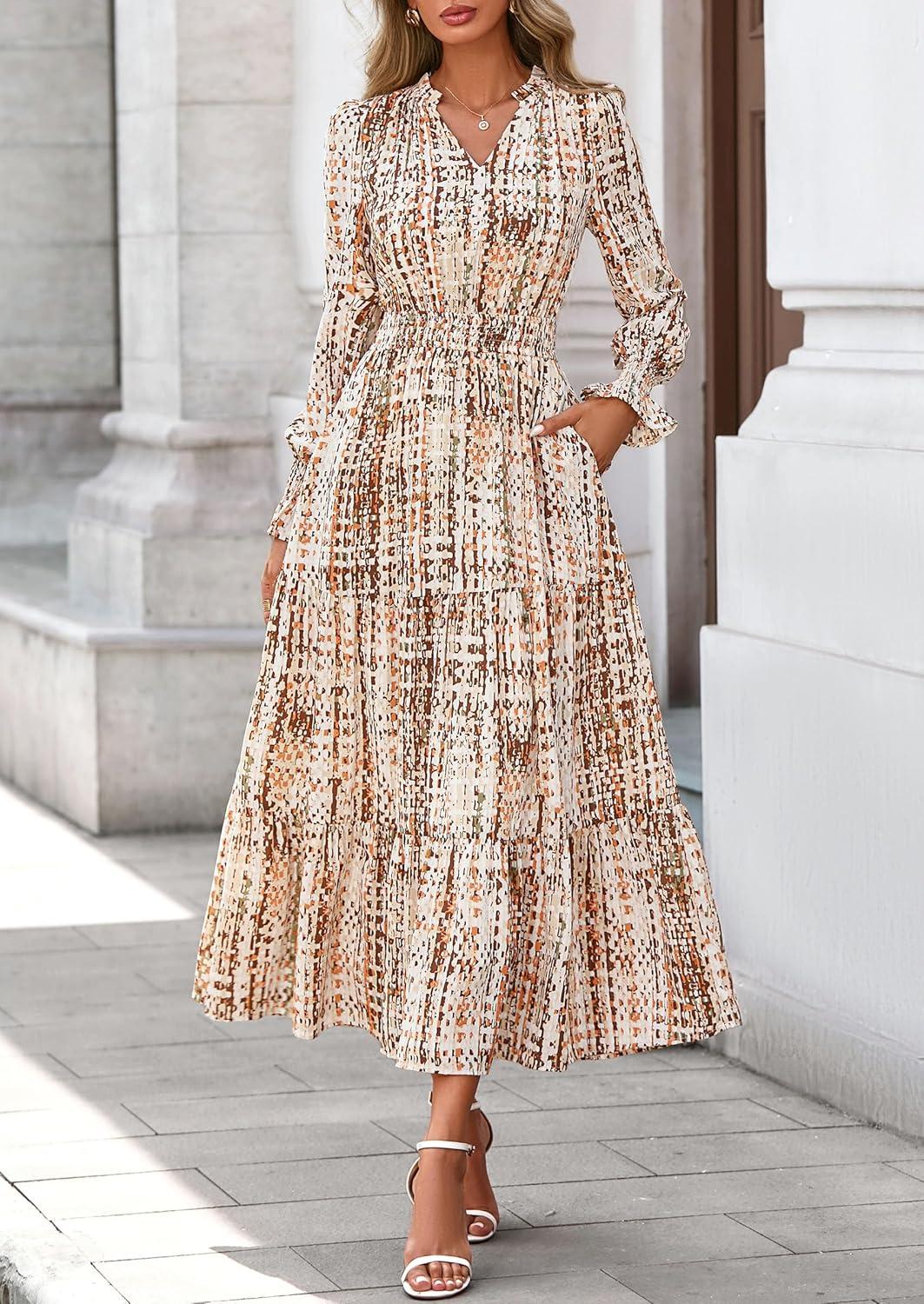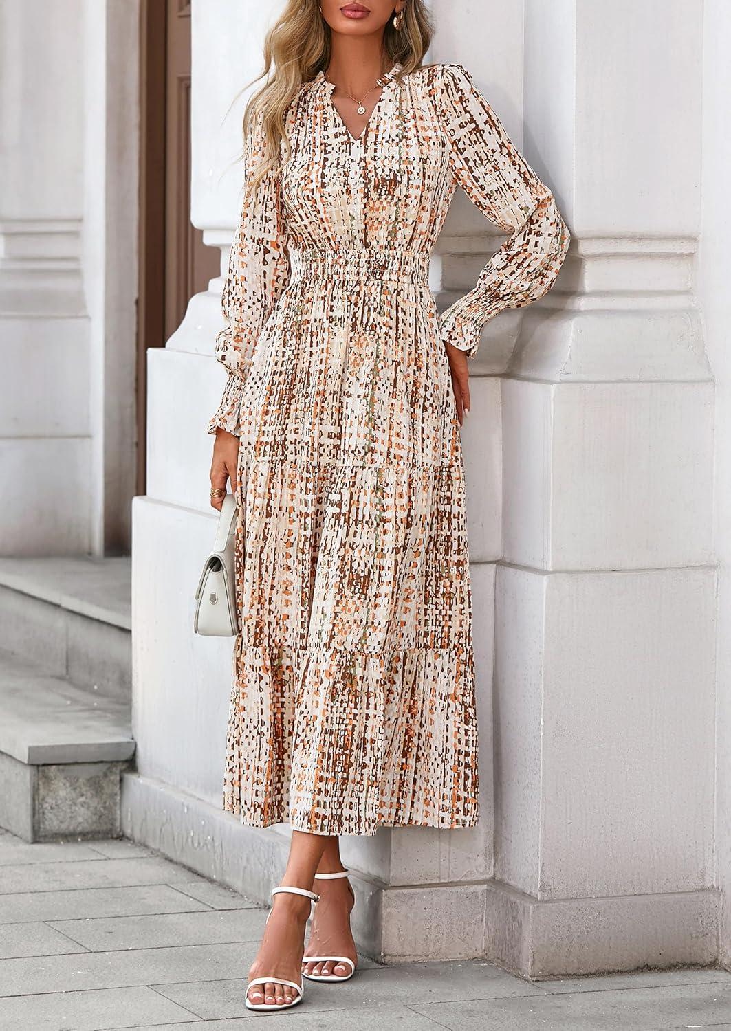 PRETTYGARDEN Women's Floral Maxi Dress 2025 Fall Long Sleeve V Neck Casual A Line Long Flowy Boho Party Dresses(Floral Khaki)