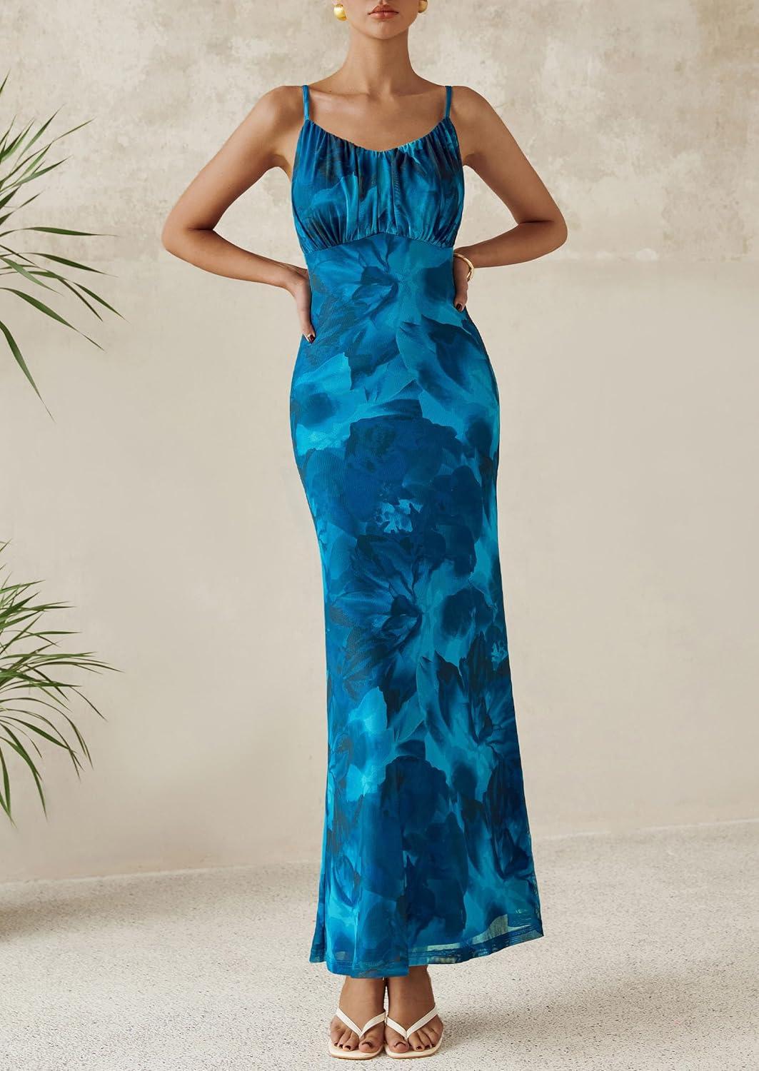PRETTYGARDEN Women's Floral Maxi Dress 2025 Summer Elegant Spaghetti Strap Mesh Bodycon Wedding Guest Long Dresses(Lake Blue Floral)