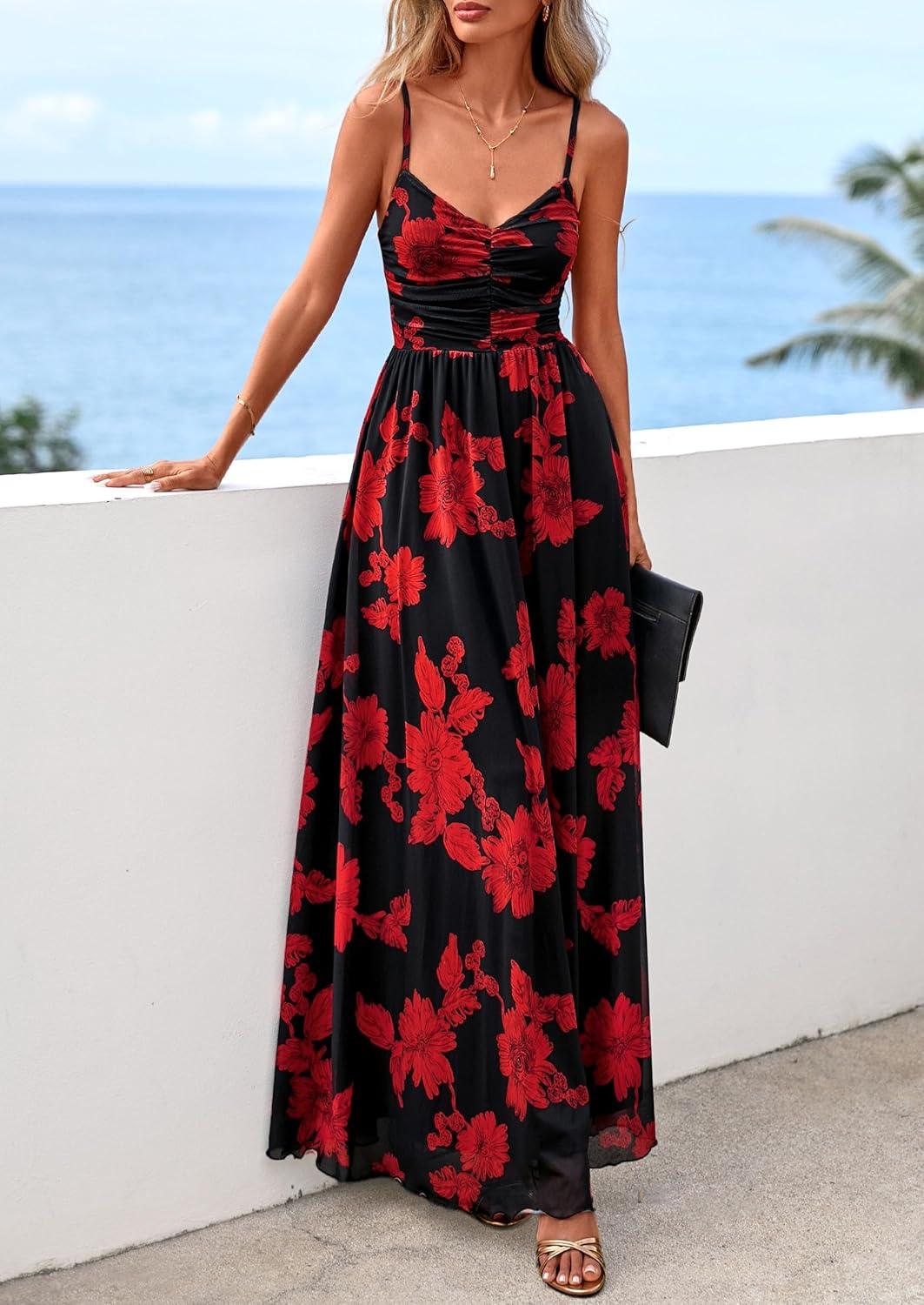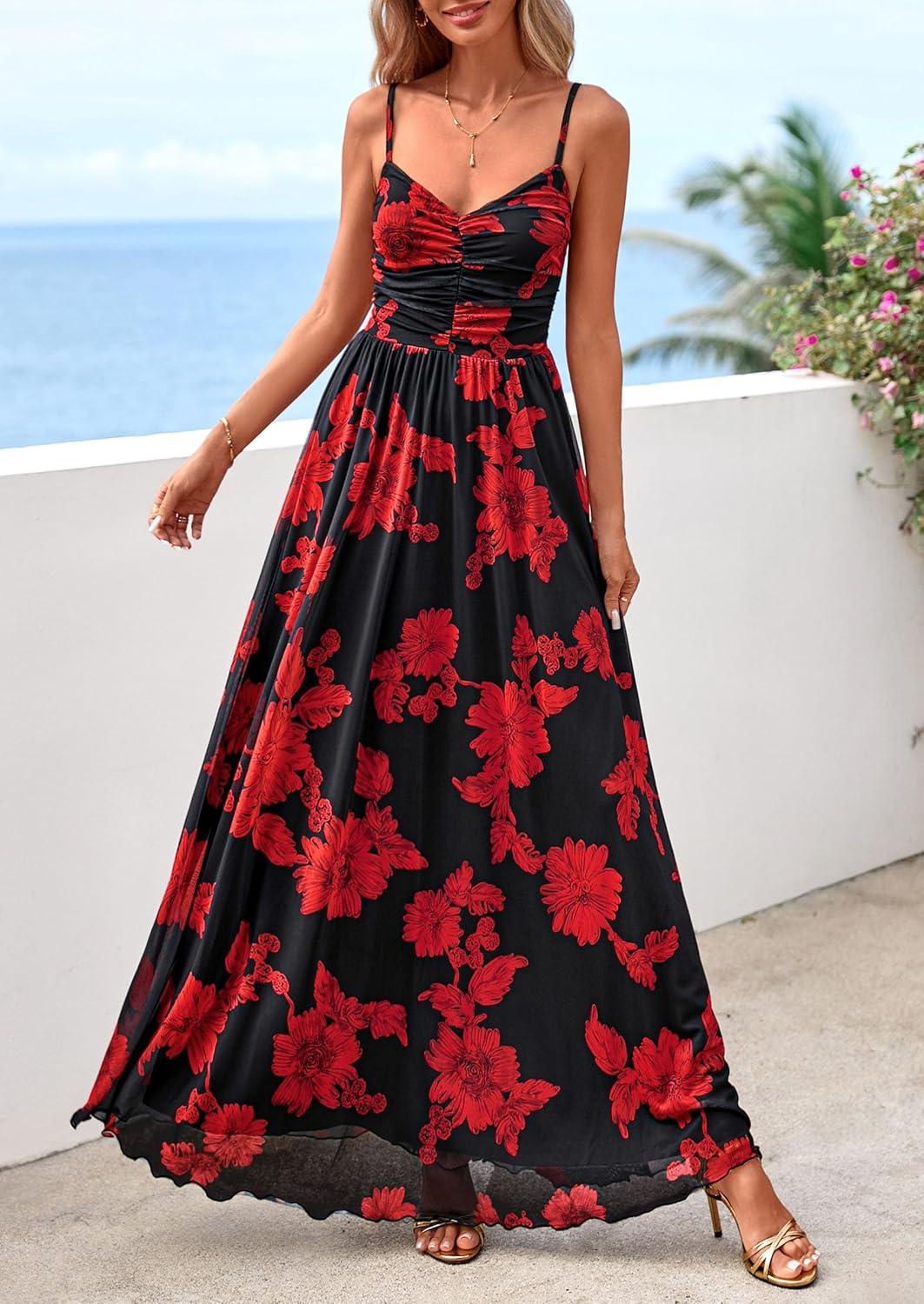 PRETTYGARDEN Women's Floral Maxi Dress Summer Outfits 2026 Spaghetti Strap Flowy Long Sundress Beach Vacation Boho Dresses(Black Red Flower)