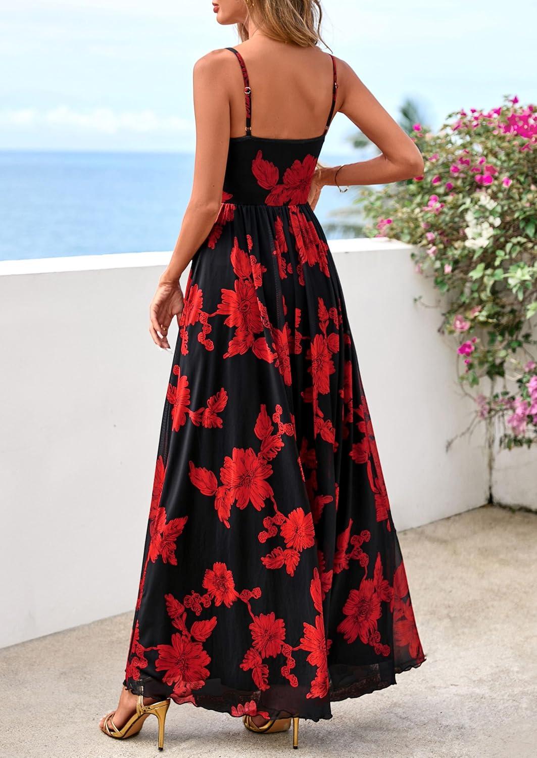PRETTYGARDEN Women’s Floral Maxi Dress Summer Outfits 2026 Spaghetti Strap Flowy Long Sundress Beach Vacation Boho Dresses(Black Red Flower)