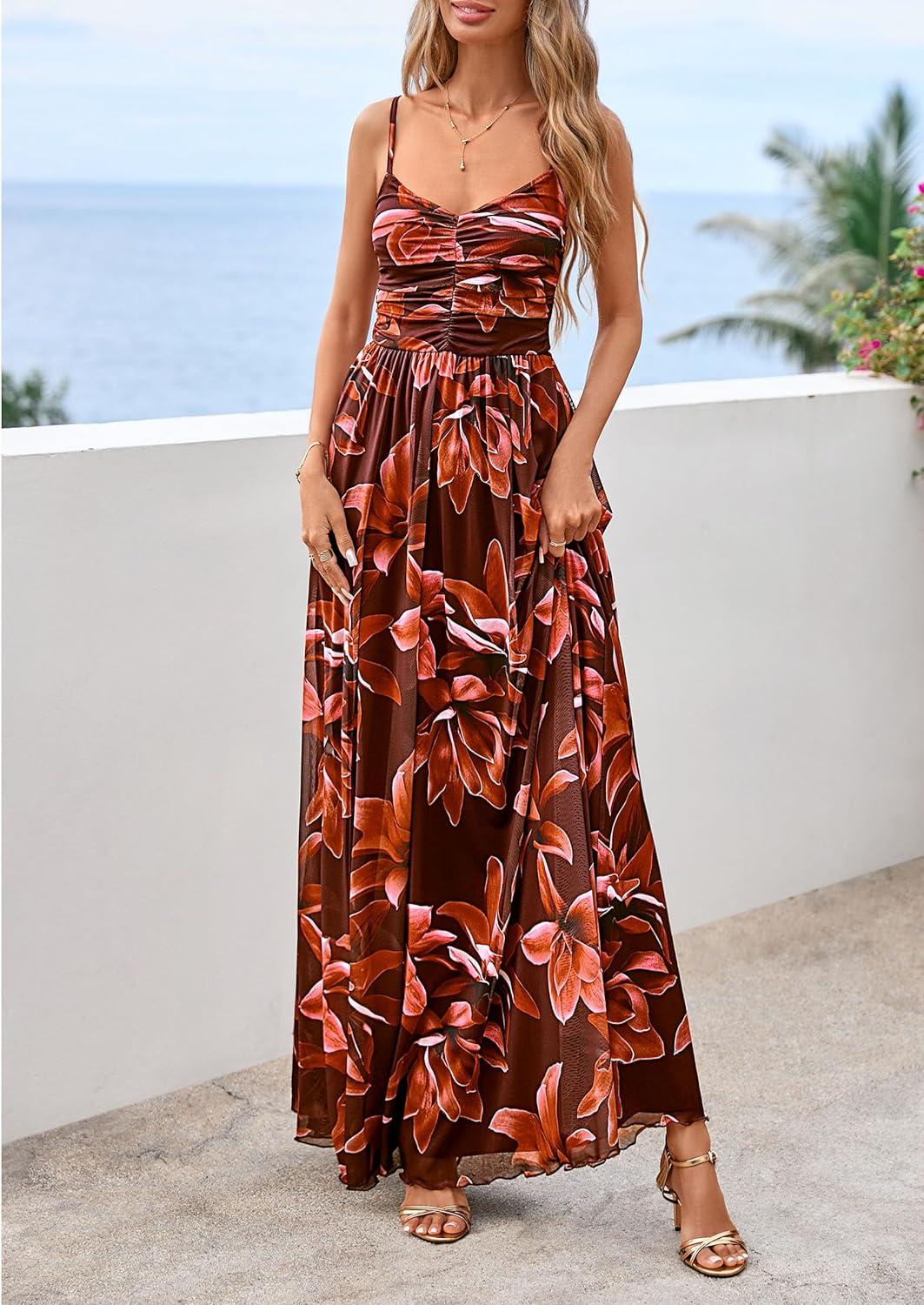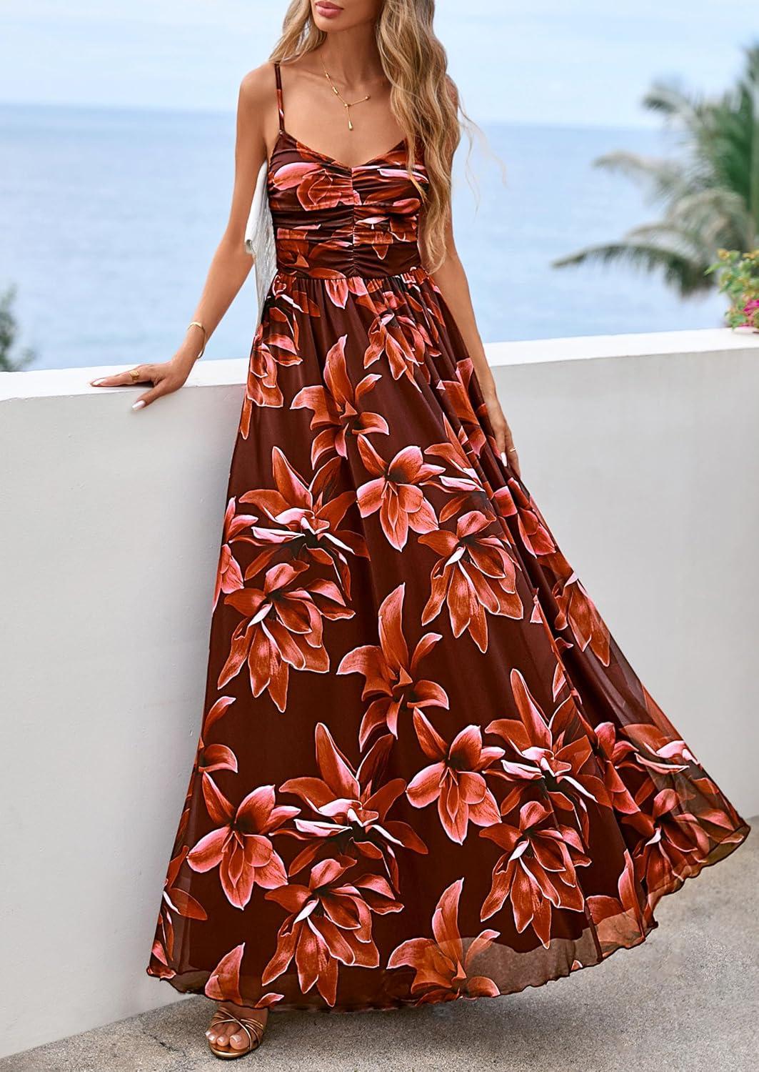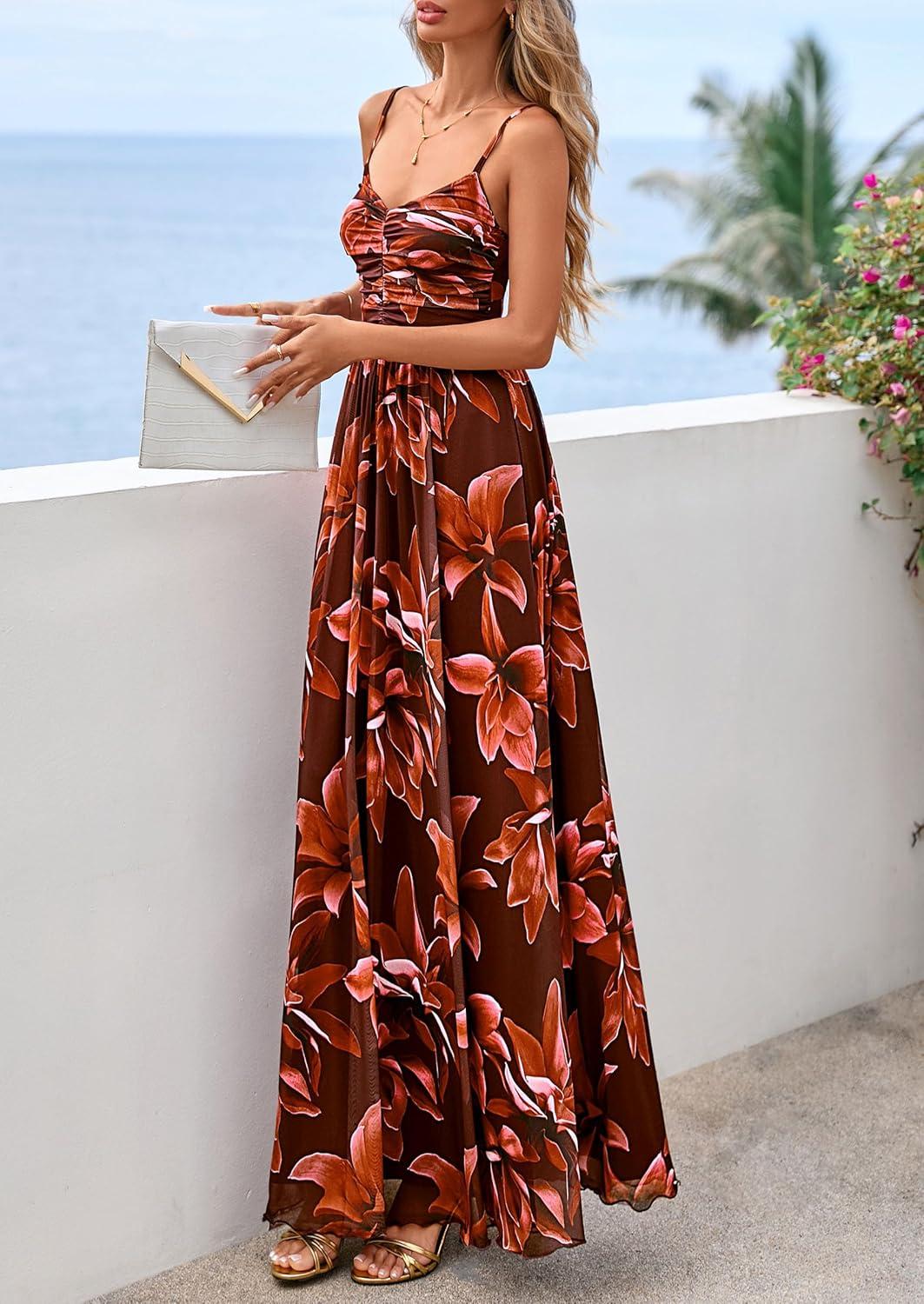 PRETTYGARDEN Women's Floral Maxi Dress Summer Outfits 2026 Spaghetti Strap Flowy Long Sundress Beach Vacation Boho Dresses(Brown Floral)