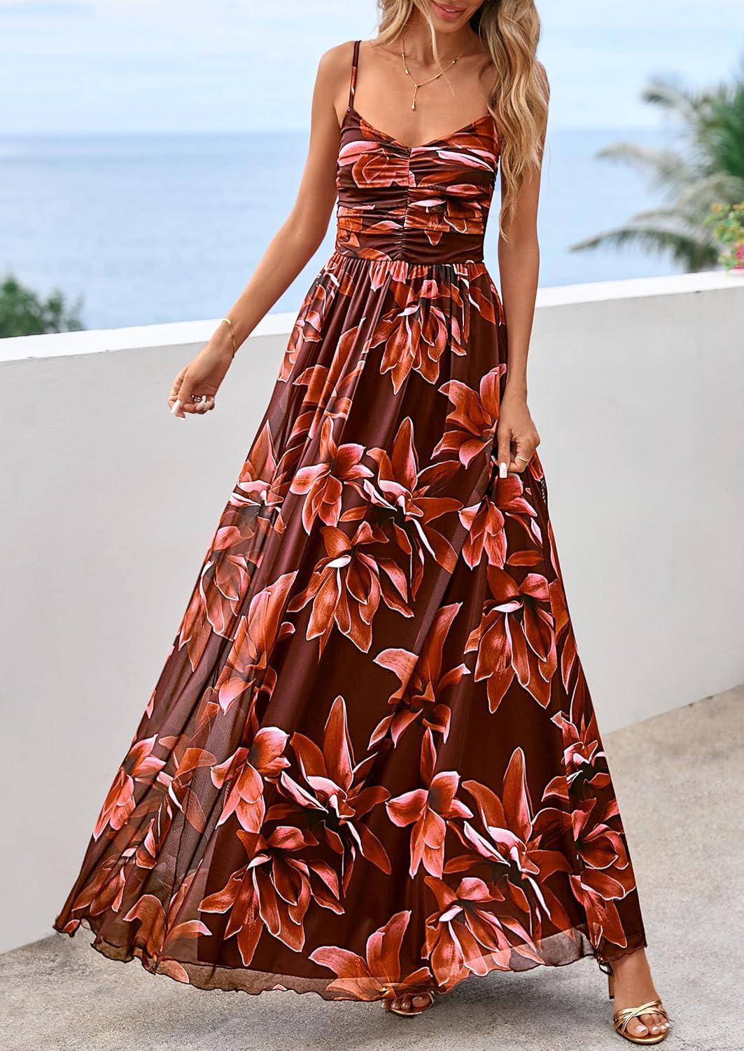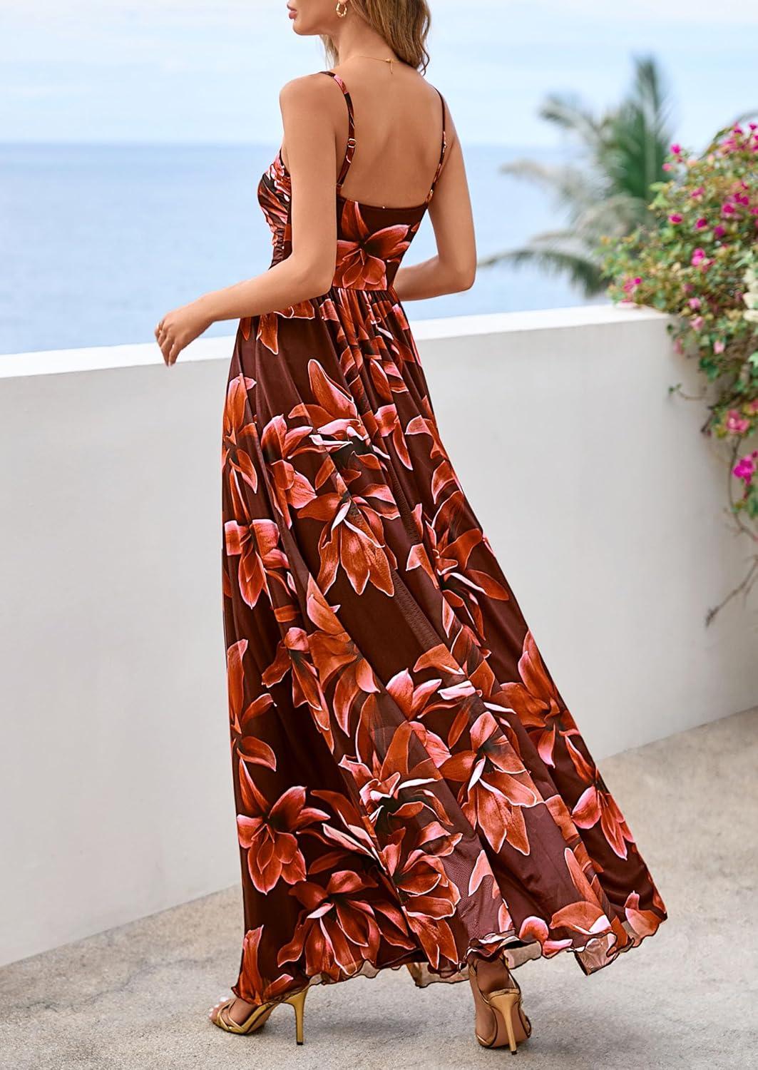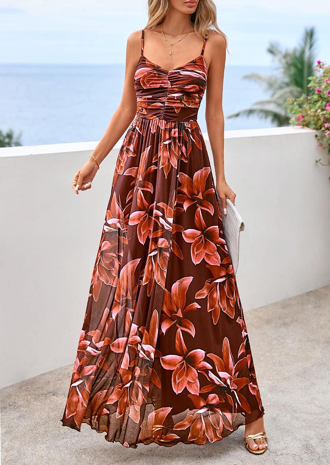 PRETTYGARDEN Women's Floral Maxi Dress Summer Outfits 2026 Spaghetti Strap Flowy Long Sundress Beach Vacation Boho Dresses(Brown Floral)