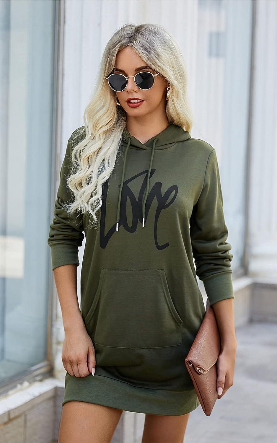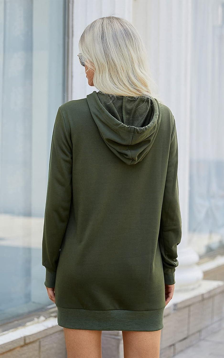 PRETTYGARDEN Women's Hooded Sweatshirt Fall Fashion Drawstring Lightweight Long Sleeve Pullover Hoodie Dress(Army Green)