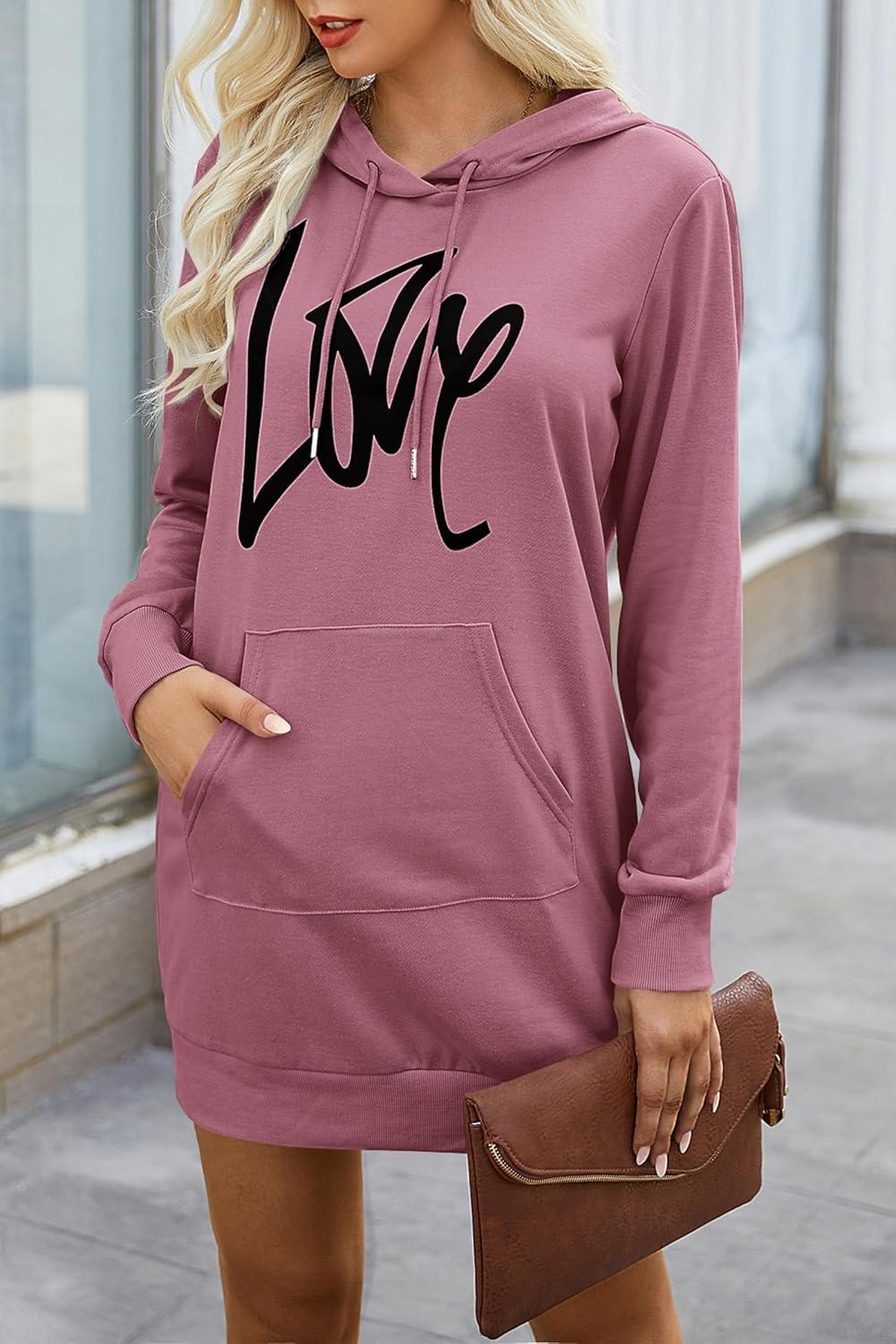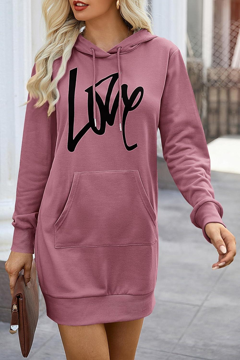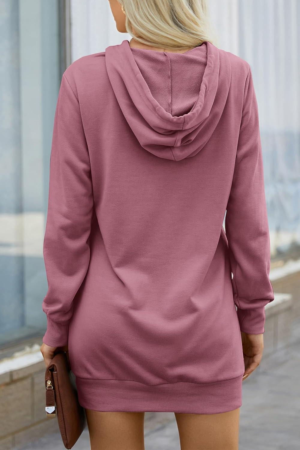 PRETTYGARDEN Women's Hooded Sweatshirt Fall Fashion Drawstring Lightweight Long Sleeve Pullover Hoodie Dress(Bean Paste Pink)