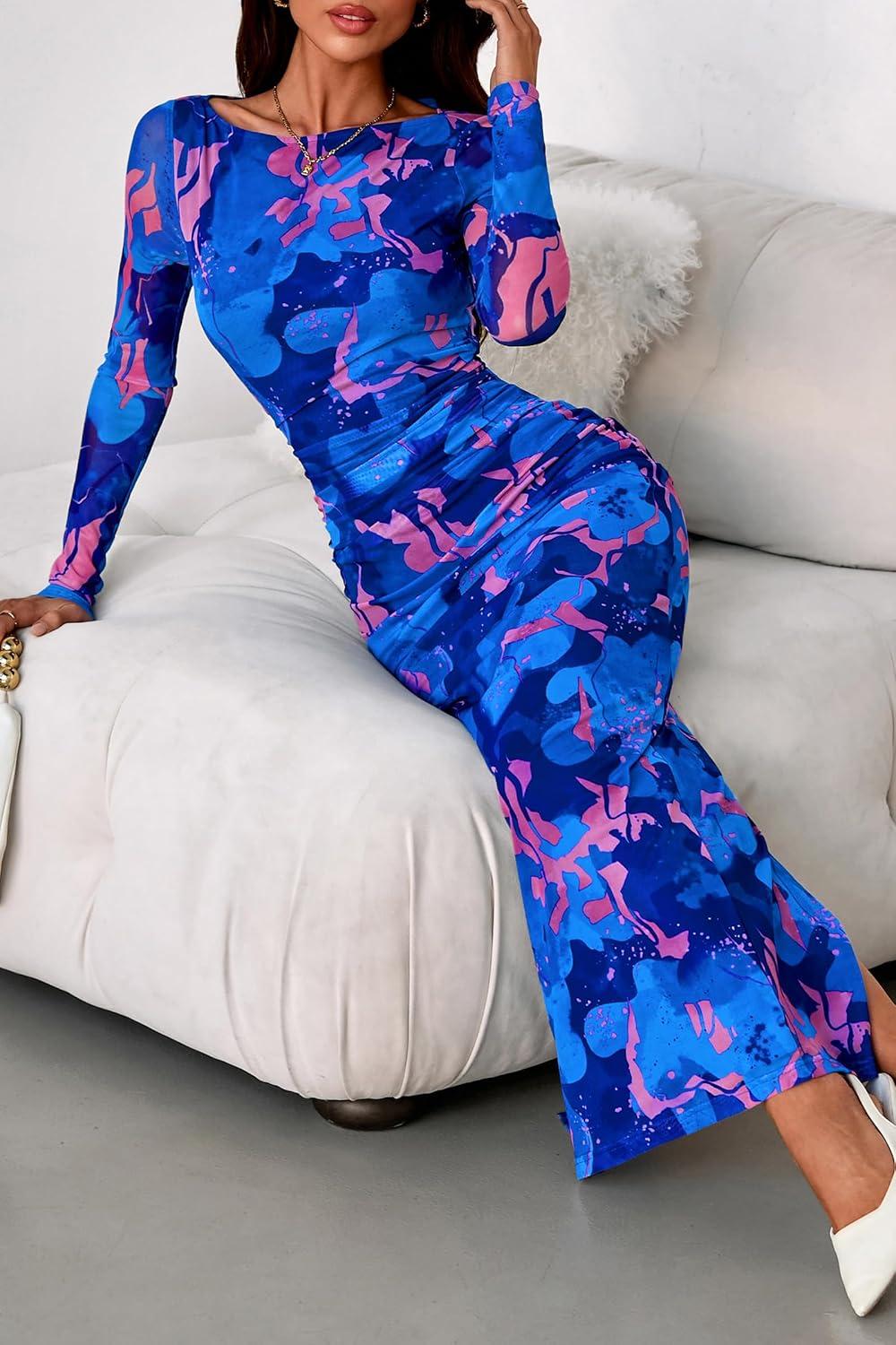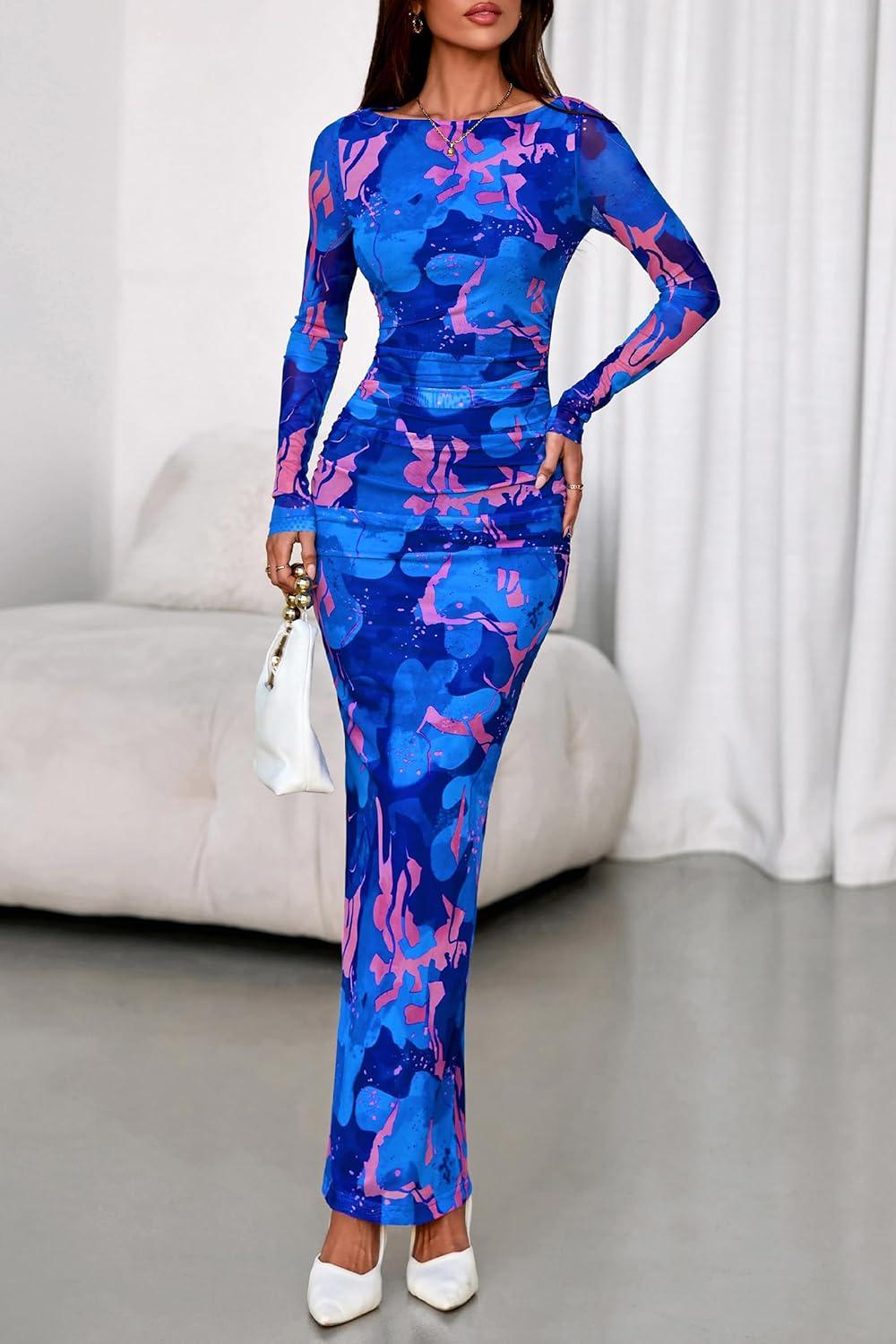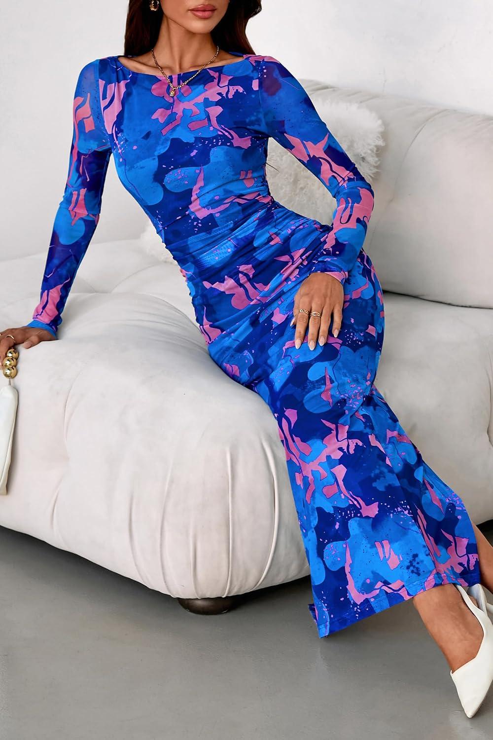 PRETTYGARDEN Women’s Long Sleeve Bodycon Dresses 2025 Fall Sexy Floral Mesh Slit Ruched Tight Maxi Wedding Guest Dress(Blue Pink Flower)