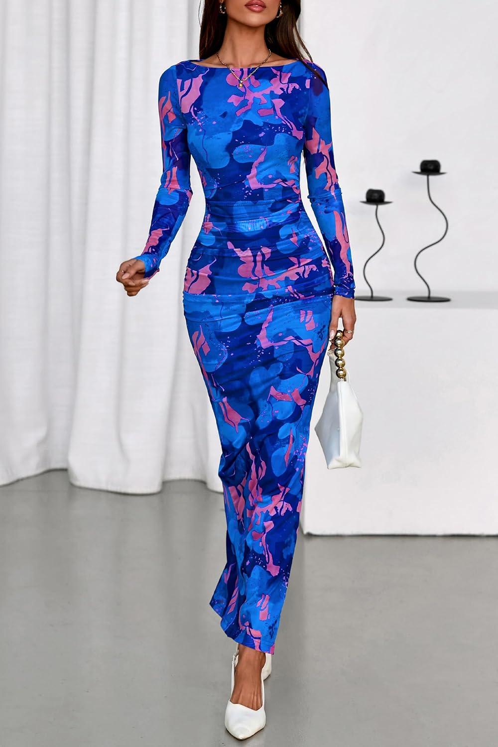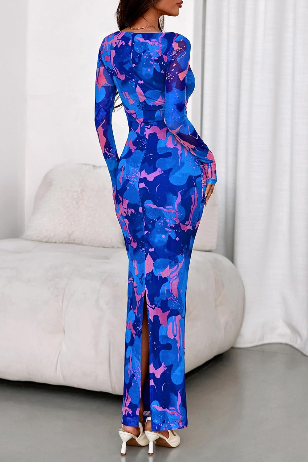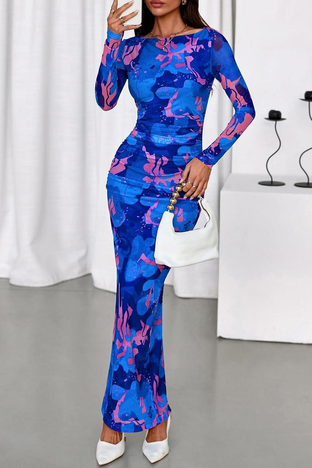 PRETTYGARDEN Women’s Long Sleeve Bodycon Dresses 2025 Fall Sexy Floral Mesh Slit Ruched Tight Maxi Wedding Guest Dress(Blue Pink Flower)